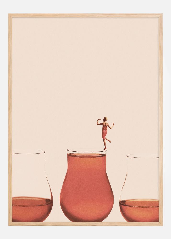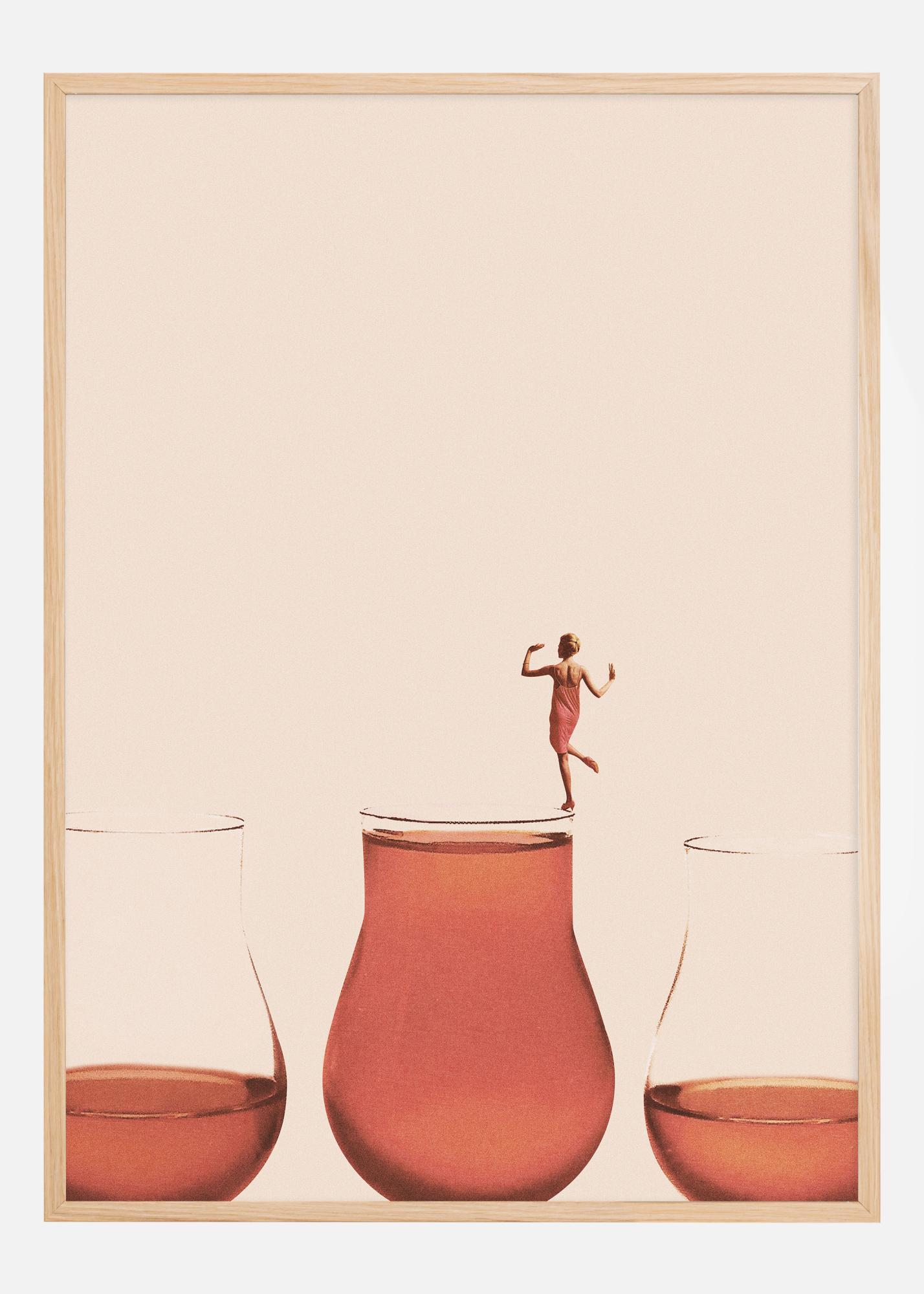 Ten wyrafinowany i estetycznie przyciągający plakat przedstawia kobiecą postać wykonującą delikatny akt równowagi na krawędzi przepełnionego kieliszka wina. Kobieta, ubrana w sukienkę, zdaje się tańczyć lub poruszać z szlachetną gracją, będąc obrazem kontroli i precyzji w czynności, która może wydawać się ryzykowna. Jej sylwetka wydaje się niemal metaforą subtelnego podejścia wymaganego do cieszenia się z wyrafinowanych aspektów życia, z zrównoważonym docenieniem pełni i pustki.