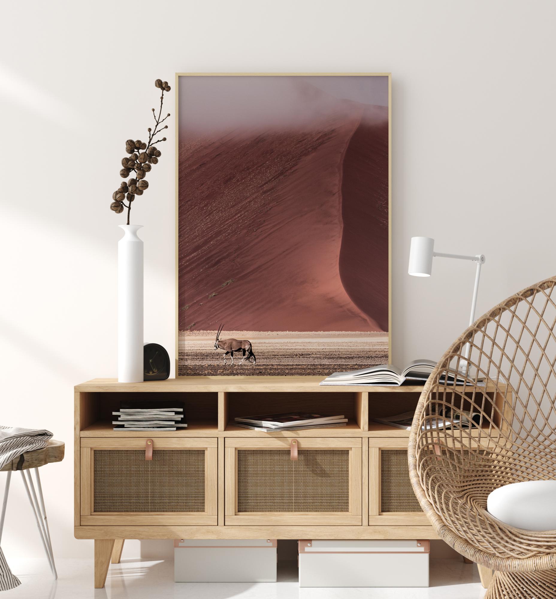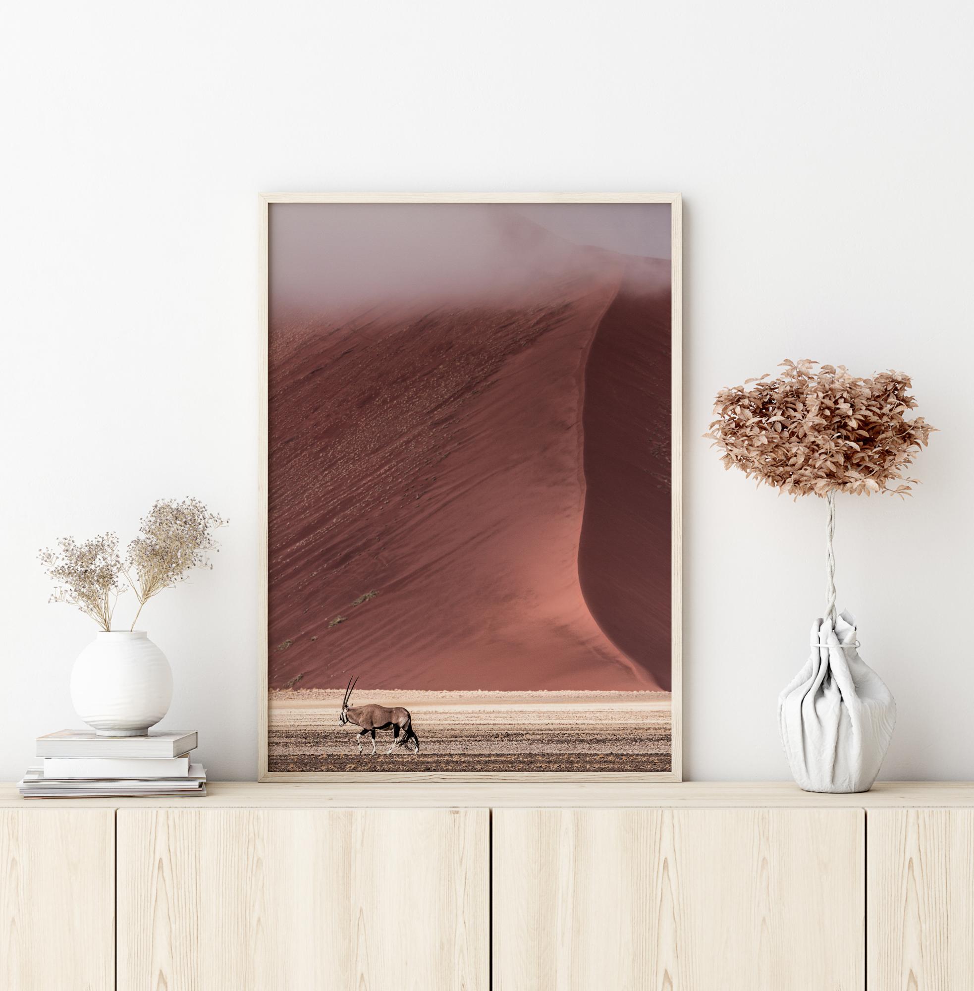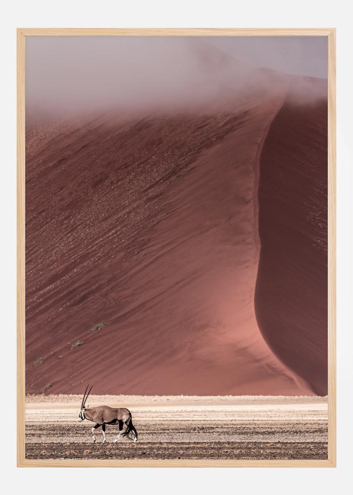 Prosty plakat zmęczonej gazeli przemierzającej pustynię. W tle imponująca czerwona wydma styka się z piaszczystą ziemią na dole zdjęcia. Piękne kolory blakną w pustynnej mgle. Na kremowym tle te uspokajające kolory tworzą piękną scenę przyrody.