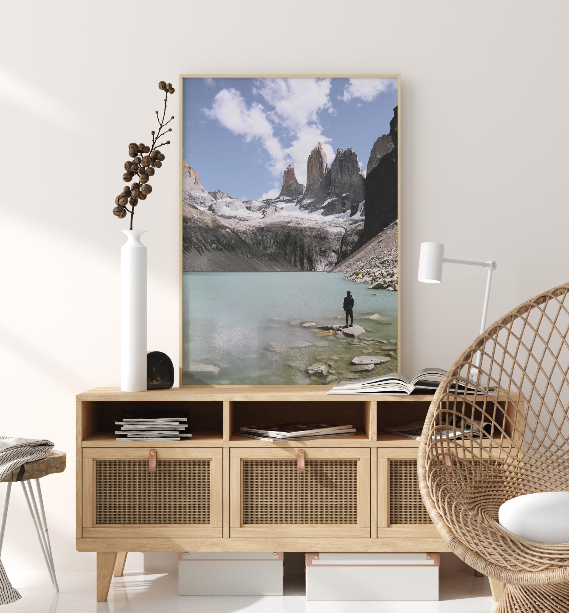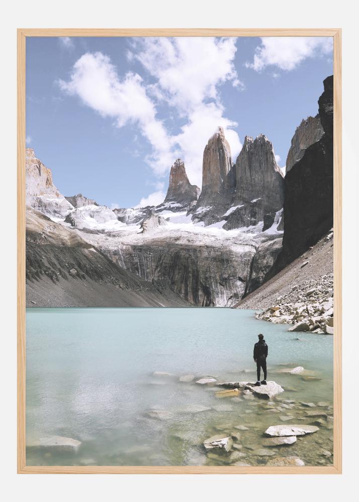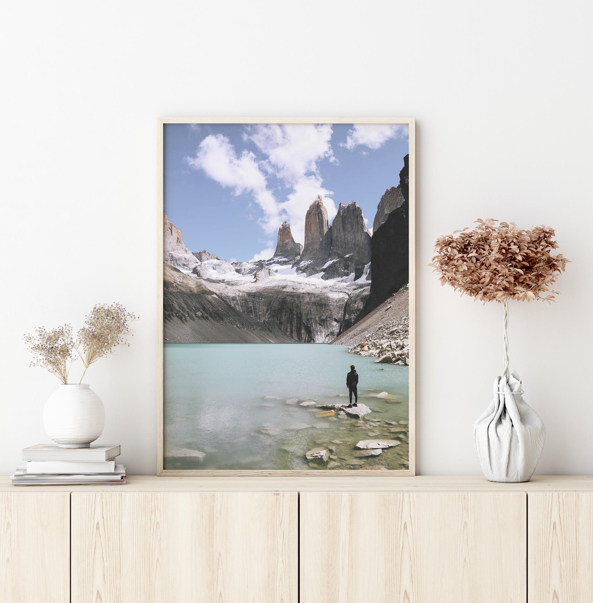 Plakat przyrodniczy z samotną postacią obserwującą zapierające dech w piersiach otoczenie. Stojąc na skale przy brzegu jeziora, imponujące, ośnieżone góry otaczają turkusowe jezioro. Można niemal poczuć chłodne powietrze z tego magicznego obrazu.