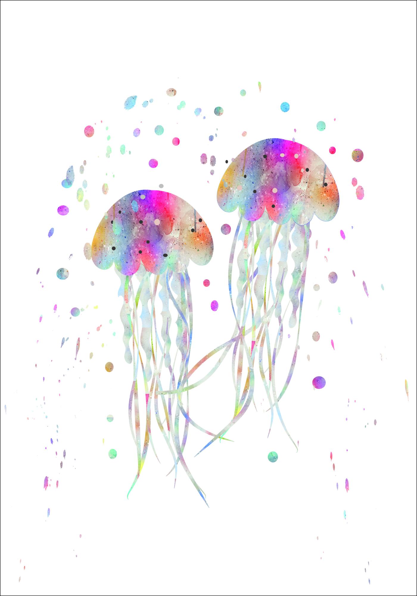 Wesoły i kreatywny nadruk dwóch małych, wielokolorowych meduz. Z ich kolorowymi dzwonami i mackami są otoczone kolorowymi, losowymi kropkami na białym tle. Uroczy plakat, który rozjaśni każde pomieszczenie.