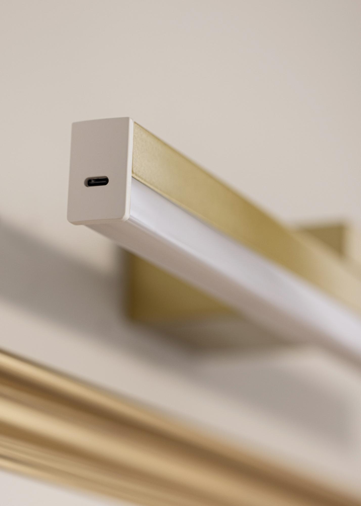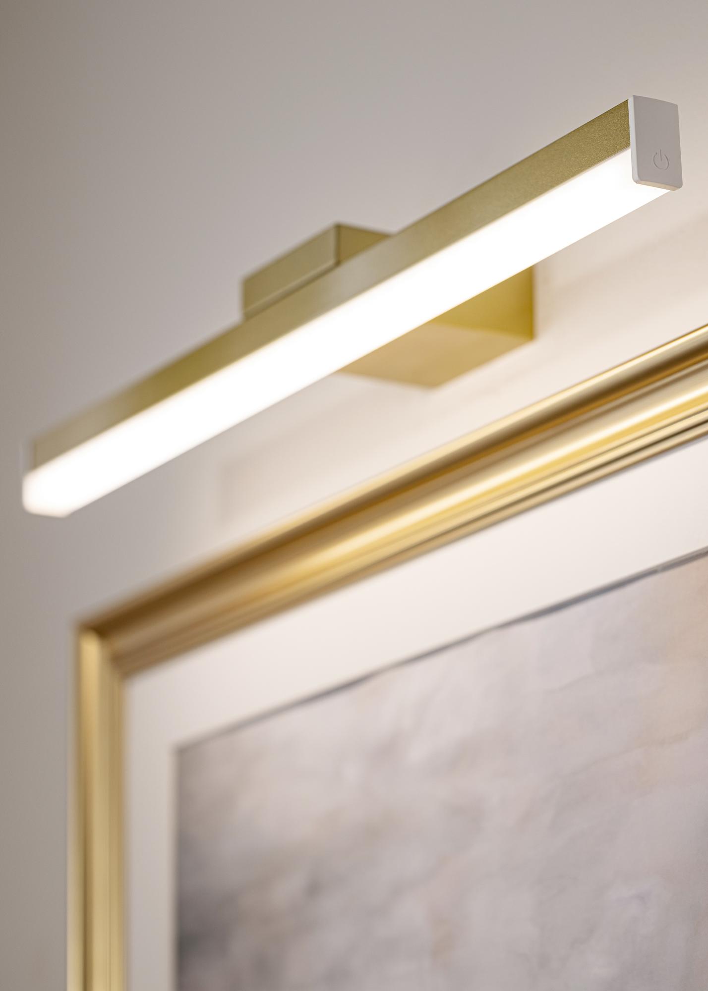 KAILA Glimmer to eleganckie i zasilane bateryjnie oświetlenie obrazów w kolorze złotym, zaprojektowane, aby stylowo podkreślić Twoje dzieła sztuki – całkowicie bez przewodów. Bezprzewodowa konstrukcja umożliwia łatwy montaż oświetlenia w dowolnym miejscu, bez konieczności uwzględniania gniazdek elektrycznych. Wyrafinowane złote wykończenie nadaje ekskluzywny charakter, podczas gdy zintegrowane światło tworzy równomierne i przyjemne oświetlenie. Łatwe w instalacji i użyciu – idealne rozwiązanie, aby zapewnić Twoim obrazom uwagę, na jaką zasługują.