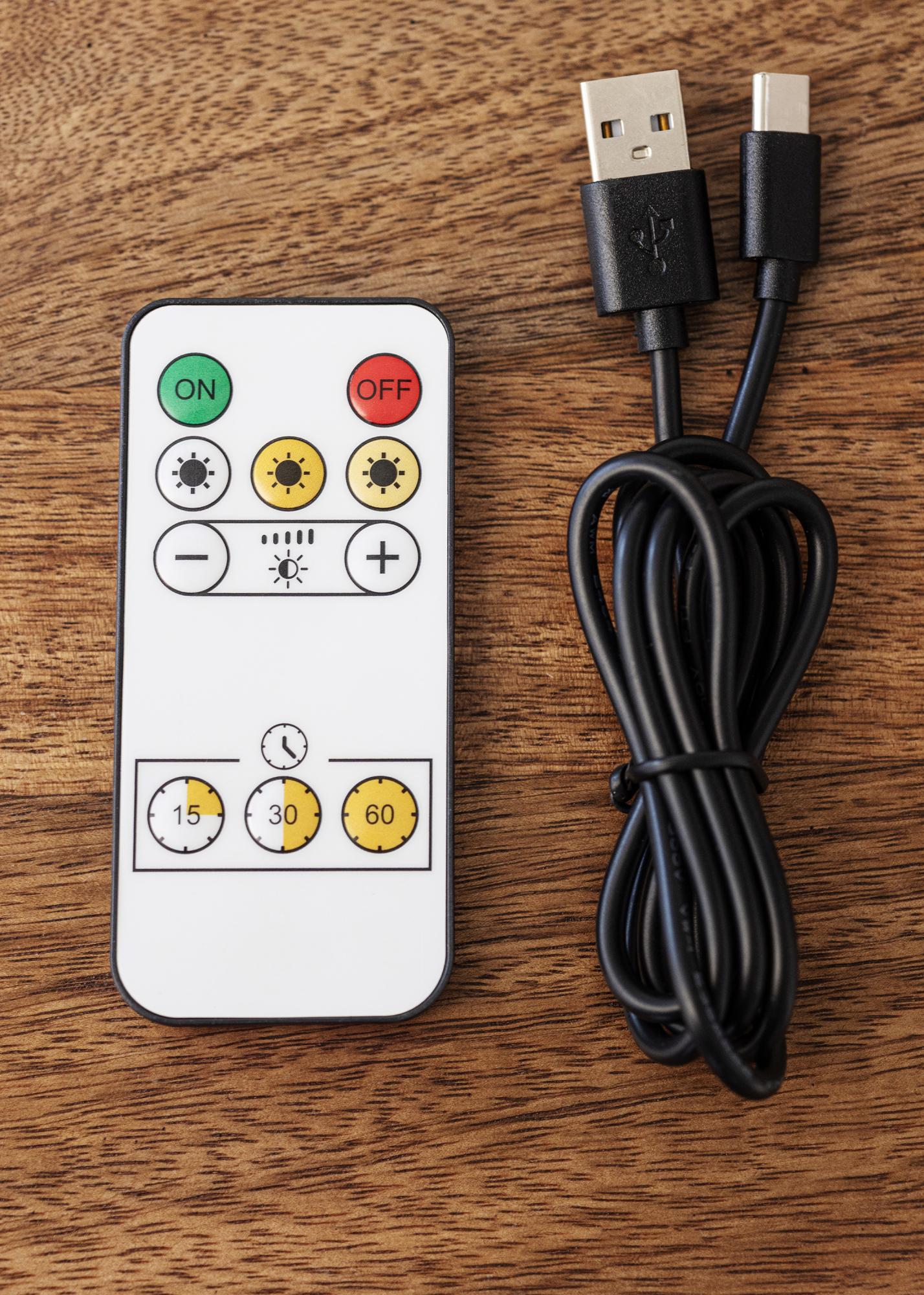 Matowe czarne wykończenie nadaje elegancki i nowoczesny wygląd, który wtapia się w większość wnętrz. Lampa jest sterowana za pomocą dołączonego pilota, co umożliwia łatwe dostosowanie jasności lub ustawienie timera do automatycznego wyłączania po 15, 30 lub 60 minutach. Jest to praktyczny sposób na optymalizację żywotności baterii.