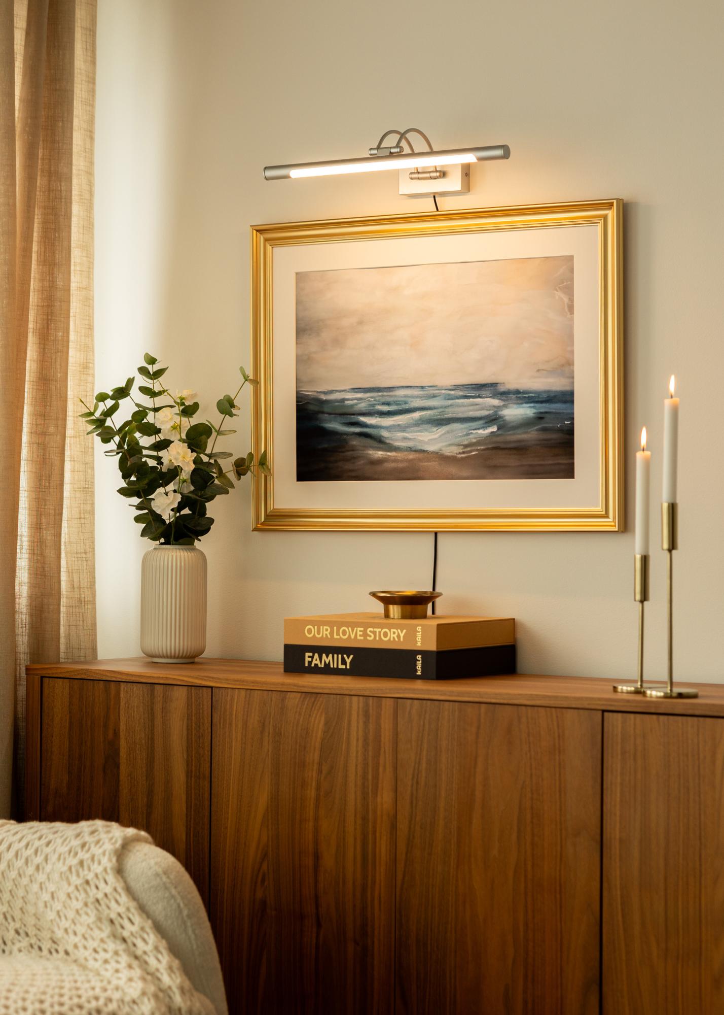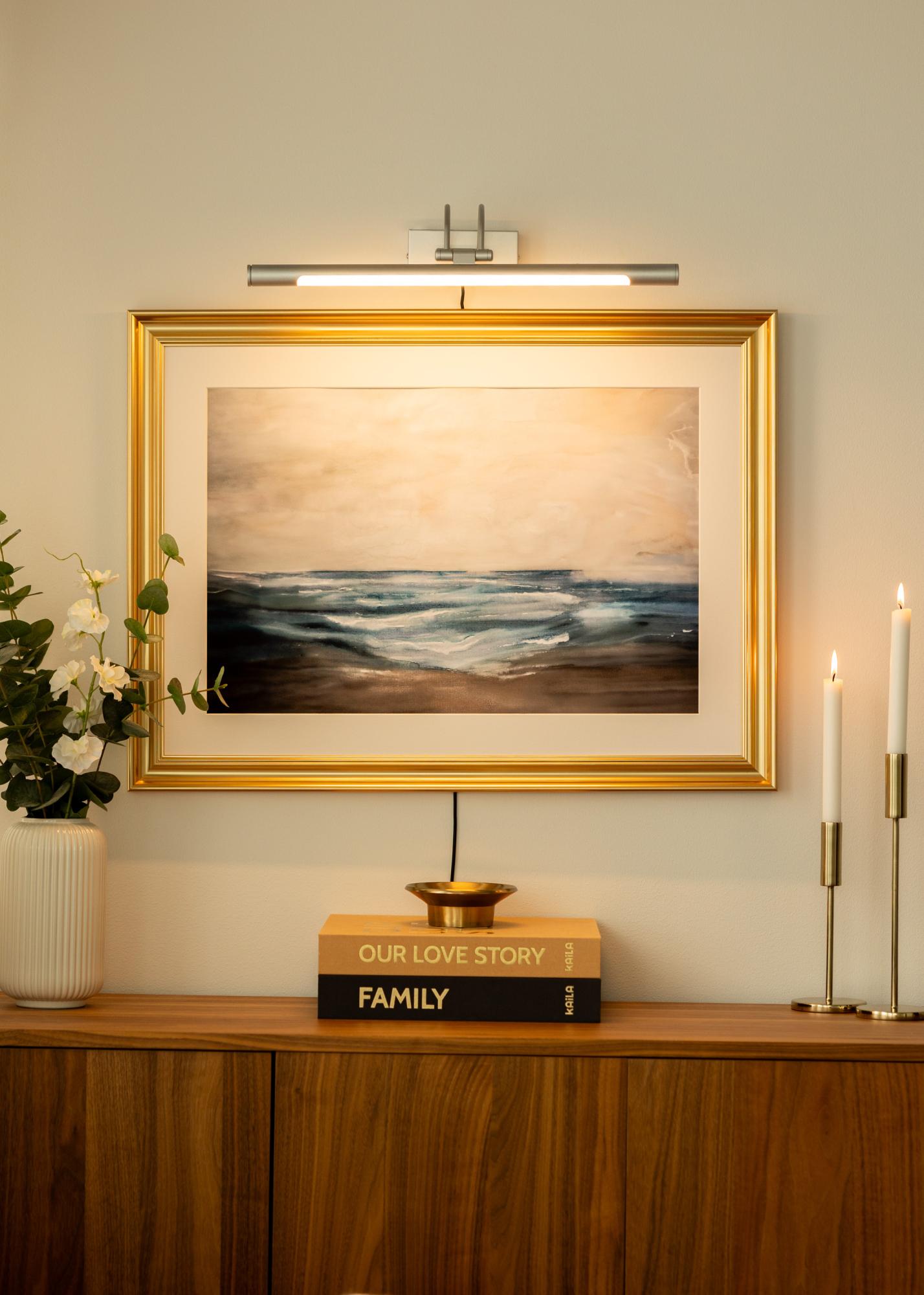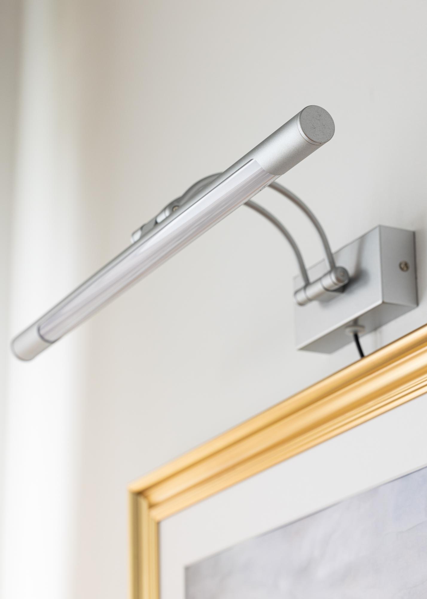 Eleganckie oświetlenie obrazów w srebrze, które dyskretnie podkreśla twoje dzieła sztuki. Dzięki swoim wymiarom 19 cm głębokości i 50 cm długości idealnie pasuje do obrazów o maksymalnej szerokości do 90 cm. Światło ma temperaturę barwową 3000K, co daje ciepłe, przyjazne światło, tworząc przyjemną atmosferę bez dominacji pomieszczenia.