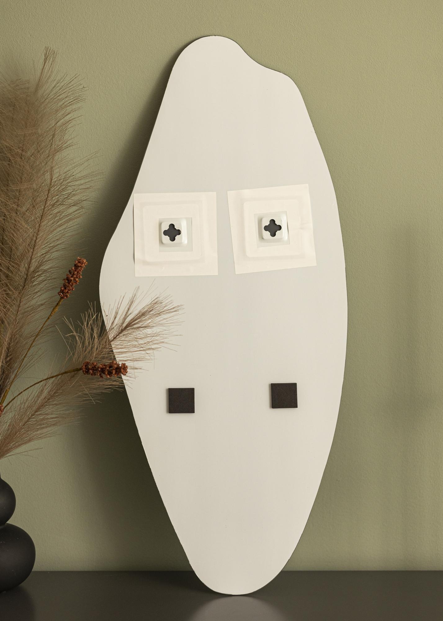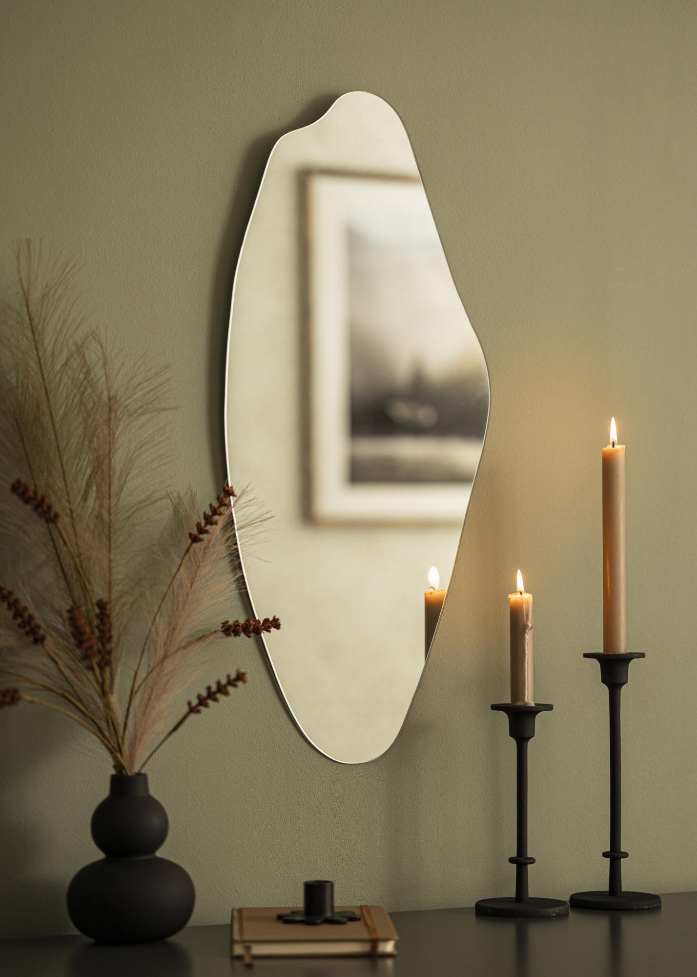 To jest podłużne lustro o pięknym asymetrycznym kształcie, które stanowi ciekawe urozmaicenie wnętrza i idealnie pasuje do nowoczesnego domu. Lustro posiada praktyczne uchwyty na tylnej stronie, dzięki czemu można je zawiesić na ścianie w dowolnym pomieszczeniu – nadaje się nawet do użycia w łazience!