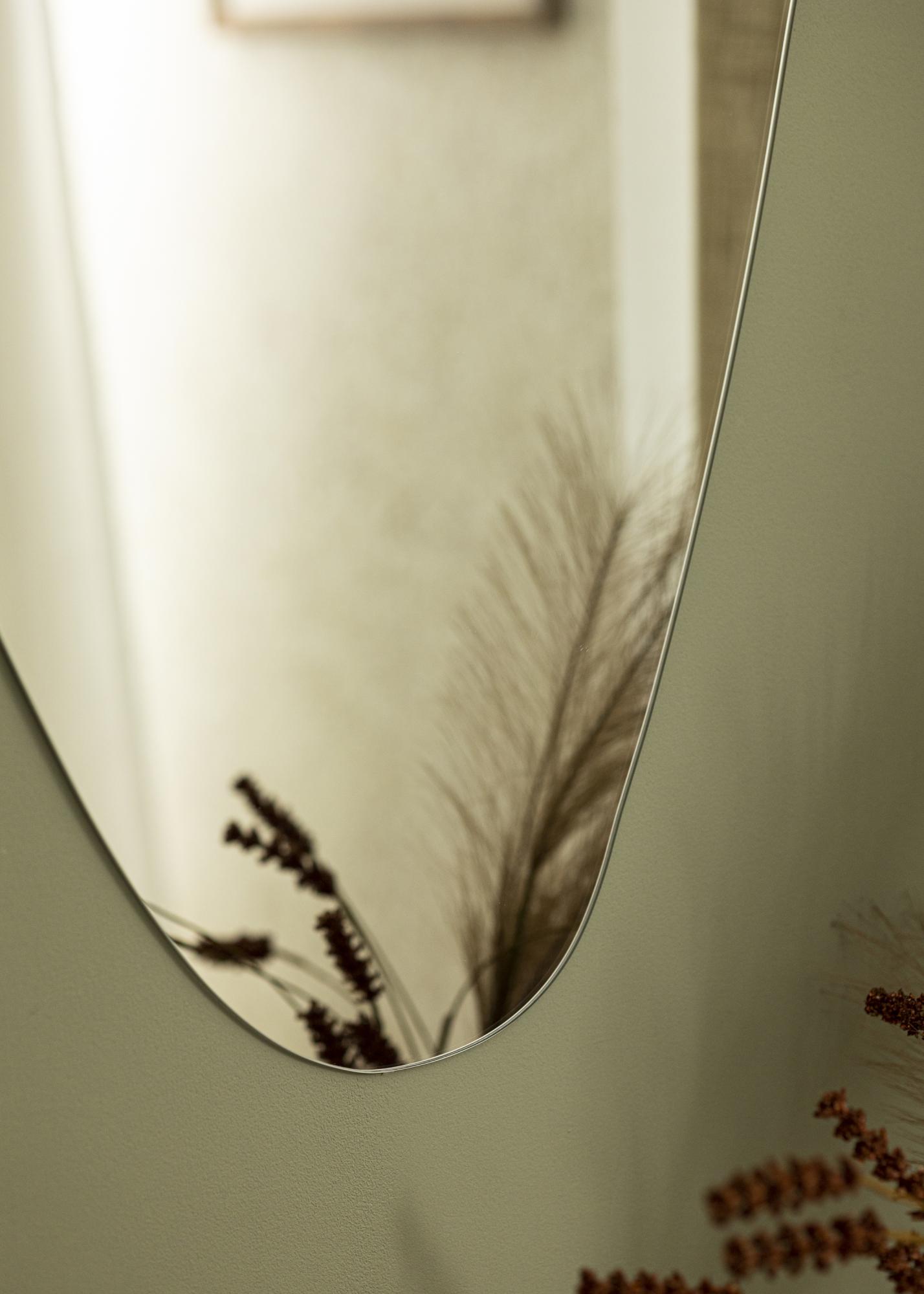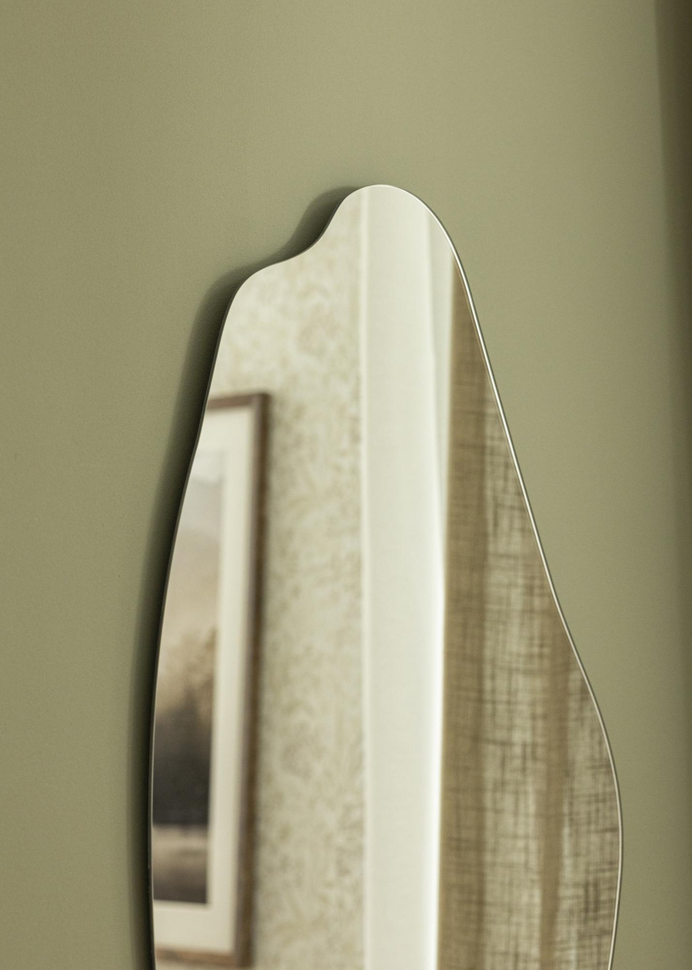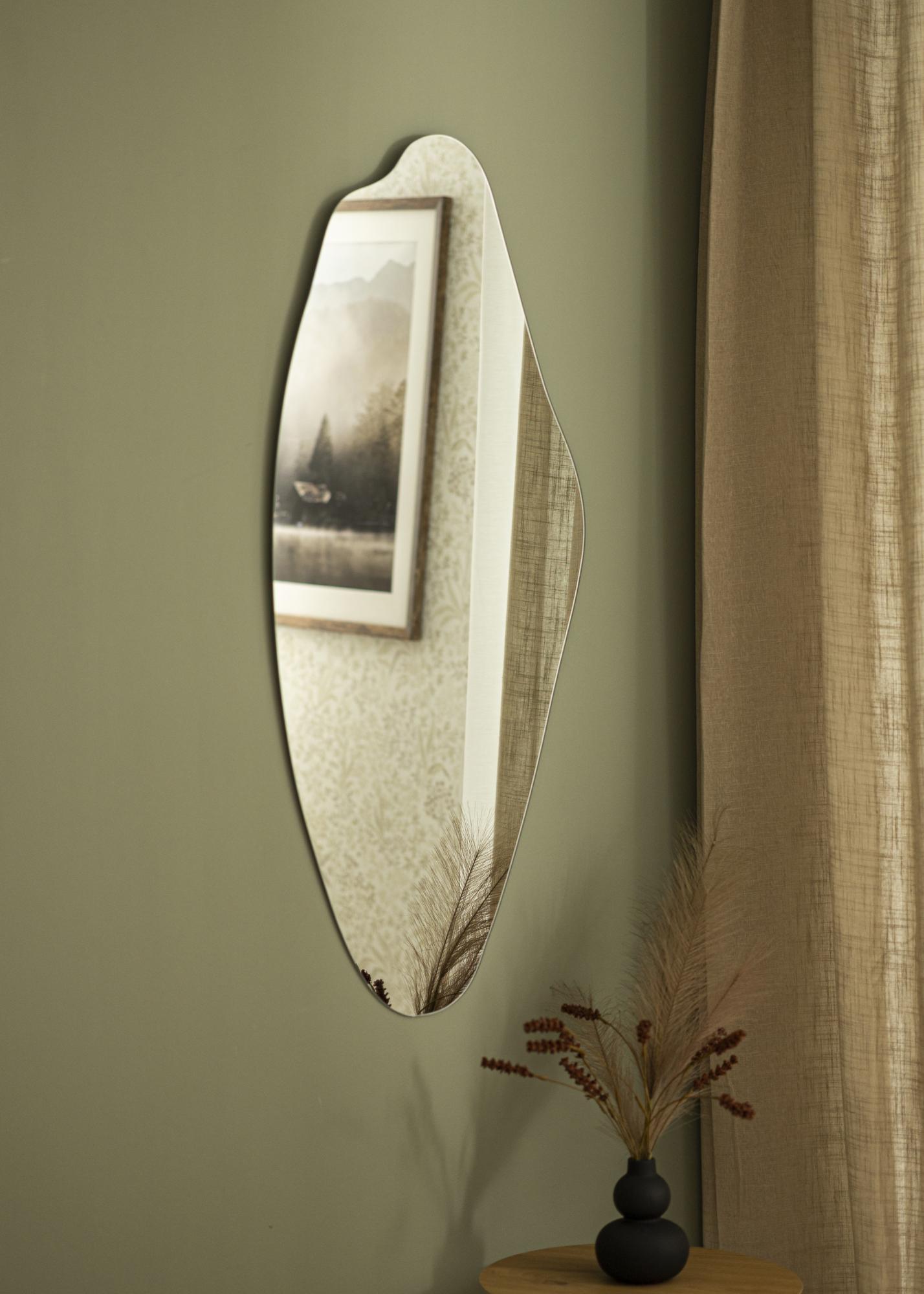 To jest podłużne lustro o pięknym asymetrycznym kształcie, co czyni je ekscytującym elementem dekoracyjnym, który doskonale pasuje do nowoczesnego domu. Lustro ma praktyczne uchwyty do mocowania na ścianie z tyłu i zawiesza się na ścianie w pomieszczeniu, które sobie życzysz – nadaje się nawet do użycia w łazience!