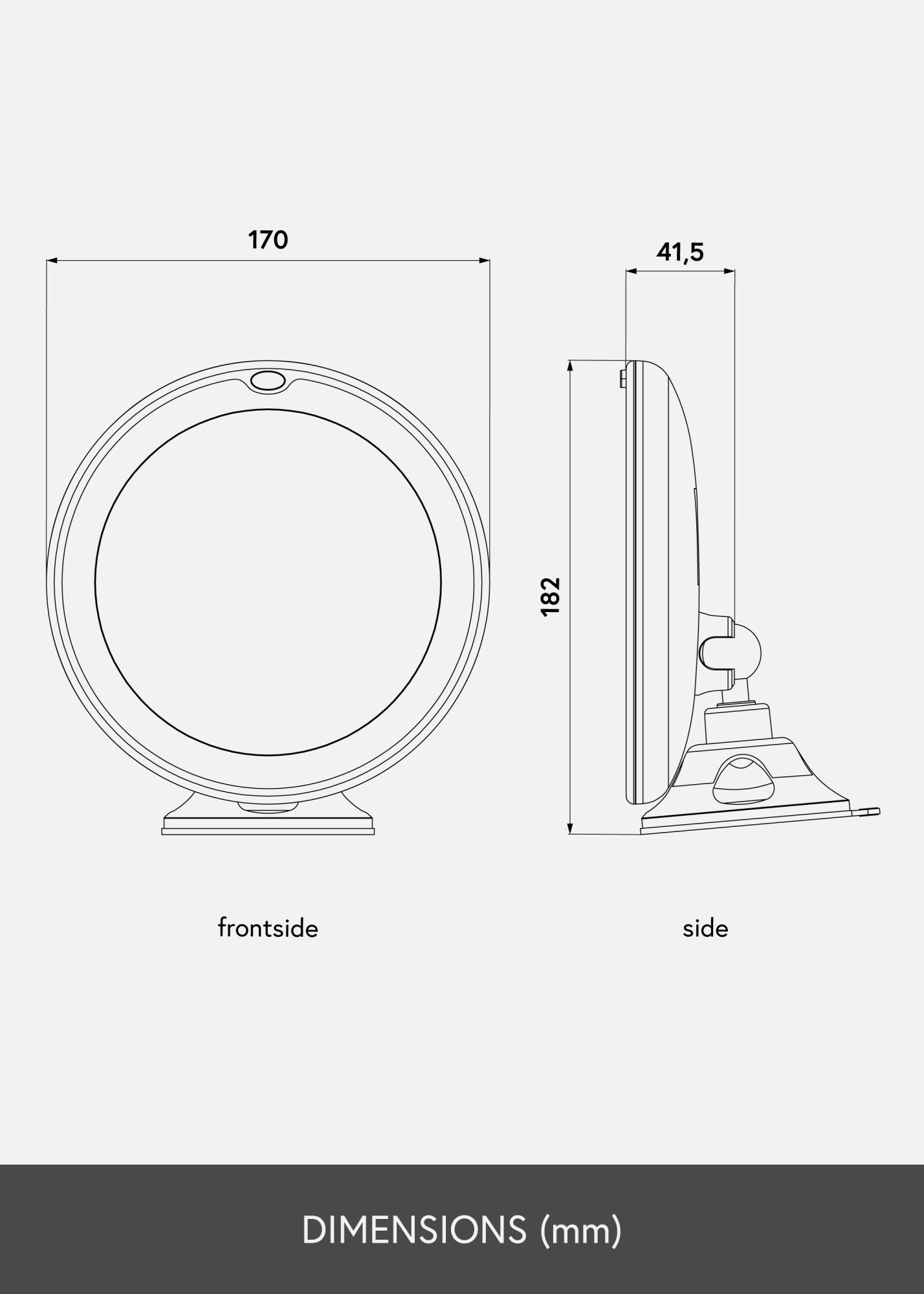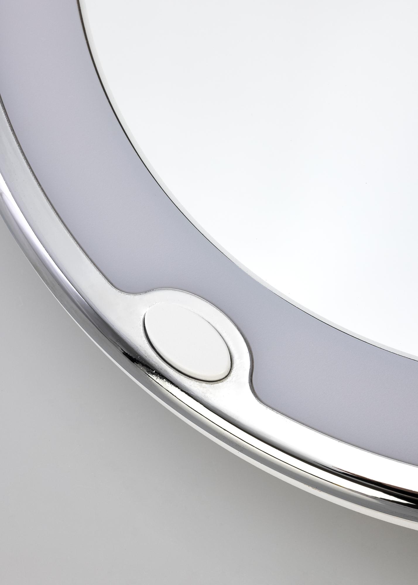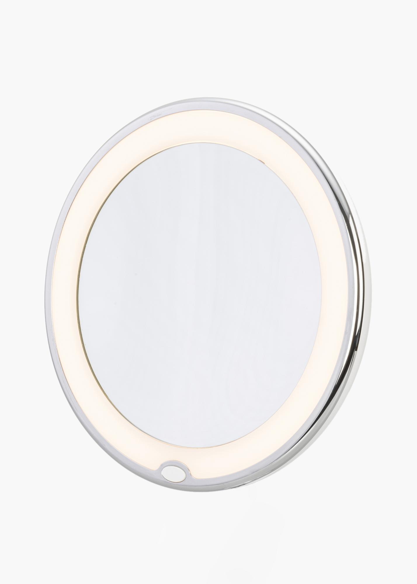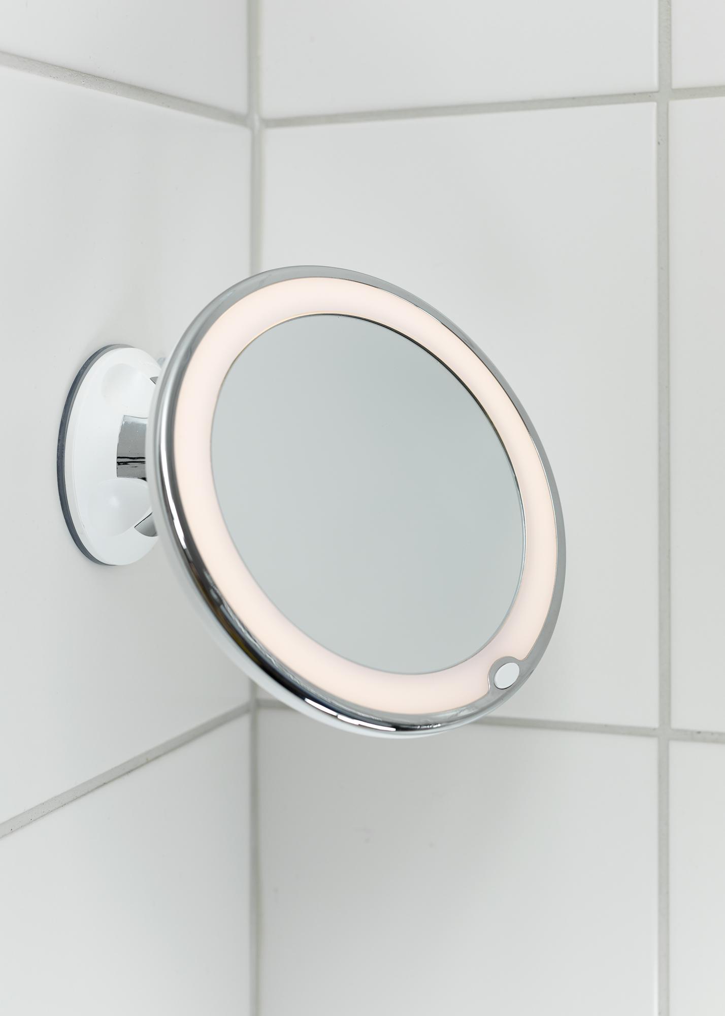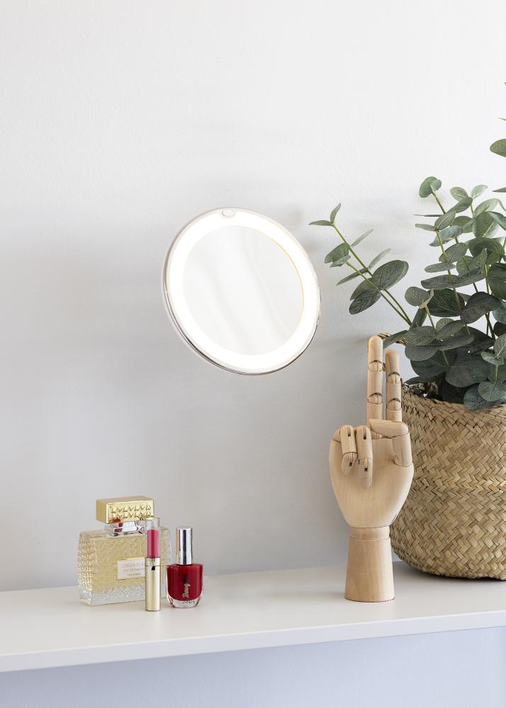 To jest klasyczne lustro łazienkowe od KAILA w praktycznym wykonaniu. Eleganckie lustro posiada zintegrowane oświetlenie LED, które otacza szkło lustrzane. Lustro łazienkowe ma średnicę 17 cm i powiększające szkło z 5-krotnym zoomem. Innymi słowy, to lustro jest doskonałe do uzyskania wyraźnego zbliżenia twojej twarzy! Lustro jest dekoracyjne jako element wystroju, ale jego praktyczny design sprawia, że lustro można łatwo schować, gdy nie jest używane. Lustro mocowane jest przy pomocy dołączonej przyssawki na ścianie, kafelku lub stole. Przyssawka jest blokowana, co sprawia, że lustro jest stabilne. Dostarczane w stanie rozmontowanym.