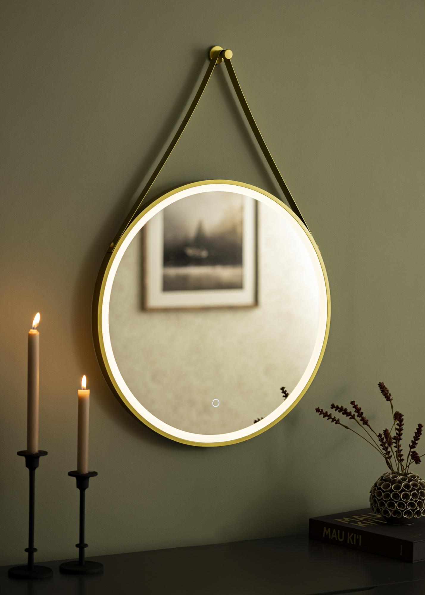 To jest lustro łazienkowe dla ciebie, jeśli chcesz mieć unikalne lustro, które nadaje luksusu twojej łazience. Posiada nowoczesny design o okrągłym kształcie, złotej ramie i złotym zawieszeniu ściennym. Aby lustro stabilnie wisiało, montuje się je w uchwytach ściennych z tyłu, jak również na górnym zawieszeniu ściennym. Lustro jest przeznaczone do stałej instalacji i podłącza się do włącznika. Aby lustro działało poprawnie, należy je podłączyć do standardowego włącznika, a nie ściemniającego.