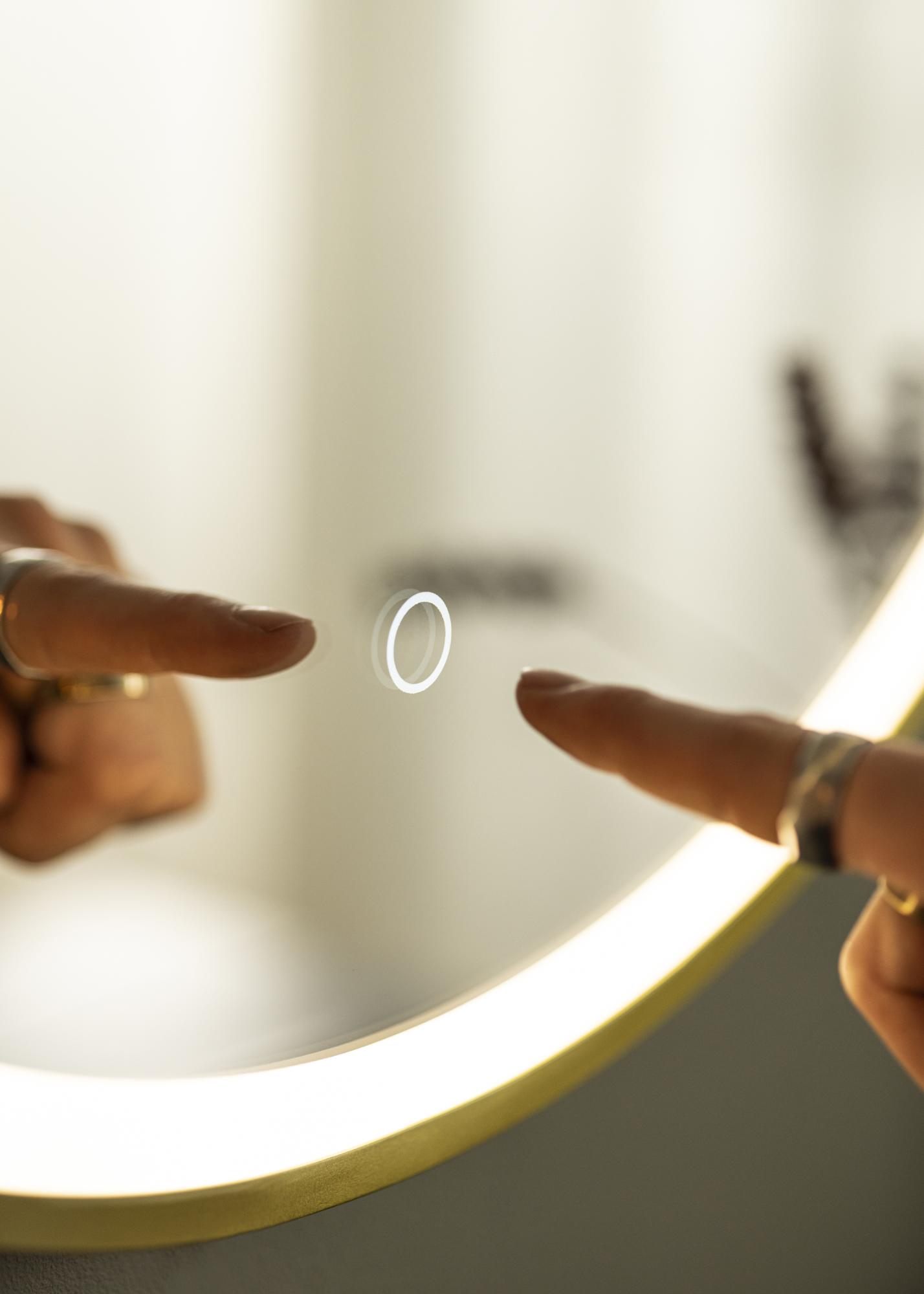 To lustro łazienkowe ma wbudowaną taśmę LED, która zapewnia dobre oświetlenie podczas przygotowań do dnia. Oświetlenie emituje światło o temperaturze 3000K, które jest ściemniane dla twojej wygody. Aby przyciemnić światło do pożądanej jasności, przytrzymaj przycisk dotykowy na dolnej części powierzchni lustra. Możesz wtedy wybrać ustawienie jasności taśmy LED od 10% do 100%.