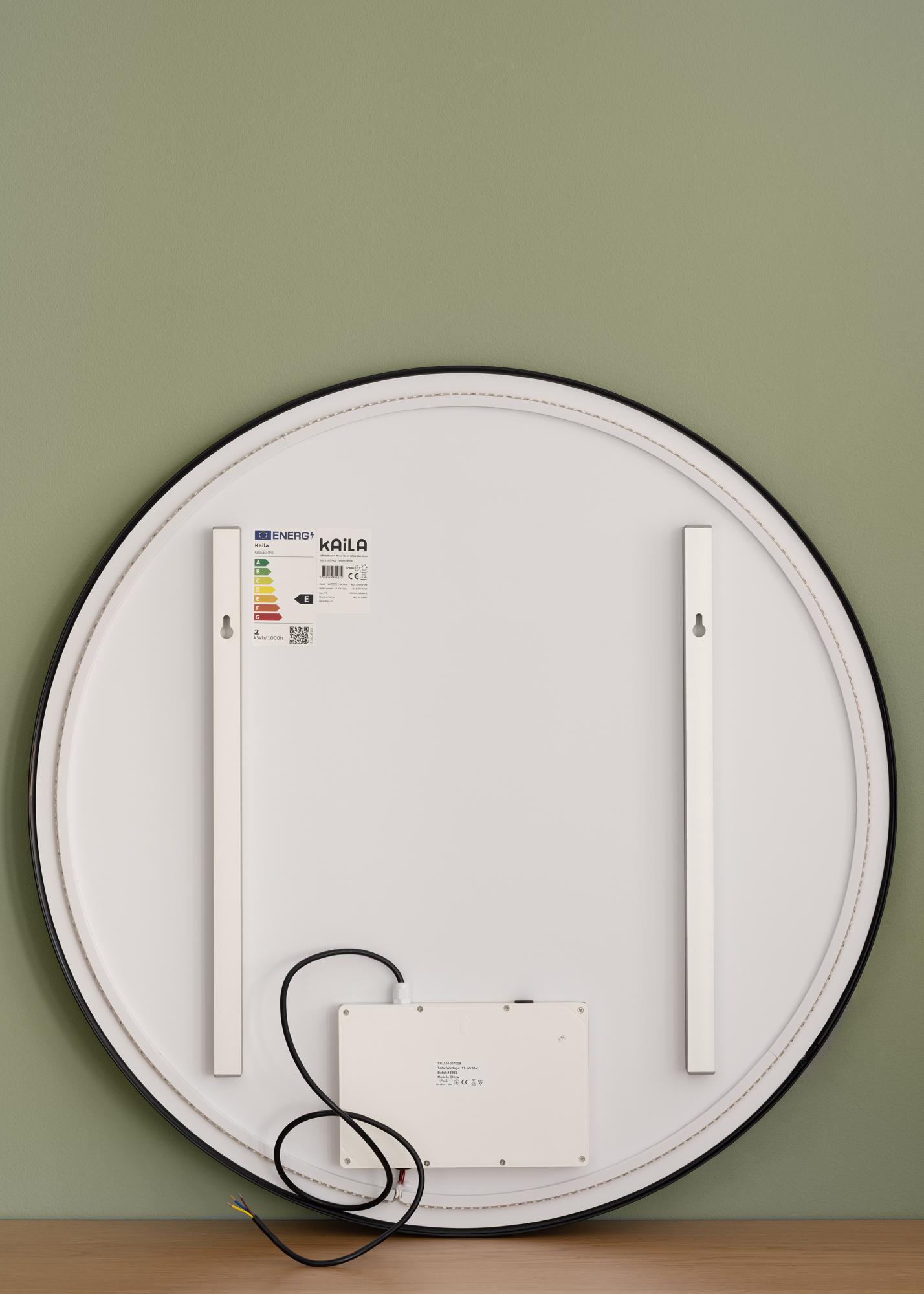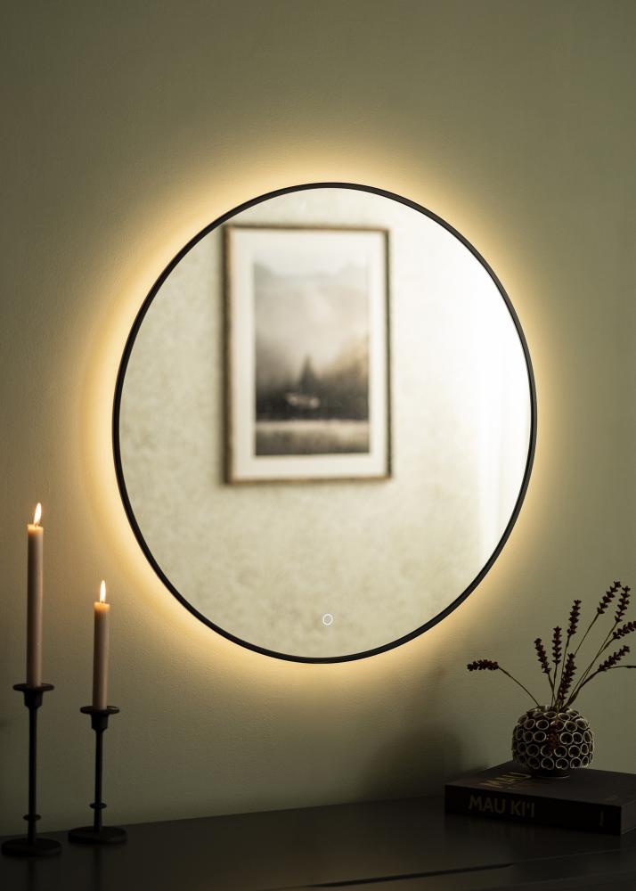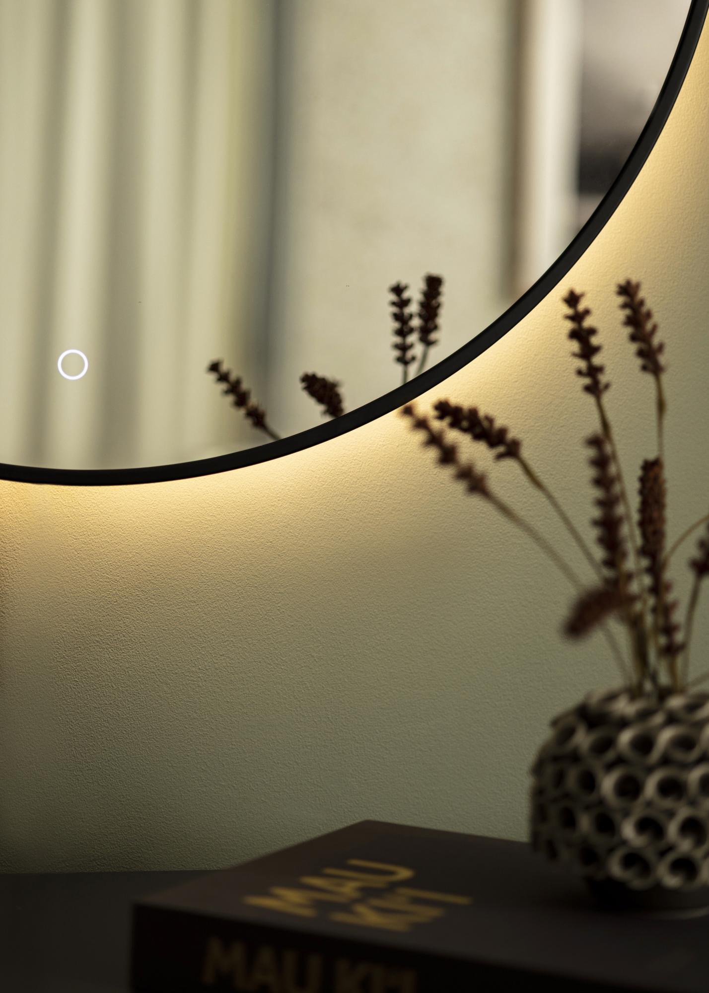 To jest stylowe lustro z oświetleniem LED, które jest równie eleganckie w holu, jak i w łazience. Lustro ma klasyczny okrągły kształt i metalową ramę w wyrafinowanym czarnym kolorze. Zintegrowane oświetlenie LED lustra o barwie 3000K można ściemniać od 10% do 100% jasności. Dzięki temu łatwo można ustawić oświetlenie na preferowaną jasność i zmienić je, jeśli twoje potrzeby się zmienią. Aby ściemnić światło, przytrzymaj przycisk dotykowy na dolnej części powierzchni lustra przez kilka sekund. Oświetlenie LED jest umieszczone z tyłu lustra, co nadaje światłu łagodniejszy wygląd.