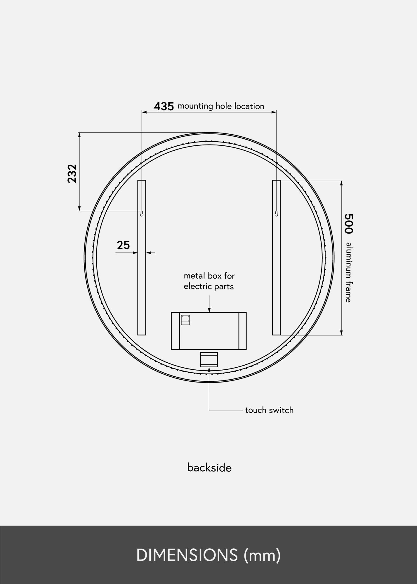 Lustro ścienne ma powierzchnię lustrzaną o średnicy 78,5 cm. Jest przeznaczone do stałej instalacji i podłącza się je do przełącznika. Aby lustro działało prawidłowo, powinno być podłączone do zwykłego przełącznika, a nie do ściemniacza.