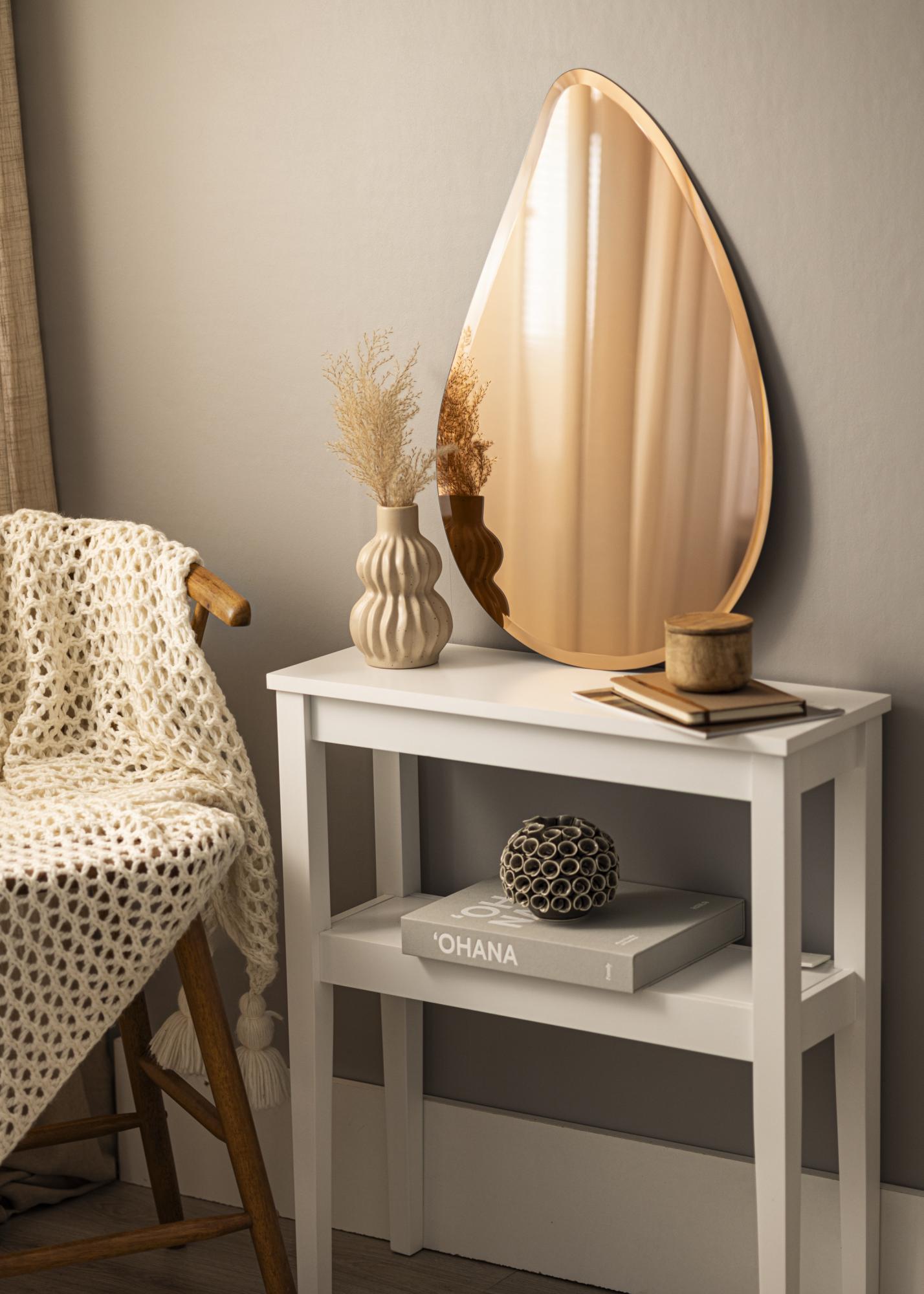 To urocze lustro ma kształt kropli, co nadaje mu miękki i elegancki wygląd. Lustro jest dodatkowo wyposażone w fazowaną krawędź – coś, co również wzmacnia ekskluzywne odczucie. Jednak tym, co może najbardziej czyni to lustro naprawdę modnym elementem wystroju wnętrza, jest efektowne i nowoczesne szkło lustrzane w odcieniu różowego złota!