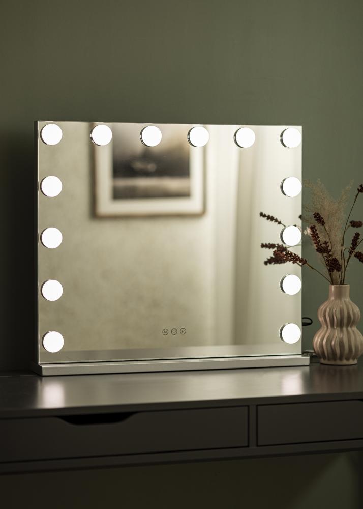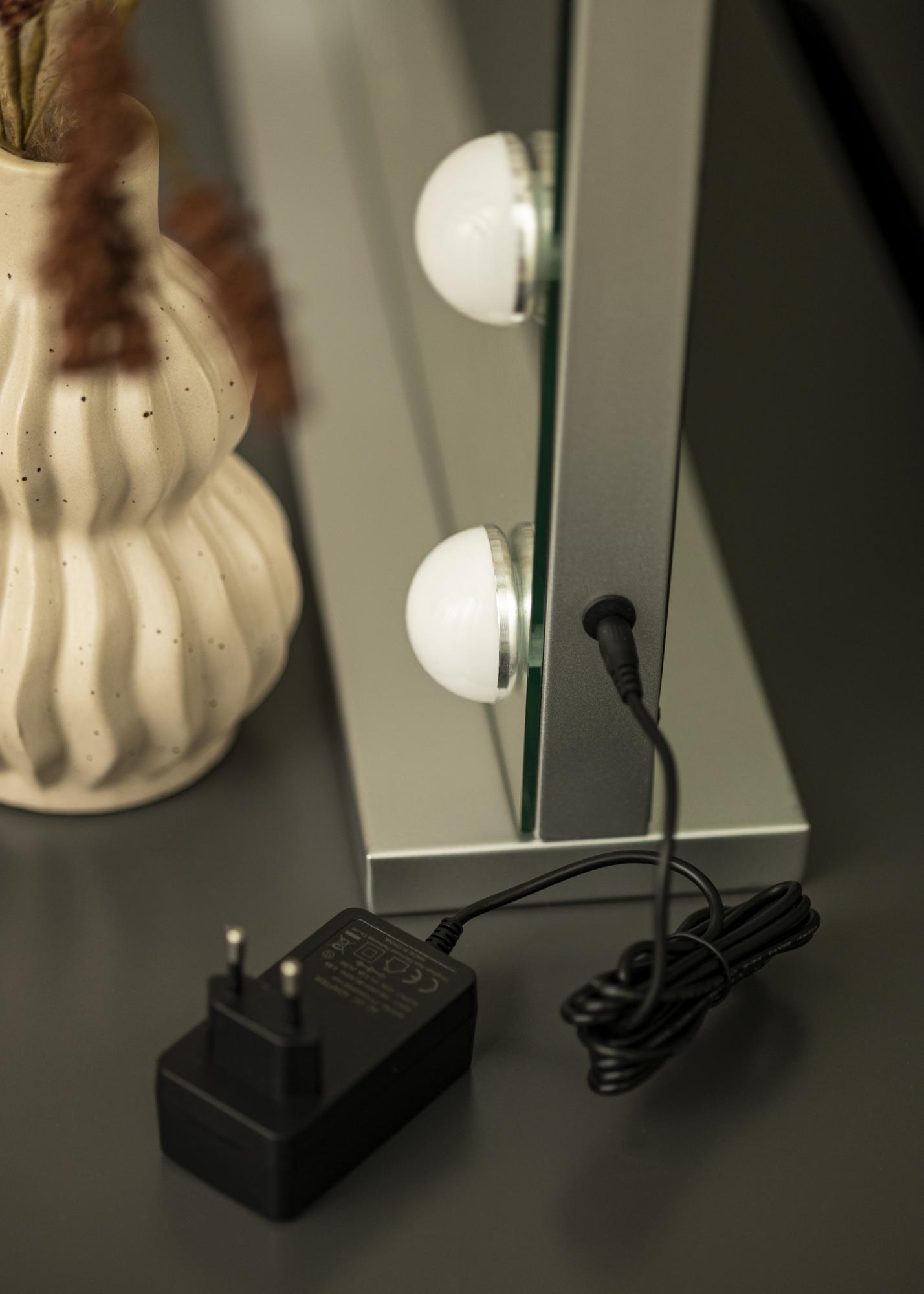 Dzięki temu lusterku do makijażu otrzymasz więcej splendoru w swoim domu, dzięki luksusowemu projektowi z 14 dużymi lampami LED, które tworzą ramę wokół powierzchni lustra. Srebrny odcień i prostokątny kształt dodatkowo wzmocnią ten stylowy wygląd. Lustro można montować na ścianie lub ustawić jako dekorację na komodach i stolikach bocznych. Lustro podłącza się do gniazdka elektrycznego.
