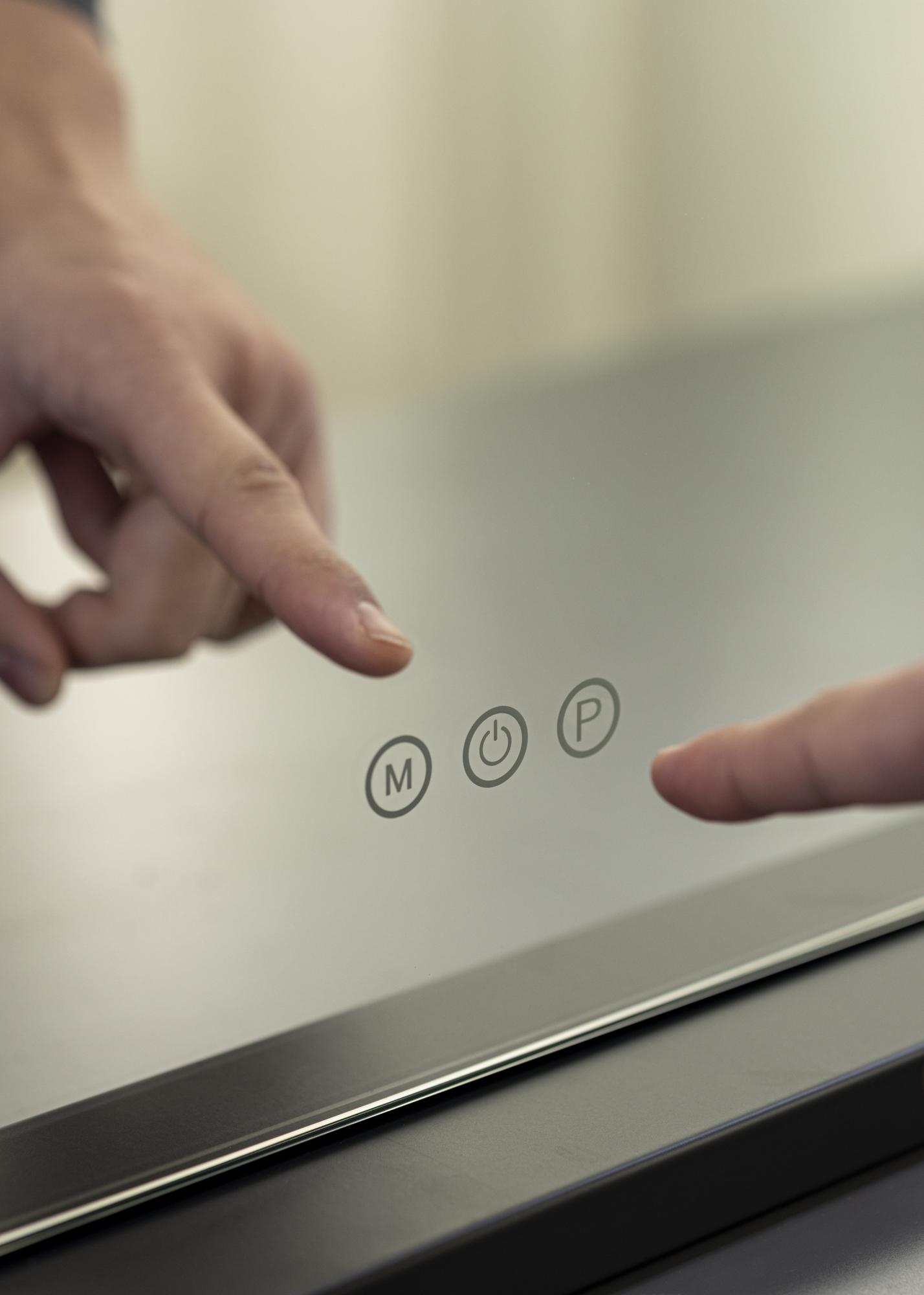 Oświetlenie tego lustra jest regulowane i ma temperaturę barwową 3000K-6000K. Można łatwo dostosować oświetlenie do swoich preferencji za pomocą przycisków dotykowych na powierzchni lustra. Przytrzymując przycisk "P", można ściemnić światło, a za pomocą przycisku "M" ustawić, czy chcesz mieć światło ciepłe, chłodne, czy naturalne. Jest również przycisk włączania/wyłączania, którego można użyć do uruchomienia lub wyłączenia oświetlenia lustra.