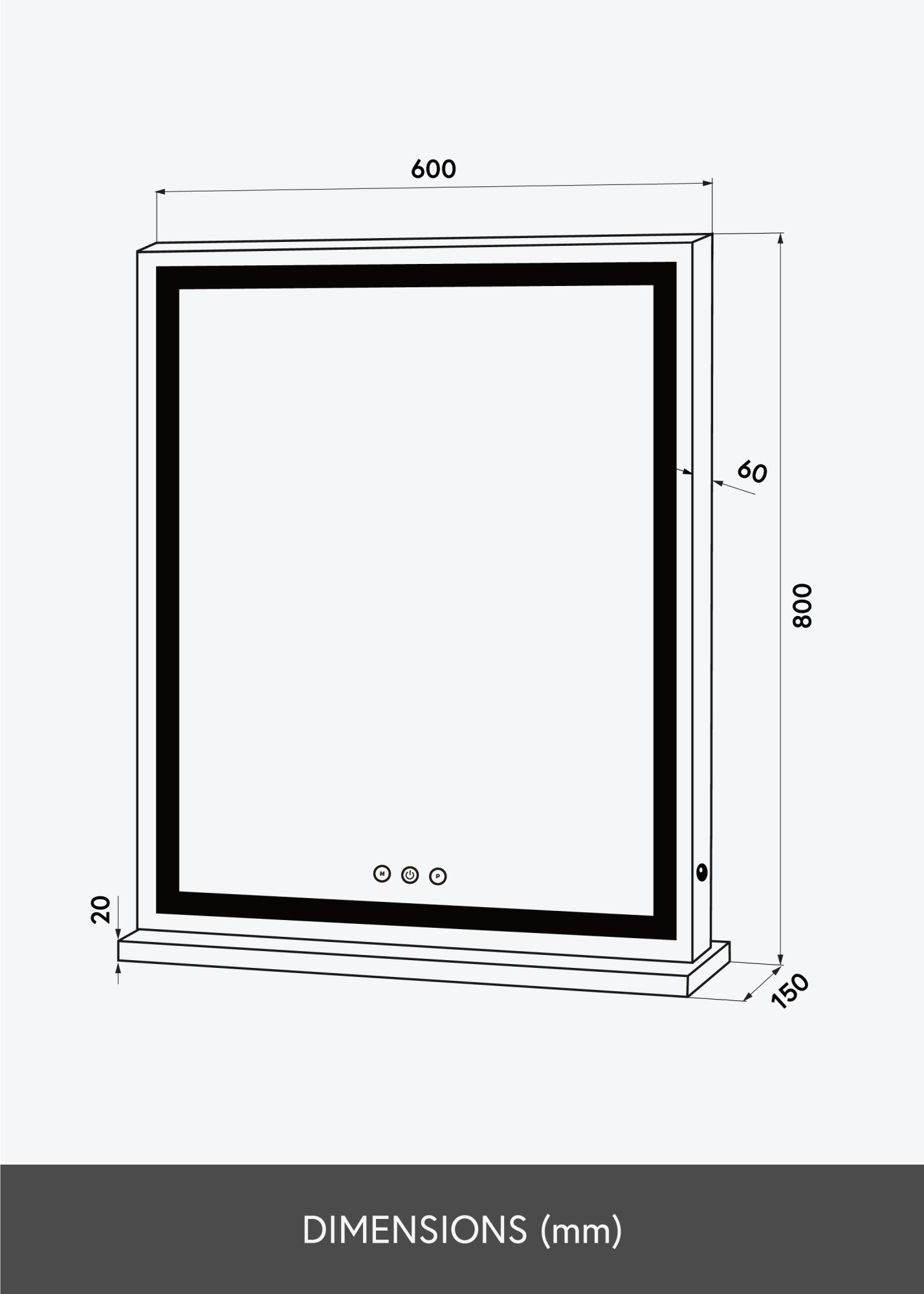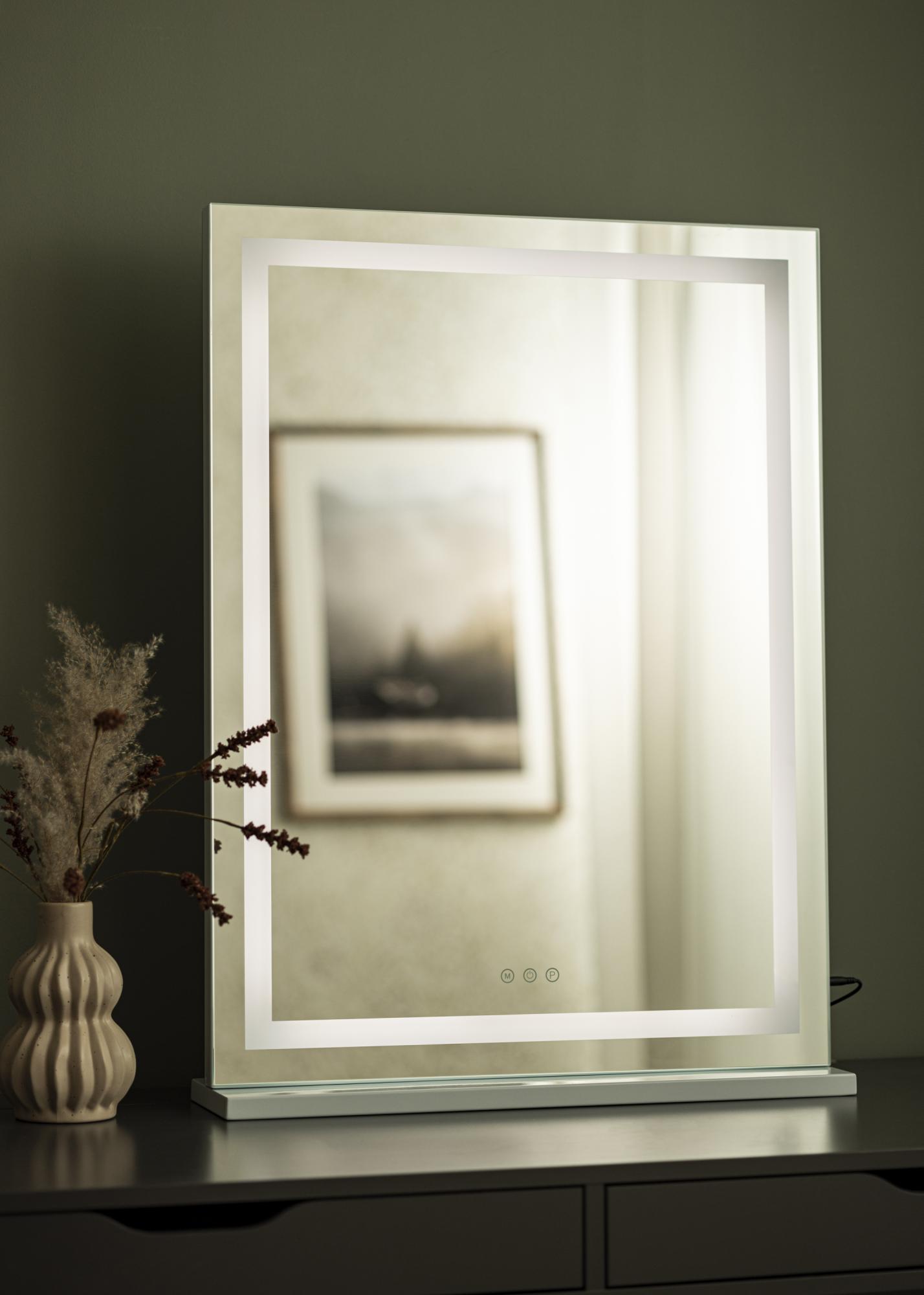 To lustro do makijażu jest idealnym połączeniem minimalizmu i nowoczesności. Posiada klasyczny kształt oraz nowoczesną taśmę LED, która tworzy ramę wokół powierzchni lustra o wymiarach 80x60 cm. Lustro wyposażone jest w podstawę, którą można zdemontować, dzięki czemu możesz sam zdecydować, czy chcesz umieścić lustro na stole, czy powiesić na ścianie. Montaż odbywa się w pozycji pionowej.