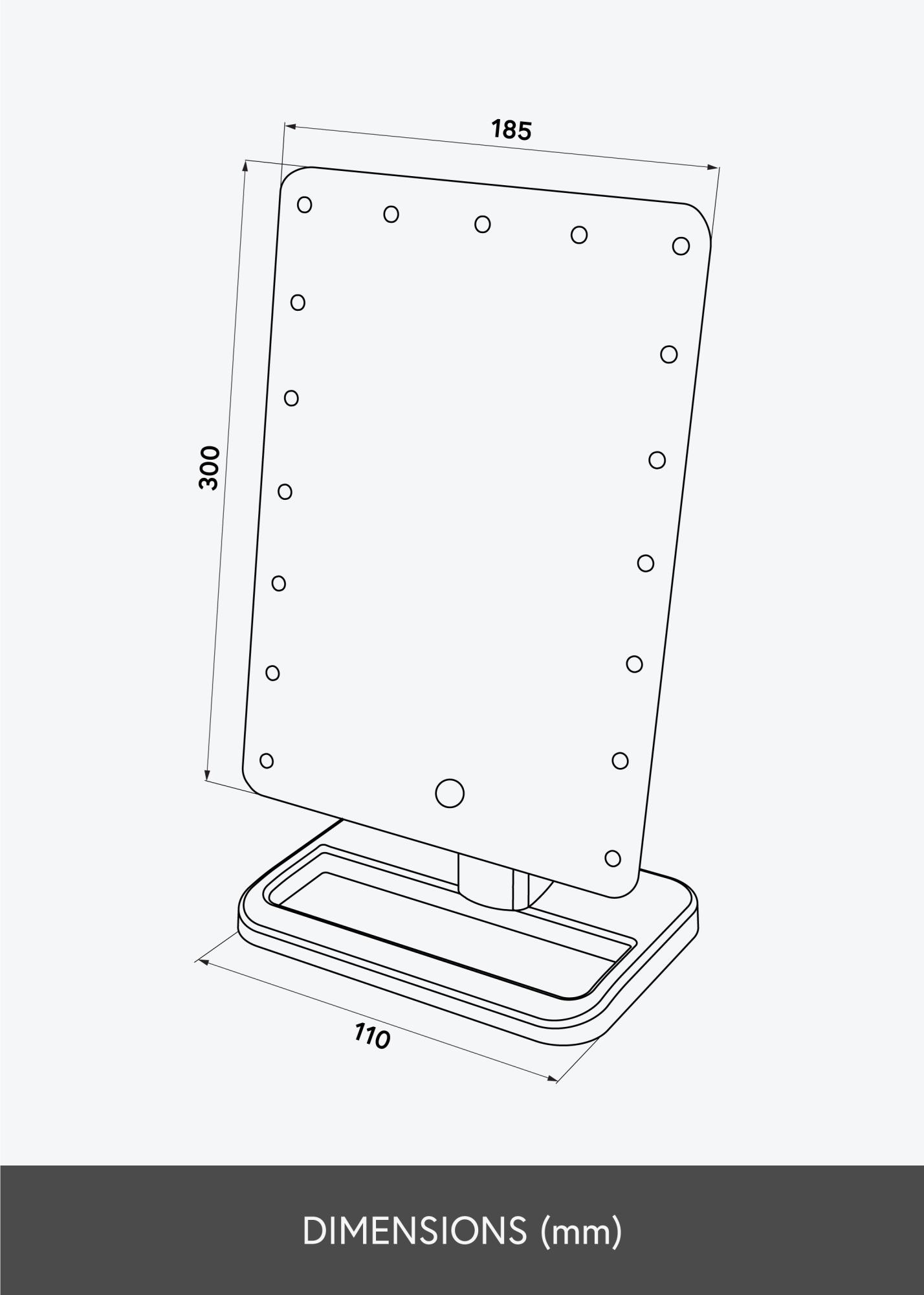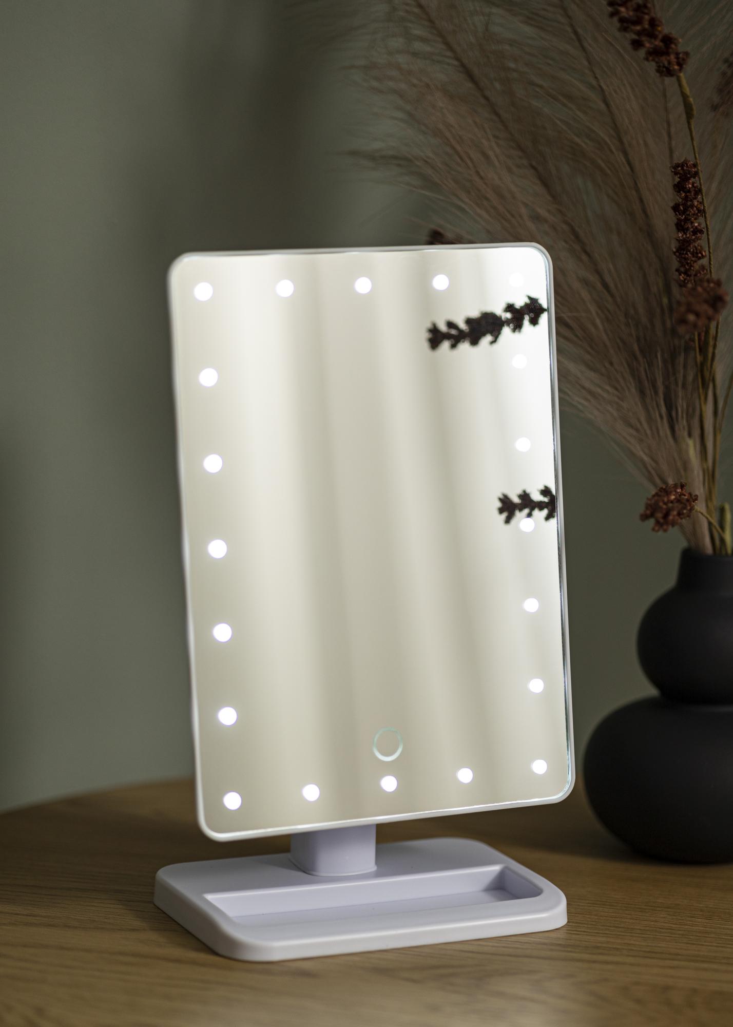 Powierzchnia lustrzana jest otoczona oświetleniem LED, które zapewnia równomierne światło podczas aplikacji makijażu. Oświetlenie LED jest bardzo korzystnym źródłem światła, gdyż jest energooszczędne i trwałe. Lusterko włącza się przyciskiem z tyłu, a następnie można regulować jasność światła według potrzeb. Robi się to, przytrzymując przycisk dotykowy na przedniej stronie lustra przez kilka sekund. Lustro jest zasilane 4 bateriami AA, które należy kupić oddzielnie.