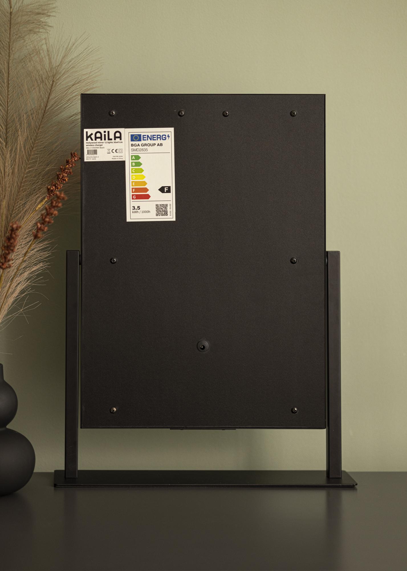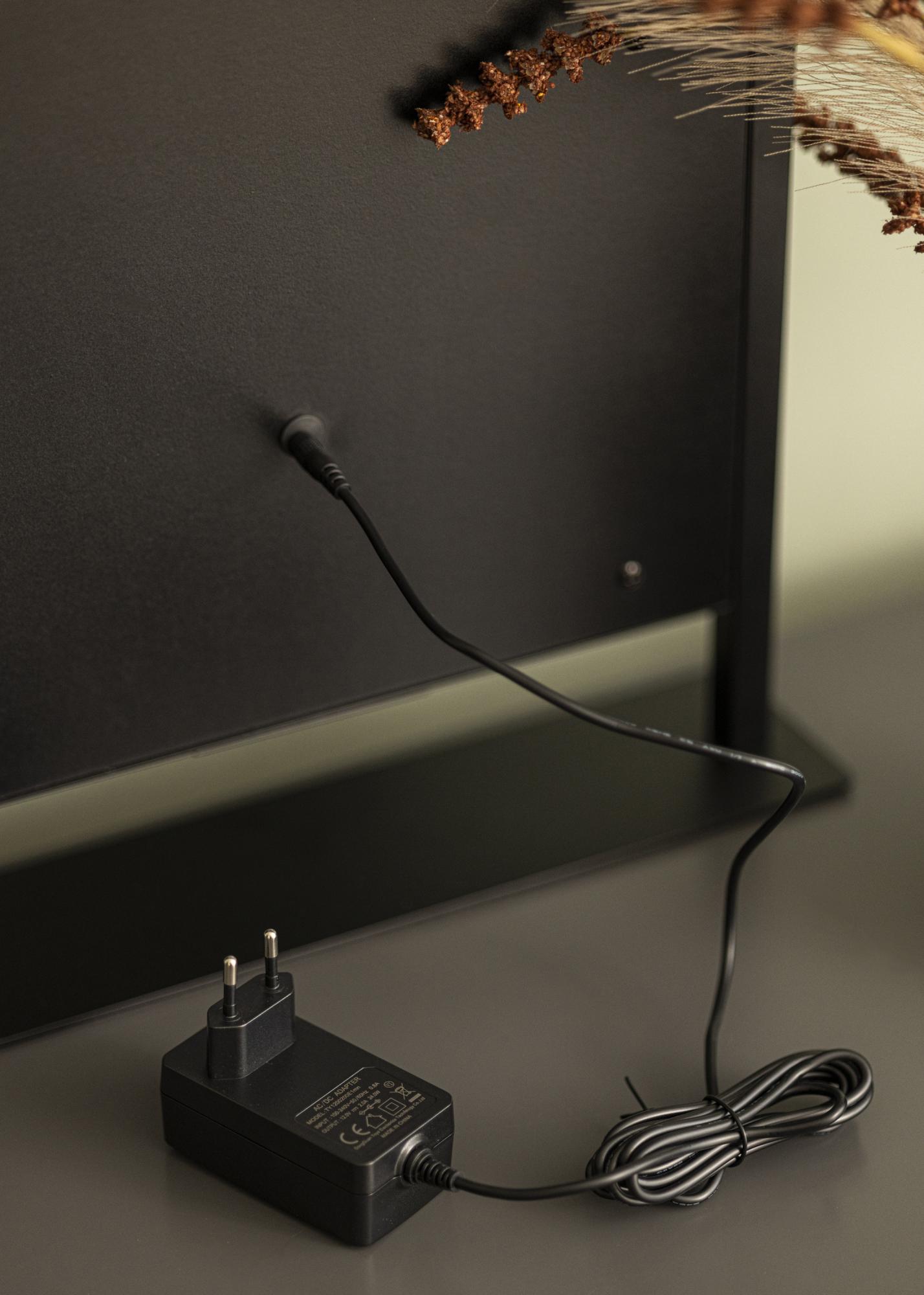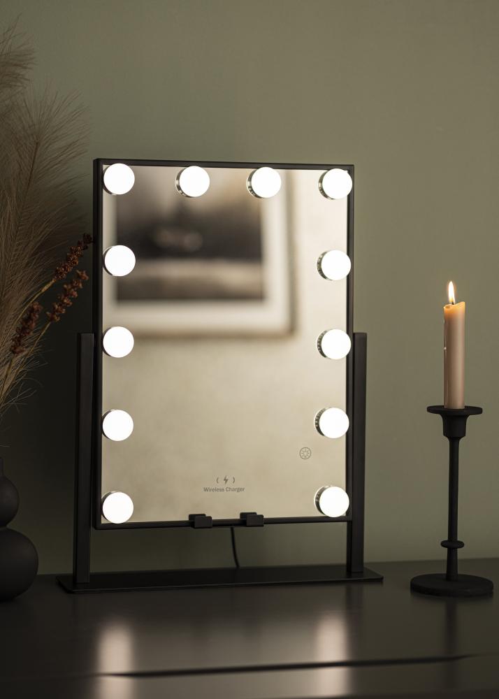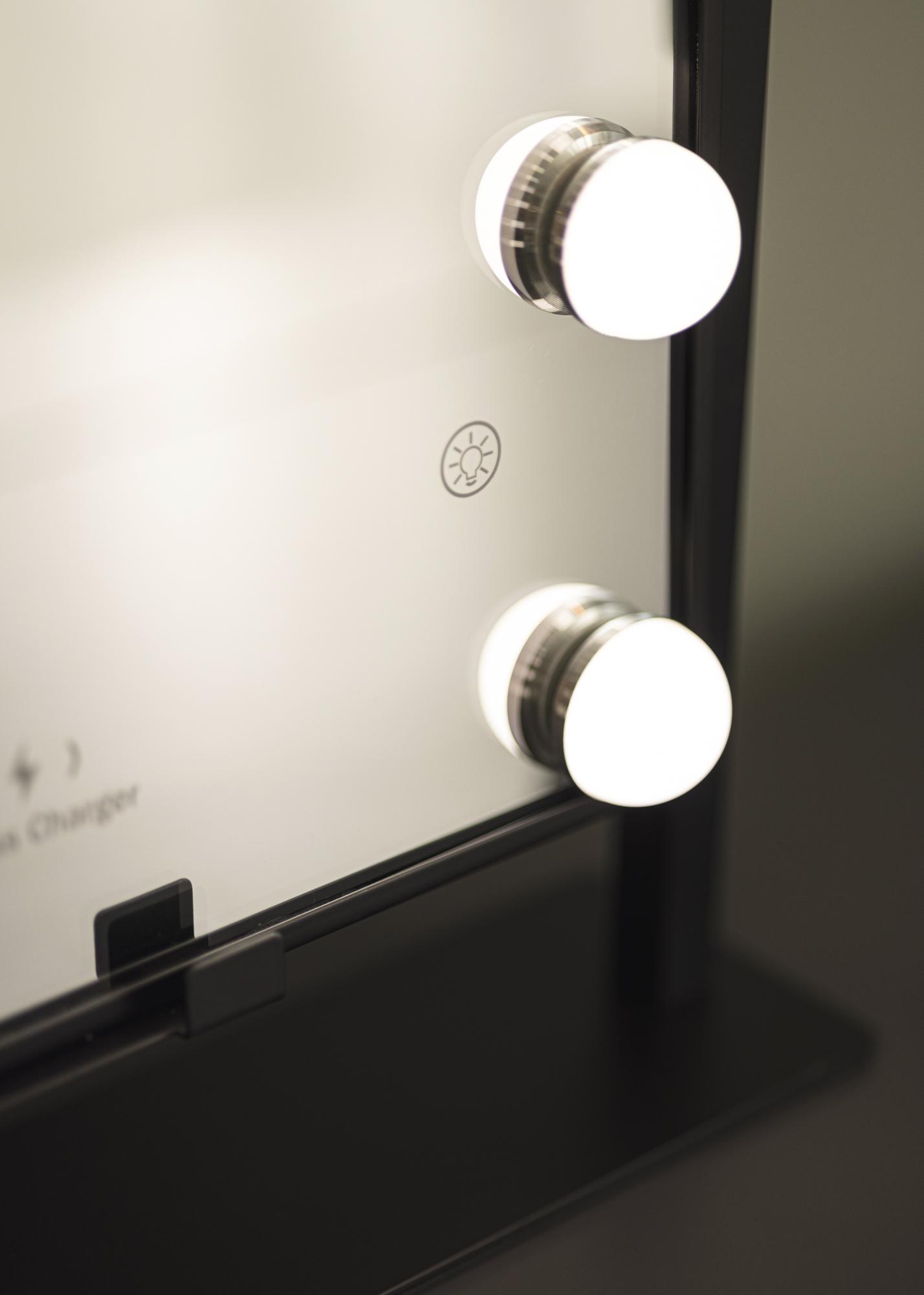 Lustro ma elegancki czarny kolor, który doskonale pasuje do wnętrza większości pomieszczeń. Czarny kolor uzupełniają 12 lamp LED, które pomagają jeszcze bardziej podkreślić stylowy wygląd. Wbudowane lampy LED są rozmieszczone jak rama wokół powierzchni lustra o wymiarach 30x41 cm. Dotykając przycisku na przedniej stronie lustra przez kilka sekund, można ściemnić oświetlenie do odpowiedniej jasności. Podłączenie do sieci odbywa się za pomocą wtyczki.