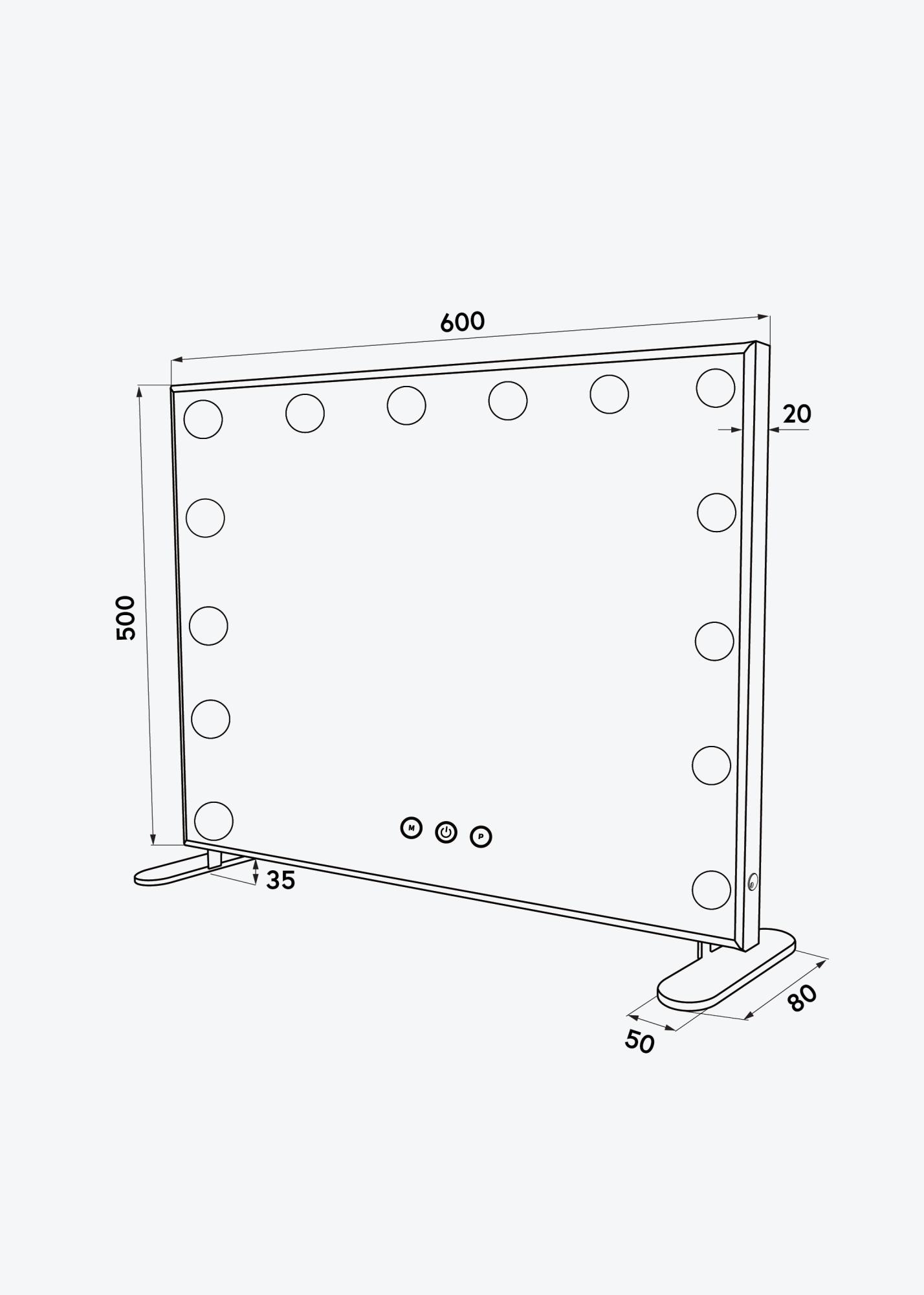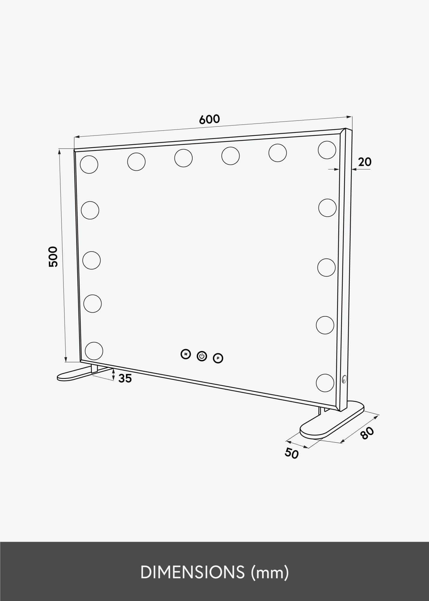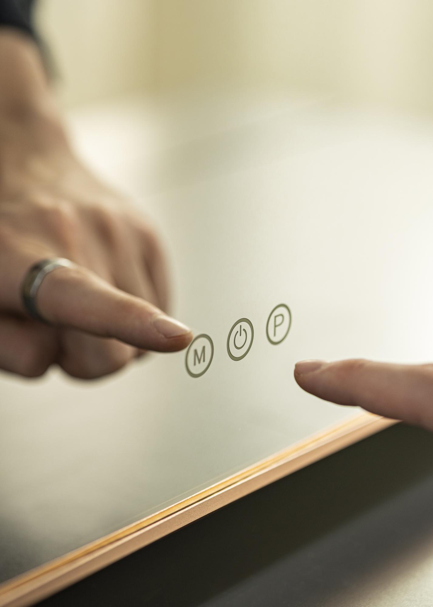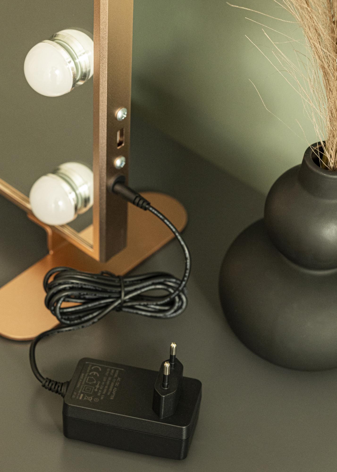 Oświetlenie LED jest regulowane, a do zmiany ustawień światła używasz przycisków dotykowych na dolnej krawędzi lustra. Przycisk „M” zmienia temperaturę barwową, a przycisk „P” reguluje jasność. Jest również przycisk do włączania i wyłączania oświetlenia. Elastyczne oświetlenie sprawia, że to lustro doskonale nadaje się zarówno do salonu, kiedy chcesz mieć miękkie oświetlenie tła, jak i do kącika do makijażu, gdy potrzebujesz ostrego światła, które pomoże Ci się skupić. Lustro jest również wyposażone w port USB, dzięki czemu możesz łatwo ładować swoje inteligentne urządzenia.