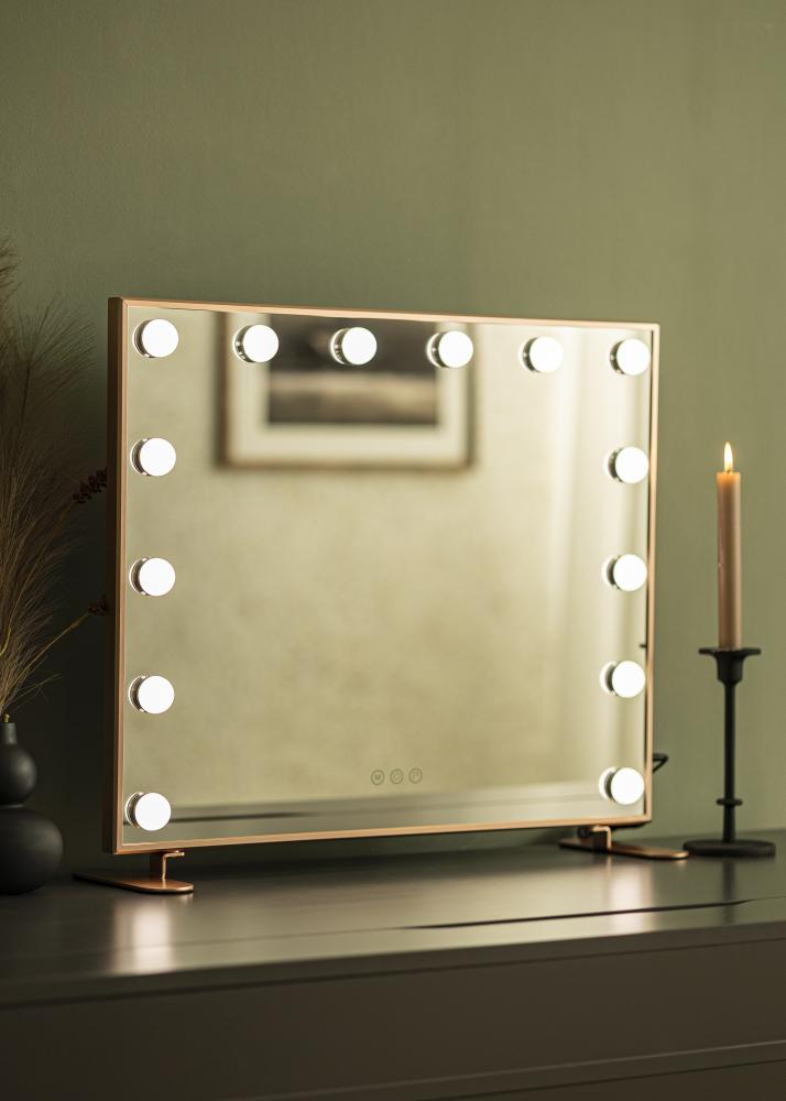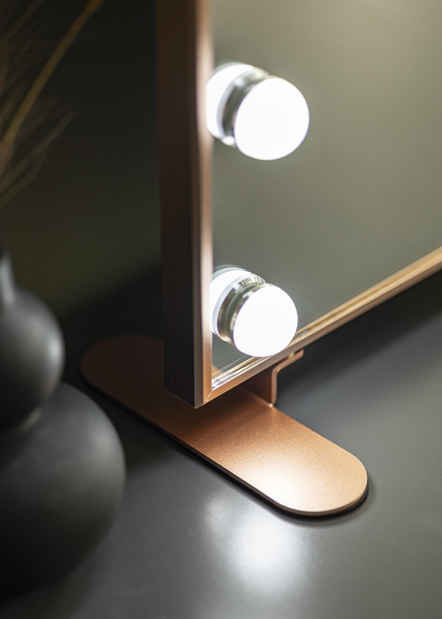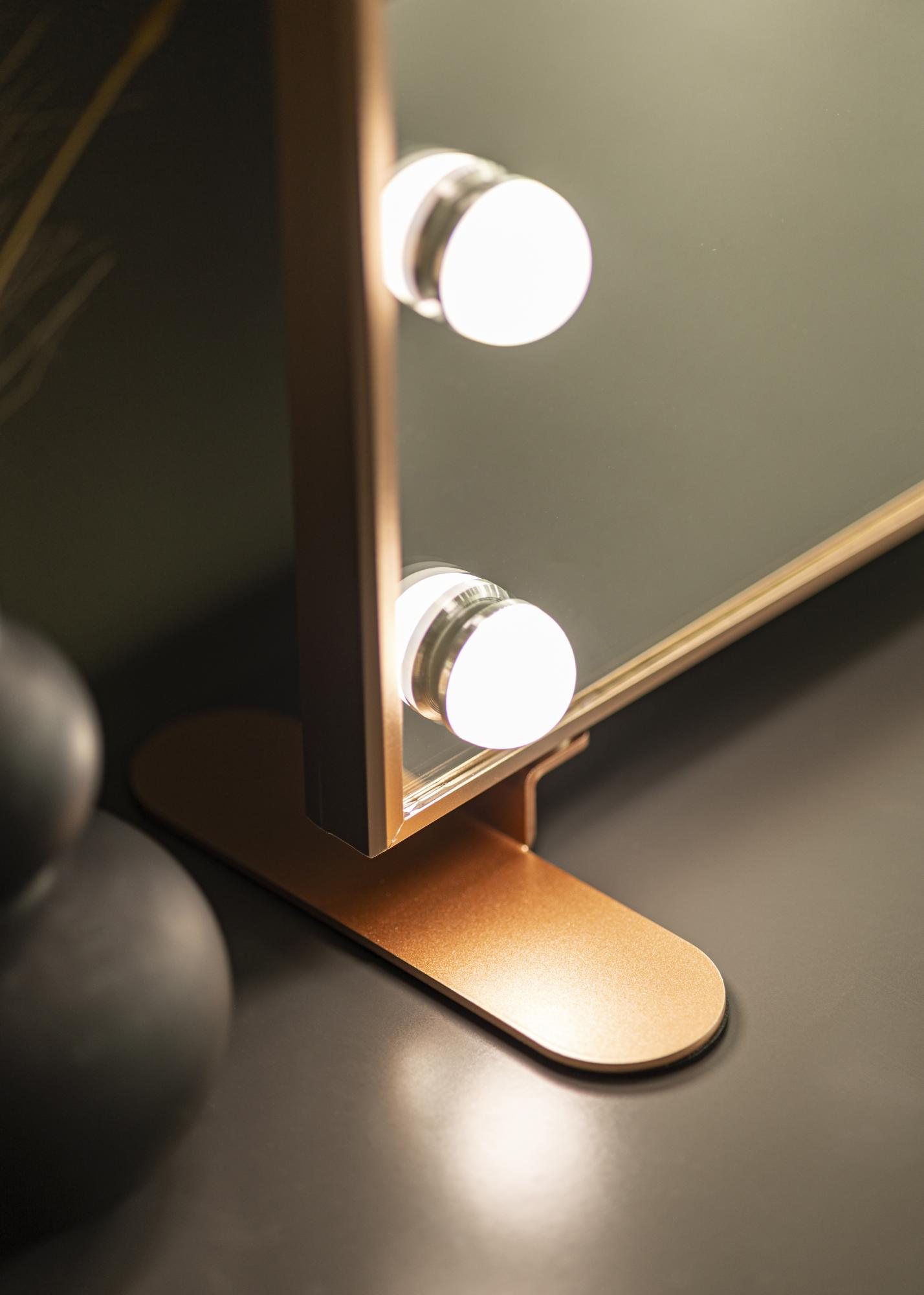To luksusowe lustro do makijażu posiada cieniutką metalową ramę w kolorze różowego złota i oświetlenie LED w postaci 14 dużych żarówek. Nadaje to lustru wygląd glamurous Hollywood, który dodaje stylu każdemu pomieszczeniu. Posiada elegancką podstawkę, również w odcieniu różowego złota, którą można zdemontować, jeśli chcesz powiesić lustro na ścianie.