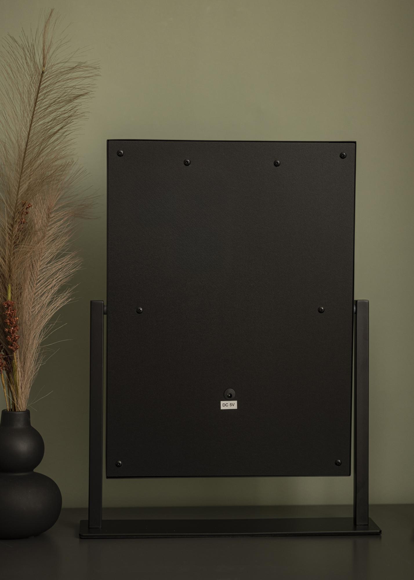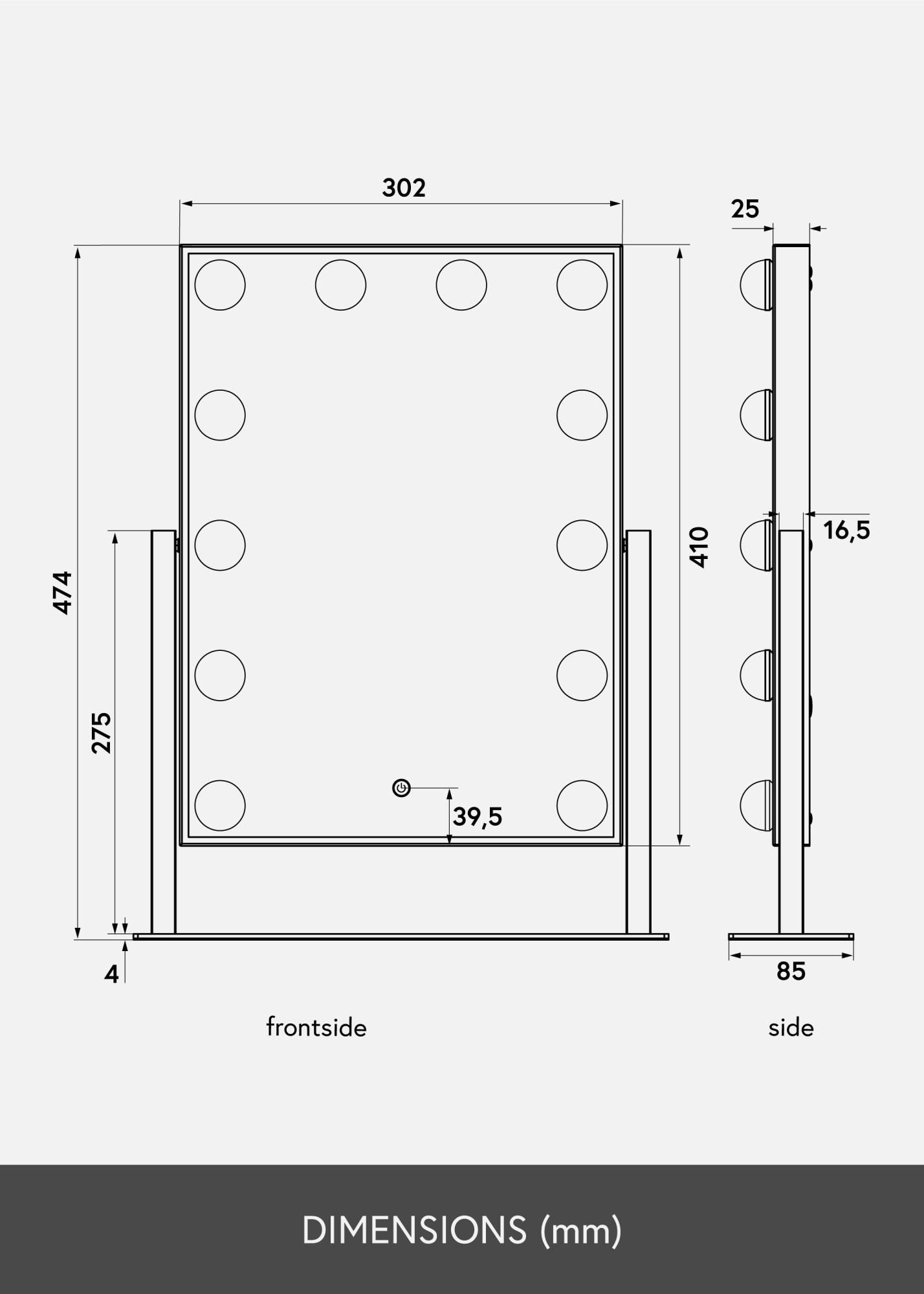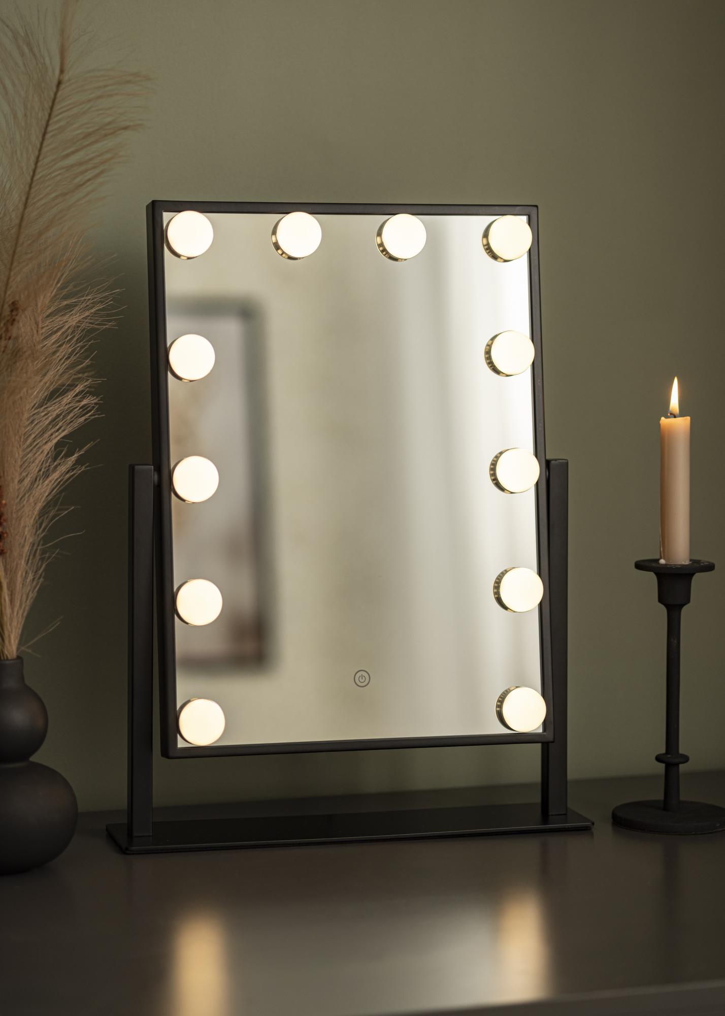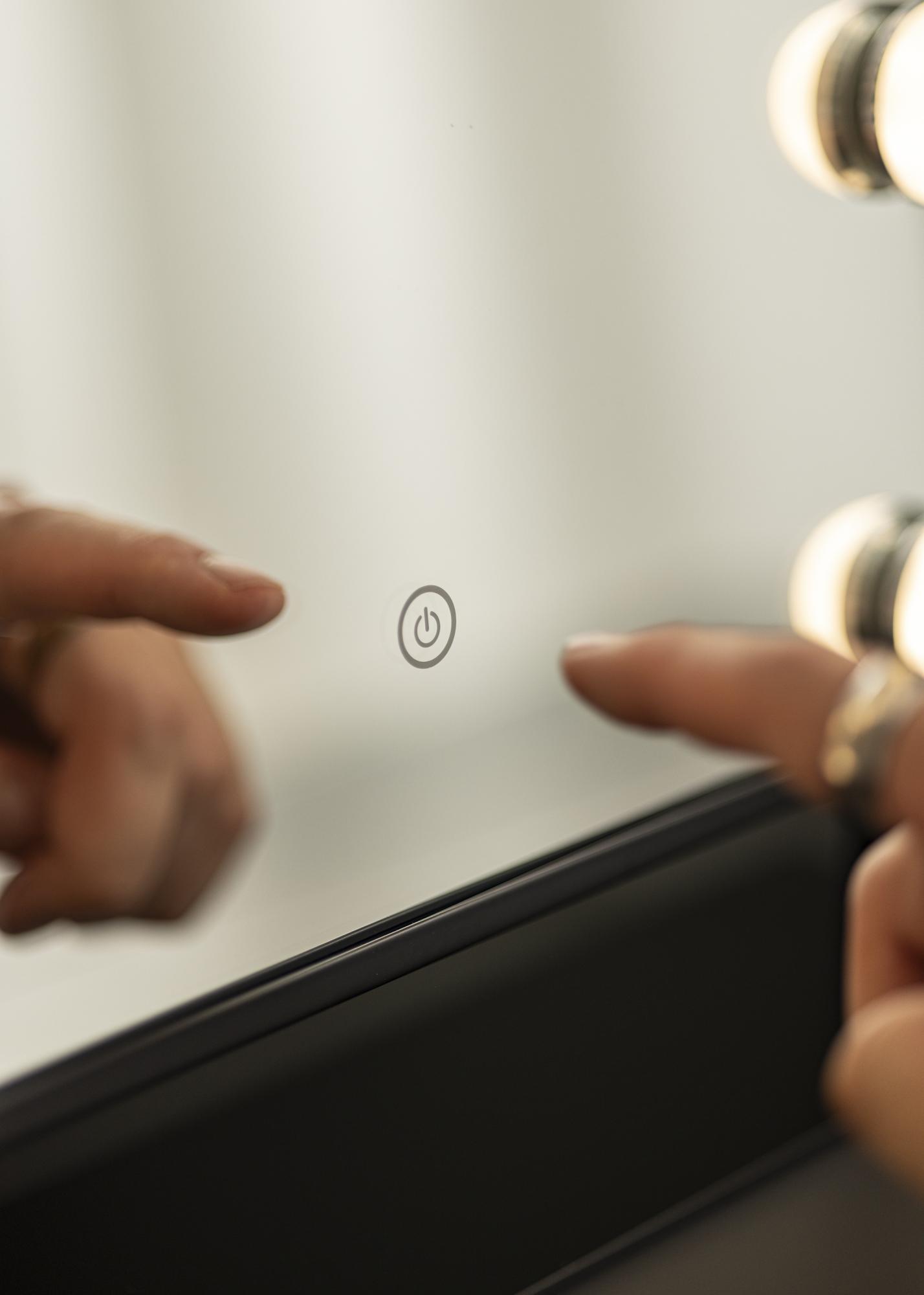 To jest lustro do makijażu w luksusowym designie z 12 dekoracyjnymi żarówkami LED w eleganckim czarnym odcieniu. Żarówki stylowo otaczają dużą powierzchnię lustra o wymiarach 30x40 cm i dają ciepłe, białe światło o temperaturze 3000K. Oświetlenie włącza się naciskając przycisk dotykowy na ekranie i posiada funkcję przyciemniania, którą łatwo regulujesz przytrzymując przycisk przez kilka sekund. Lustro można przechylać pionowo, dzięki czemu możesz łatwo malować się z dowolnego kąta, który najbardziej Ci odpowiada. Poza wieloma funkcjami to lustro do makijażu staje się eleganckim detalem i tworzy prawdziwe hollywoodzkie wrażenie w Twoim domu!