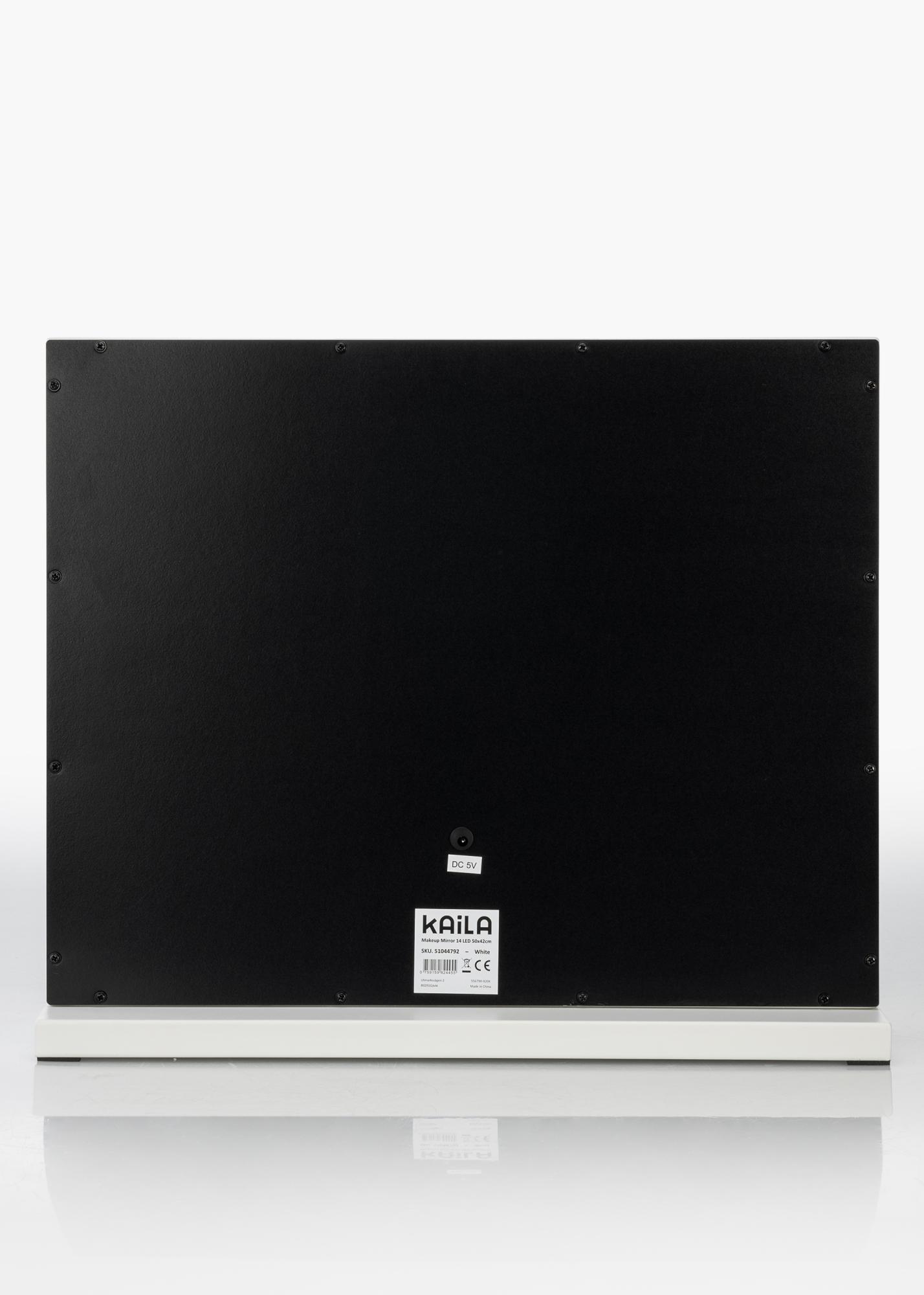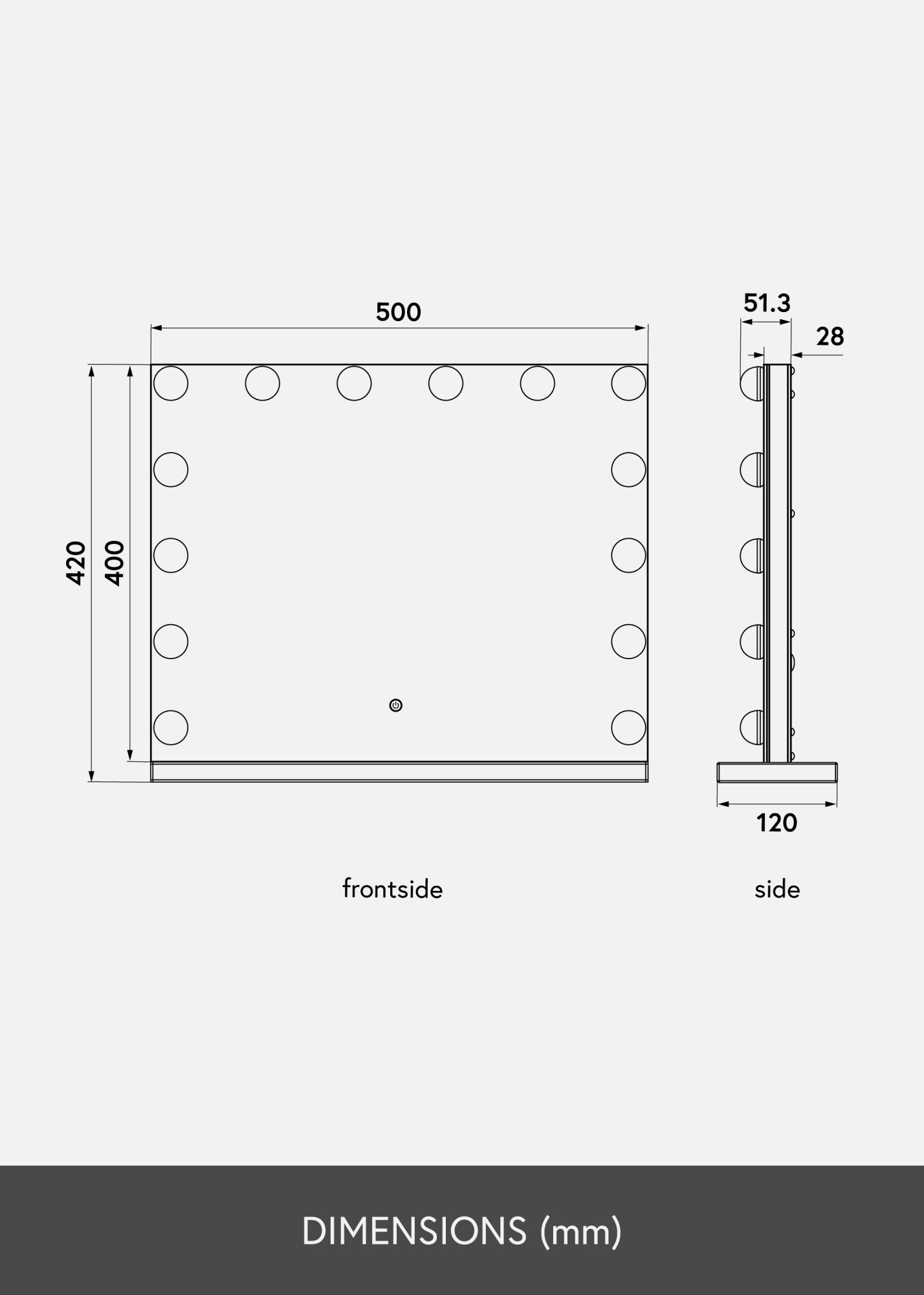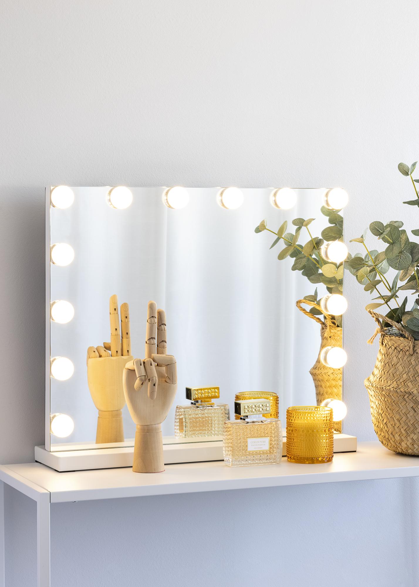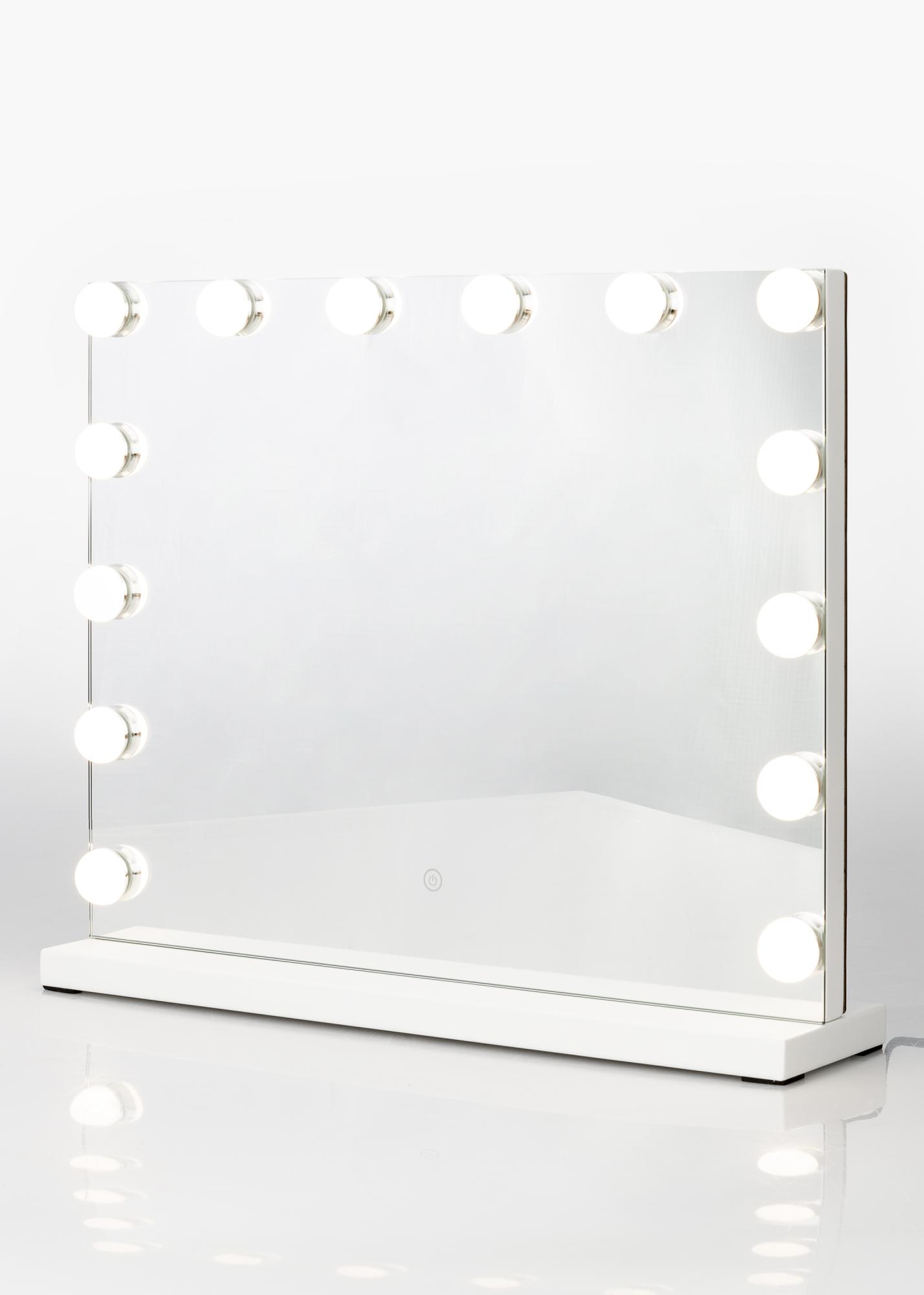 Przekształć pokój w studio makijażowe dzięki temu luksusowemu lusterku do makijażu w stylu Hollywood od KAILA! To jest duże lustro do makijażu z wbudowanym oświetleniem w postaci 14 żarówek LED, które elegancko otaczają dużą powierzchnię lustra. Oświetlenie LED jest przyciemniane i ma ciepłe białe światło o temperaturze 3000K. Oświetlenie włącza się łatwo przez dotknięcie przycisku na ekranie, a jego intensywność można łatwo regulować, przytrzymując przycisk. Lustro ma wymiary 50x45 cm. Podłączenie do prądu z wtyczką.