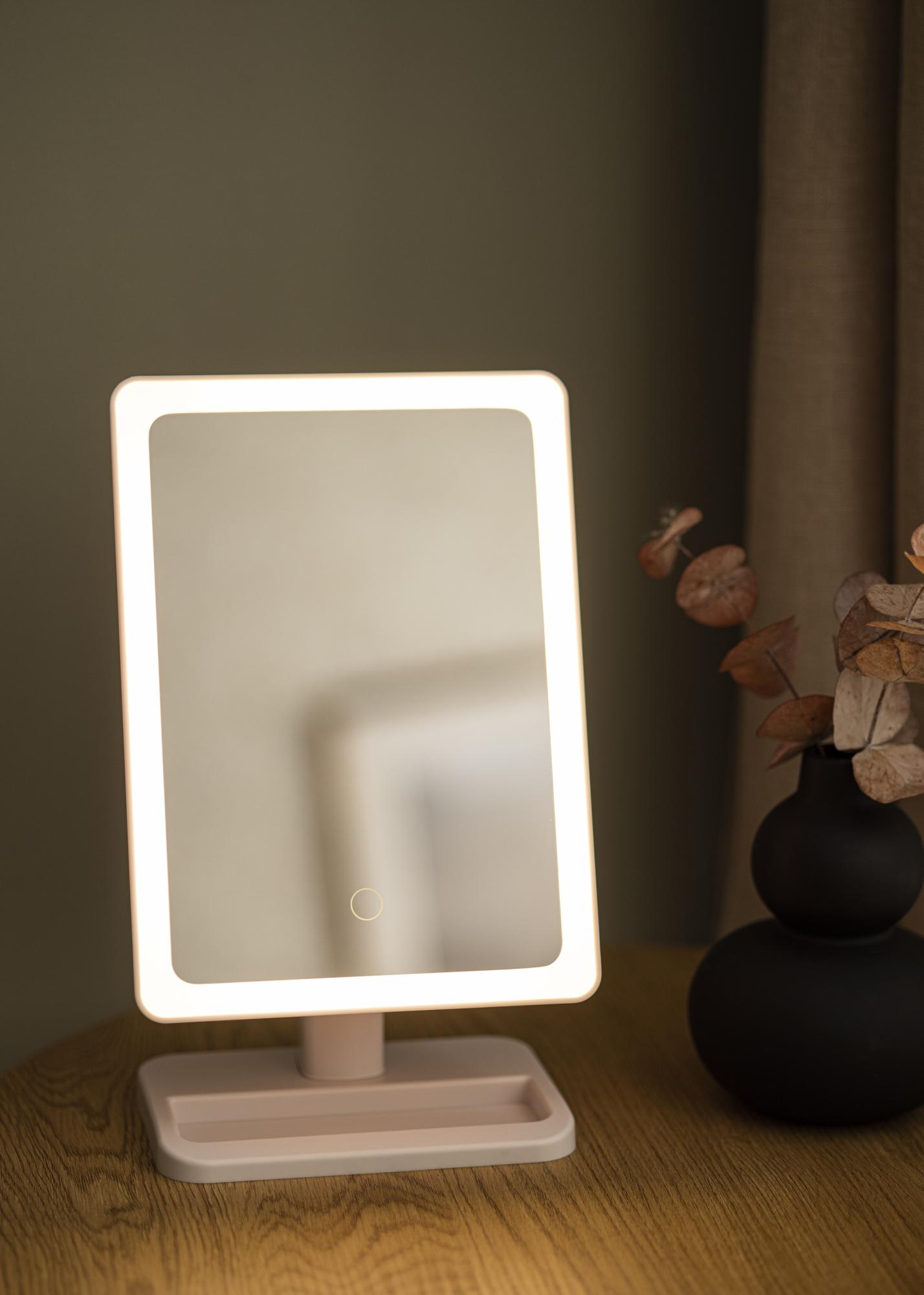 Lustro ma elegancki wygląd, z neutralnym białym kolorem i paskiem LED, który obramowuje powierzchnię lustra o wymiarach 16,5x25 cm. Możesz przyciemnić oświetlenie, przytrzymując przycisk na powierzchni lustra przez kilka sekund. W ten sposób możesz ustawić jasność, która najlepiej Ci odpowiada. Inteligentna konstrukcja lustra pozwala na obracanie i ustawianie powierzchni lustra według własnego uznania, a lekka waga sprawia, że lustro łatwo jest przenosić. W zestawie znajduje się mniejsze lustro z 10-krotnym zoomem. Jest idealne, gdy chcesz dokładnie przejrzeć część swojej twarzy. Lustro jest zasilane wbudowanym akumulatorem, który ładuje się za pomocą dołączonego kabla ładującego.