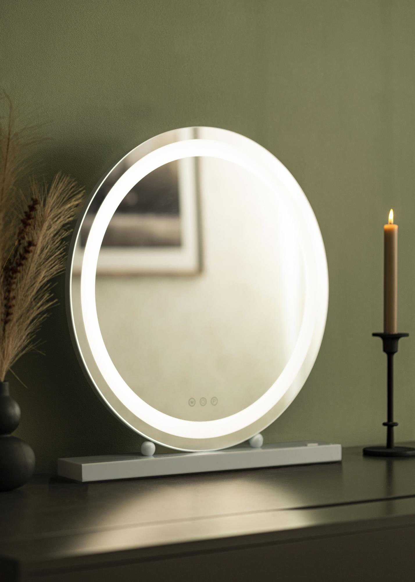 Czy chcesz mieć wyrafinowane lustro w postaci pionowej na toaletce, komodzie w holu lub kredensie w salonie? Jest to okrągłe lustro z elegancką białą podstawą i zintegrowanym oświetleniem LED, które będzie zarówno ładnym, jak i praktycznym dodatkiem w Twoim domu. Oświetlenie LED w lustrze do makijażu składa się z zintegrowanej taśmy LED, która włącza się i wyłącza za pomocą przycisku dotykowego na powierzchni lustra. Istnieją również przyciski dotykowe do regulacji ustawień światła lustra; przycisk oznaczony literą "M" do regulacji temperatury barwowej oraz przycisk oznaczony literą "P" do korekcji jasności.