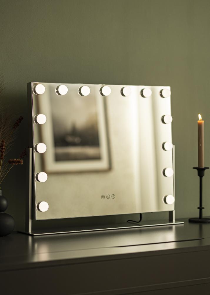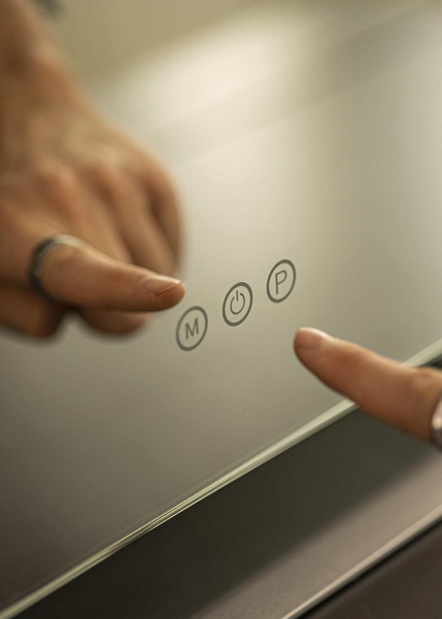 Dzięki eleganckiemu lustru do makijażu możesz stworzyć luksusową atmosferę w każdym pomieszczeniu. To lustro ma wbudowane oświetlenie LED, które możesz dostosować w zależności od tego, czy chcesz przyjemnego oświetlenia tła w salonie, czy mocnego światła do kącika do makijażu. Aby dostosować oświetlenie, użyj przycisków dotykowych w dolnej krawędzi lustra; przycisk "M" reguluje temperaturę barwową światła, a przycisk "P" zmienia jasność. Istnieje również przycisk włączenia/wyłączenia, aby włączać i wyłączać oświetlenie lustra. Połączenie elektryczne odbywa się za pomocą wtyczki.