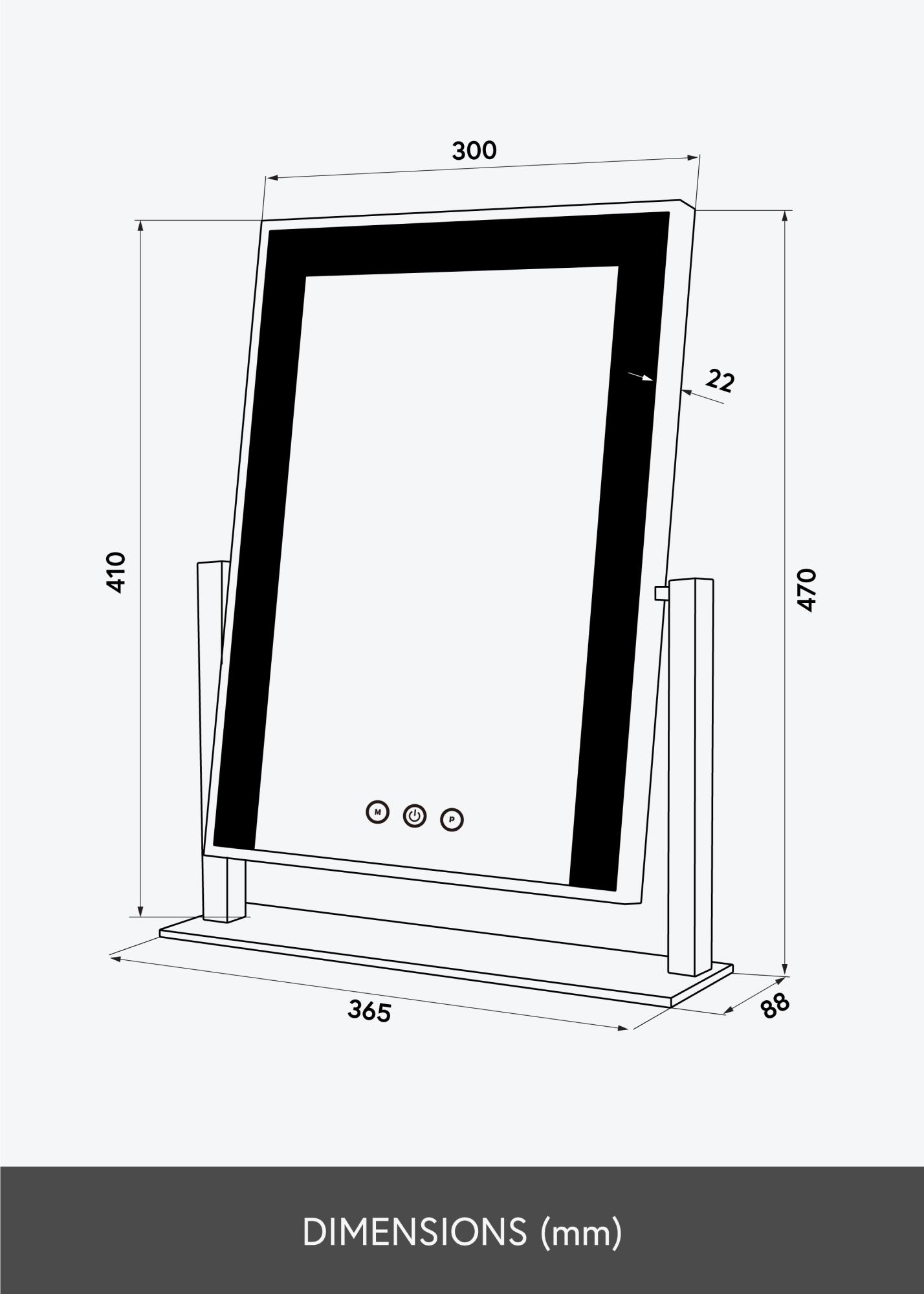 To lustro ma metalowy stojak i elegancki biały kolor, który nadaje mu stylowy wygląd. Dzięki kompaktowym wymiarom, z powierzchnią lustra 30x41 cm, łatwo znajdzie miejsce na stole w kąciku makijażowym, jak i na komodzie w holu lub salonie. Inteligentna konstrukcja pozwala na regulację kąta nachylenia lustra. Podłączenie do sieci elektrycznej odbywa się poprzez wtyczkę.