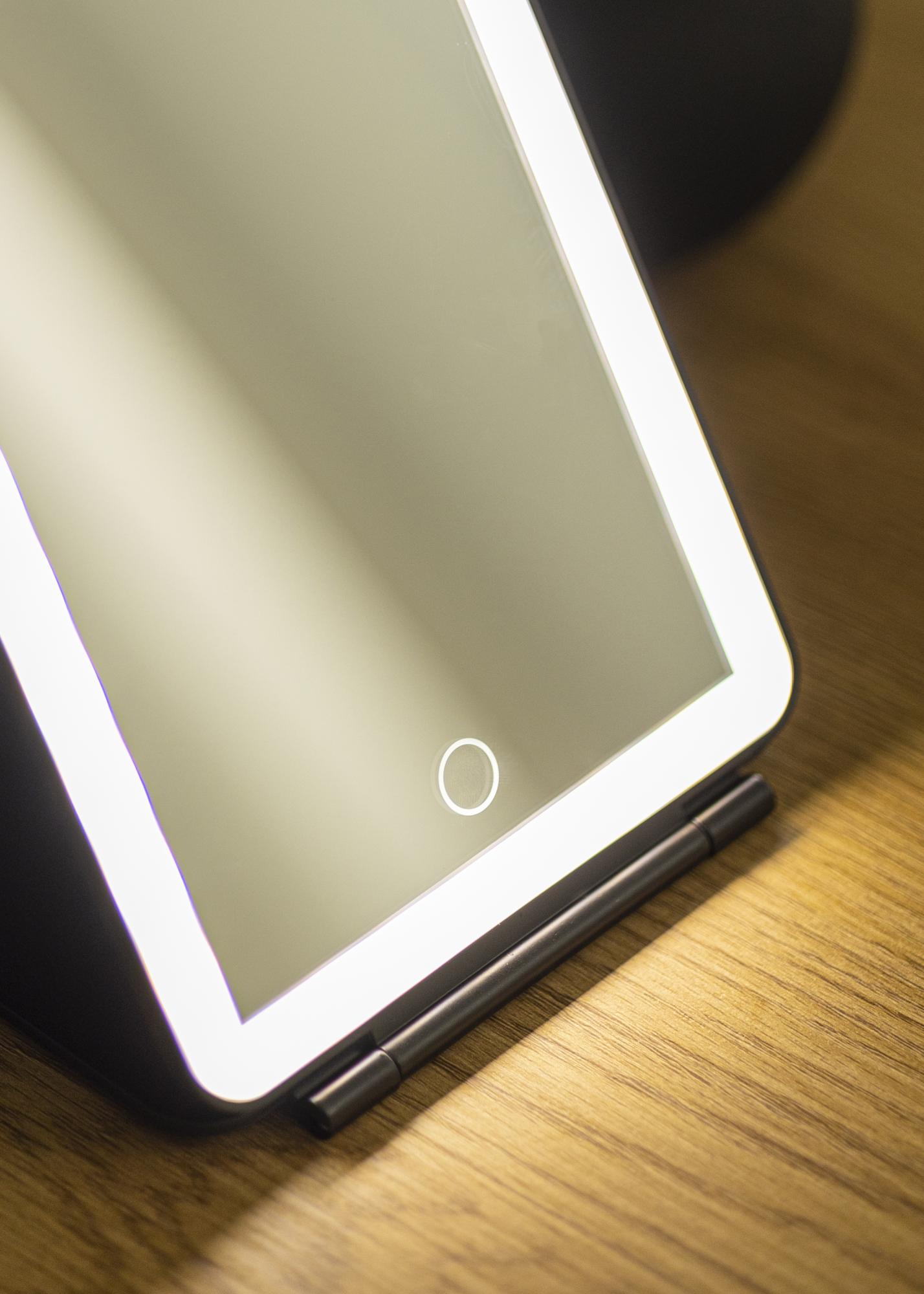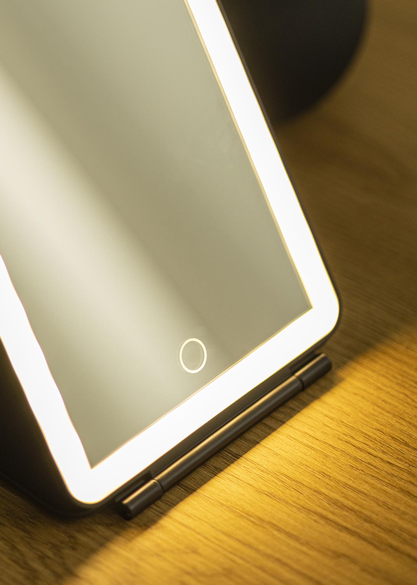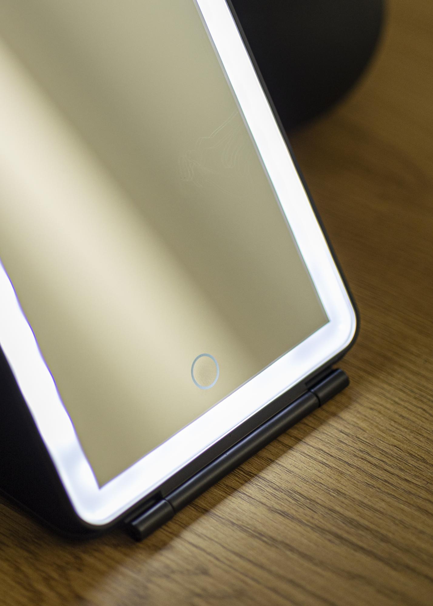 To lustro ma elegancki czarny kolor i jest składane, co oszczędza miejsce i chroni powierzchnię lustra przed zarysowaniami, gdy przechowujesz je w torbie. W pozycji rozłożonej możesz regulować kąt nachylenia lustra. Na powierzchni lustra znajduje się przycisk dotykowy, który włącza i wyłącza oświetlenie lustra. Przytrzymując przycisk przez kilka sekund, możesz również zmienić ustawienia światła. Możesz wtedy ściemniać światło i ustawiać temperaturę barwową.