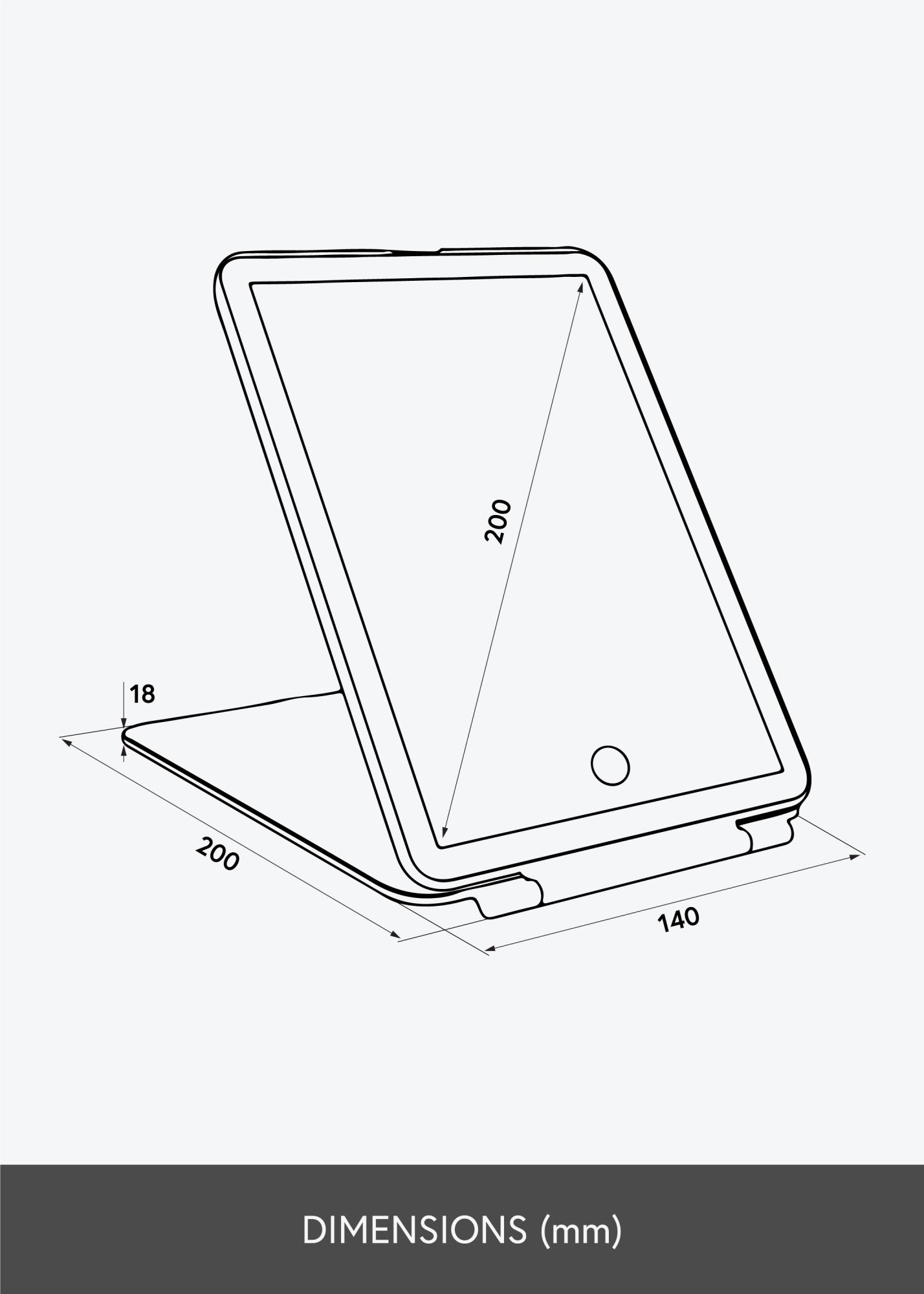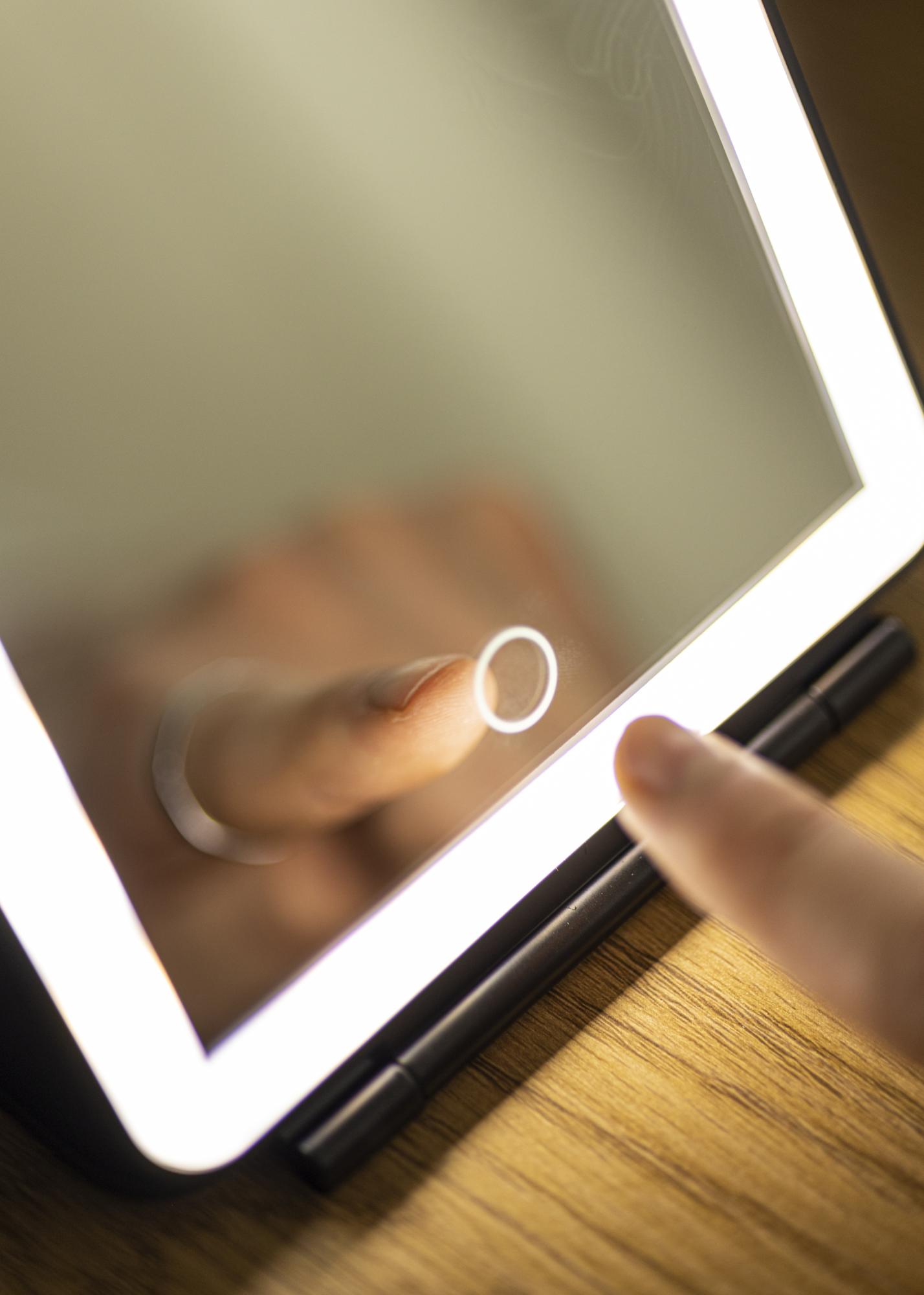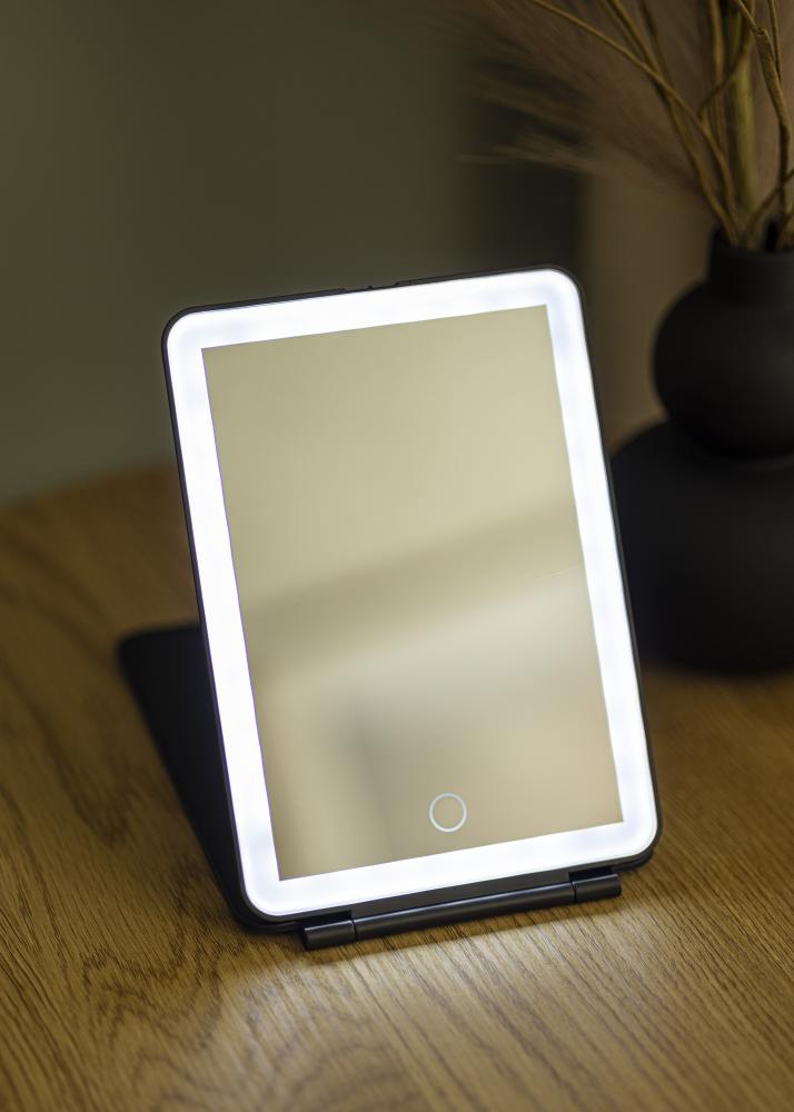 To lustro ma elegancki czarny kolor i jest składane, co oszczędza miejsce i chroni powierzchnię lustra przed zarysowaniami, gdy przechowujesz je w torbie. W pozycji rozłożonej możesz regulować kąt nachylenia lustra. Na powierzchni lustra znajduje się przycisk dotykowy, który włącza i wyłącza oświetlenie lustra. Przytrzymując przycisk przez kilka sekund, możesz również zmienić ustawienia światła. Możesz wtedy ściemniać światło i ustawiać temperaturę barwową.