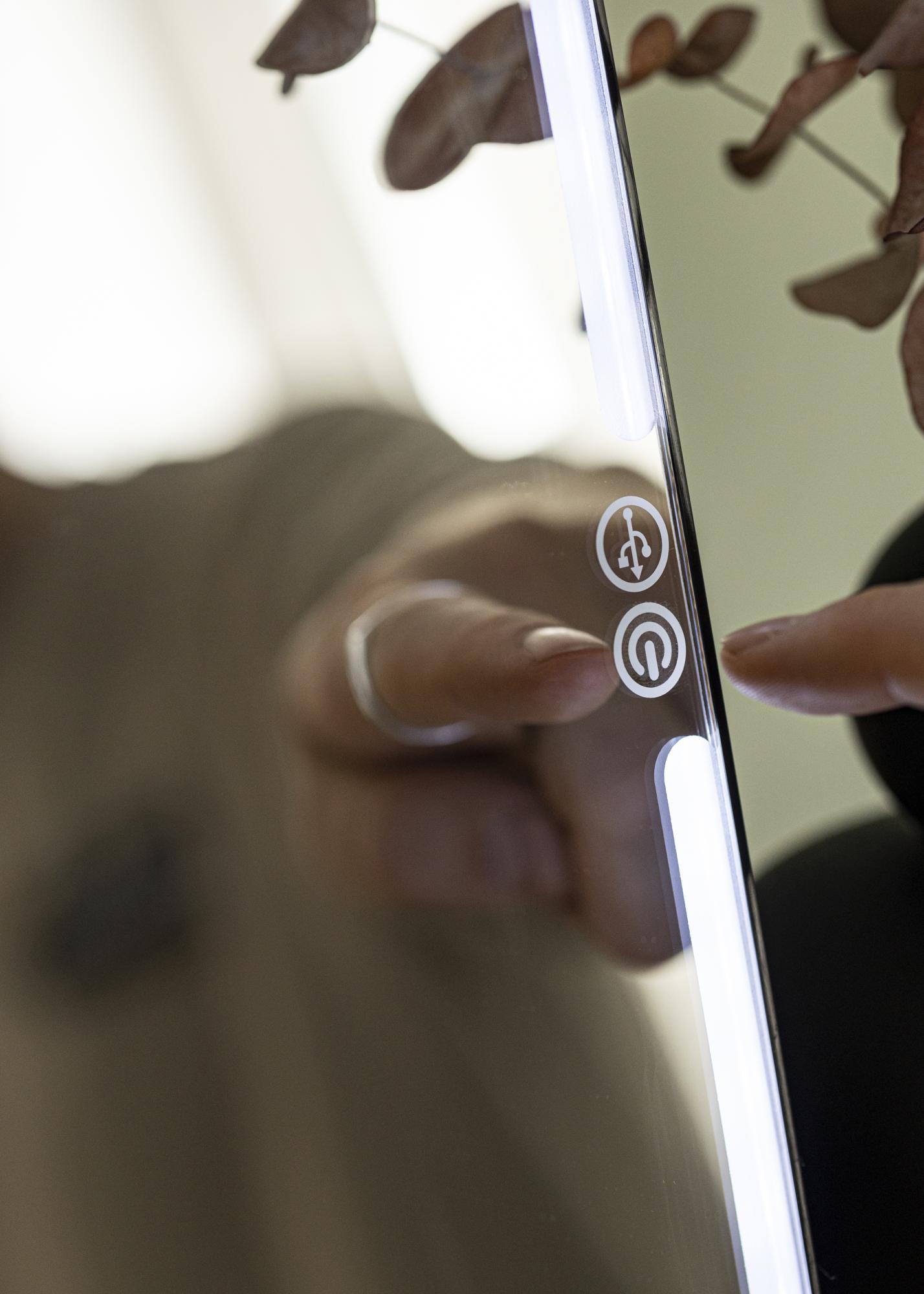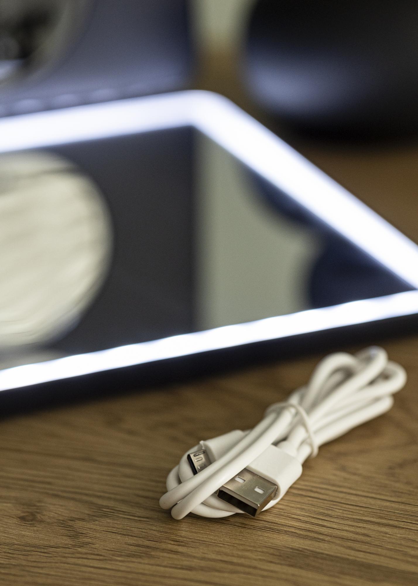 To lusterko do makijażu ma stylowy czarny kolor i wbudowane oświetlenie LED. Oświetlenie reguluje się za pomocą przycisków dotykowych na ramie lusterka, za pomocą których można również włączać i wyłączać lusterko. Zamykając lusterko w włączonym stanie, automatycznie przechodzi ono w tryb oszczędzania energii, a po ponownym otwarciu zaczyna świecić. Lusterko jest zasilane bateryjnie i ładowane przez połączenie USB.