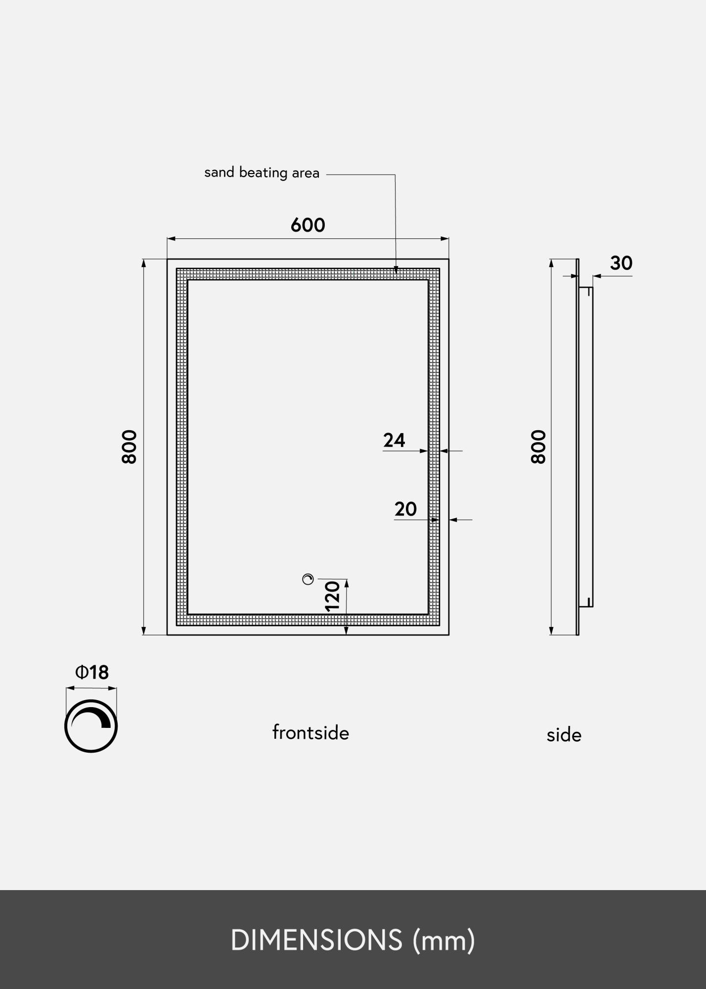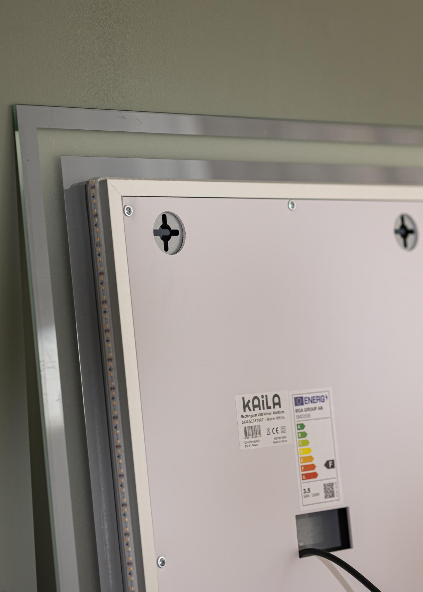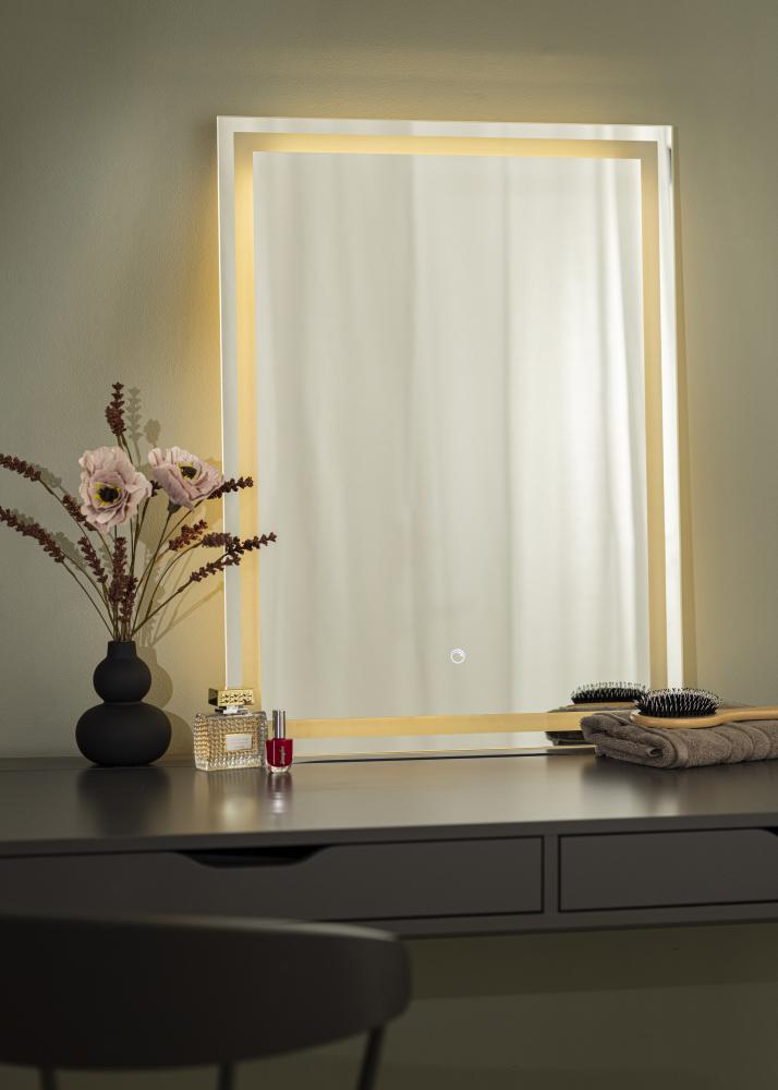 Czy pragniesz nowoczesnego i minimalistycznego lustra z oświetleniem? To jest lustro dla Ciebie. Jest wyposażone w energooszczędne lampy LED, które dają równomierne światło, co jest idealne, gdy nakładasz makijaż lub po prostu chcesz się przyjrzeć w ciągu dnia. Oświetlenie jest umieszczone z tyłu lustra, ale prześwieca jako elegancka ramka na przedniej stronie lustra. Aby dostosować jasność, przytrzymaj przycisk dotykowy na dolnej krawędzi lustra przez kilka sekund.