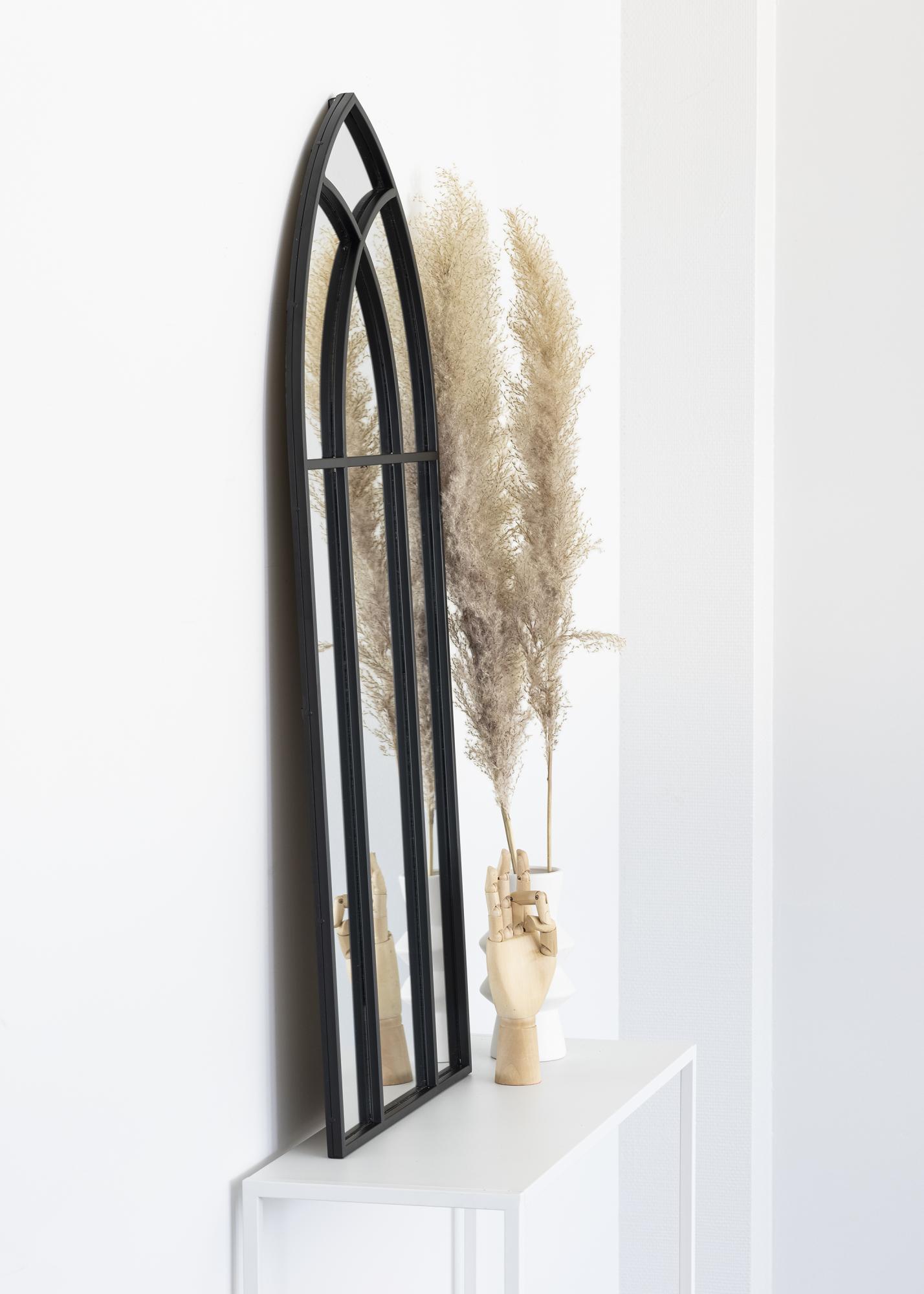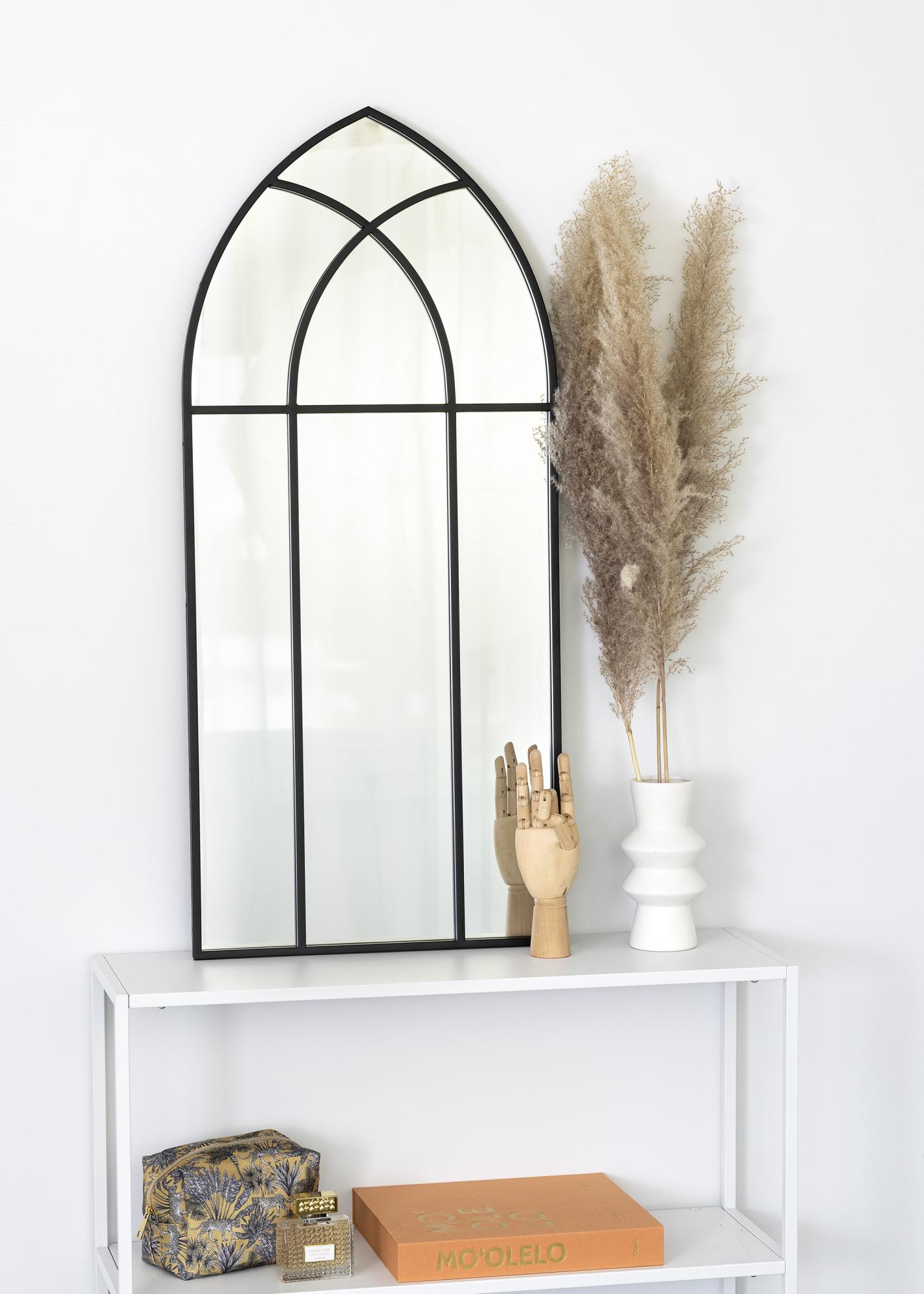 To bardzo dekoracyjne lustro, które natychmiast tworzy bardziej romantyczną atmosferę w pomieszczeniu, w którym się znajduje! Lustro ma design przypominający okno ogrodowe i jednocześnie nieco gotycki charakter. Ciekawy kształt lustra sprawi, że stanie się ono punktem centralnym w Twoim domu! Lustro ma wymiary 45x100 i posiada dekoracyjny wzór z czarnych cienkich linii z metalu.