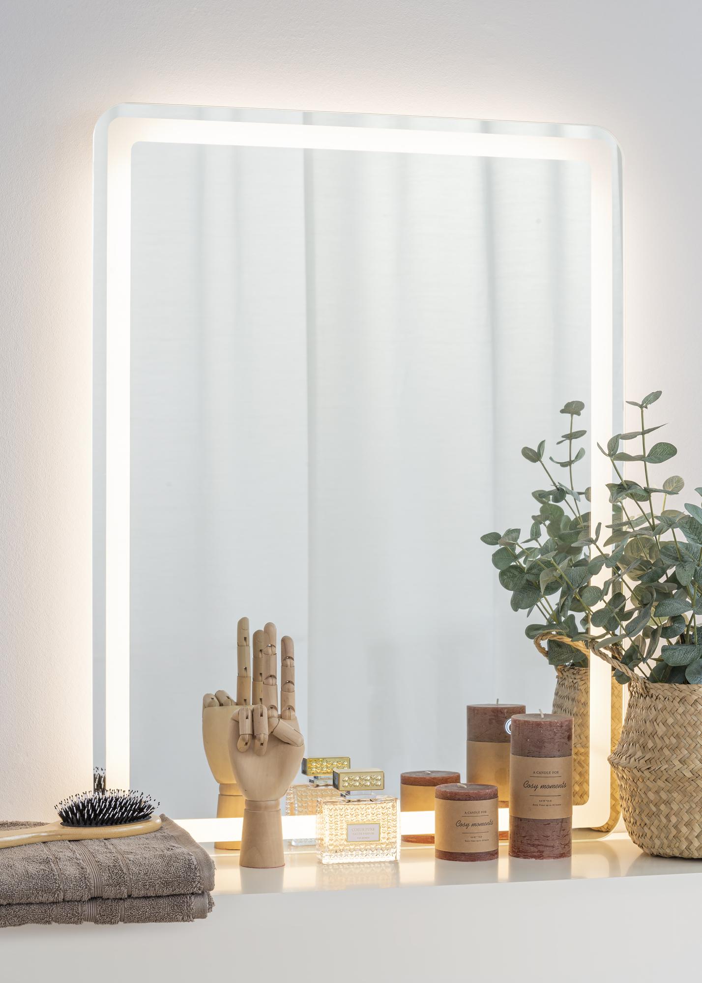 To jest eleganckie lustro łazienkowe od szwedzkiej marki KAILA. Lustro ma łagodniejsze krawędzie, a w środku wbudowane oświetlenie LED, które stylowo obramowuje taflę szkła. Zintegrowane oświetlenie LED jest ściemniane i daje naturalne ciepłe białe światło o temperaturze 3000K. Oświetlenie reguluje się łatwo, przytrzymując palec na przycisku dotykowym przez kilka sekund, aby przyciemnić światło do pożądanej intensywności. Lustro zapamiętuje ostatnie ustawienie światła przy następnym włączeniu.