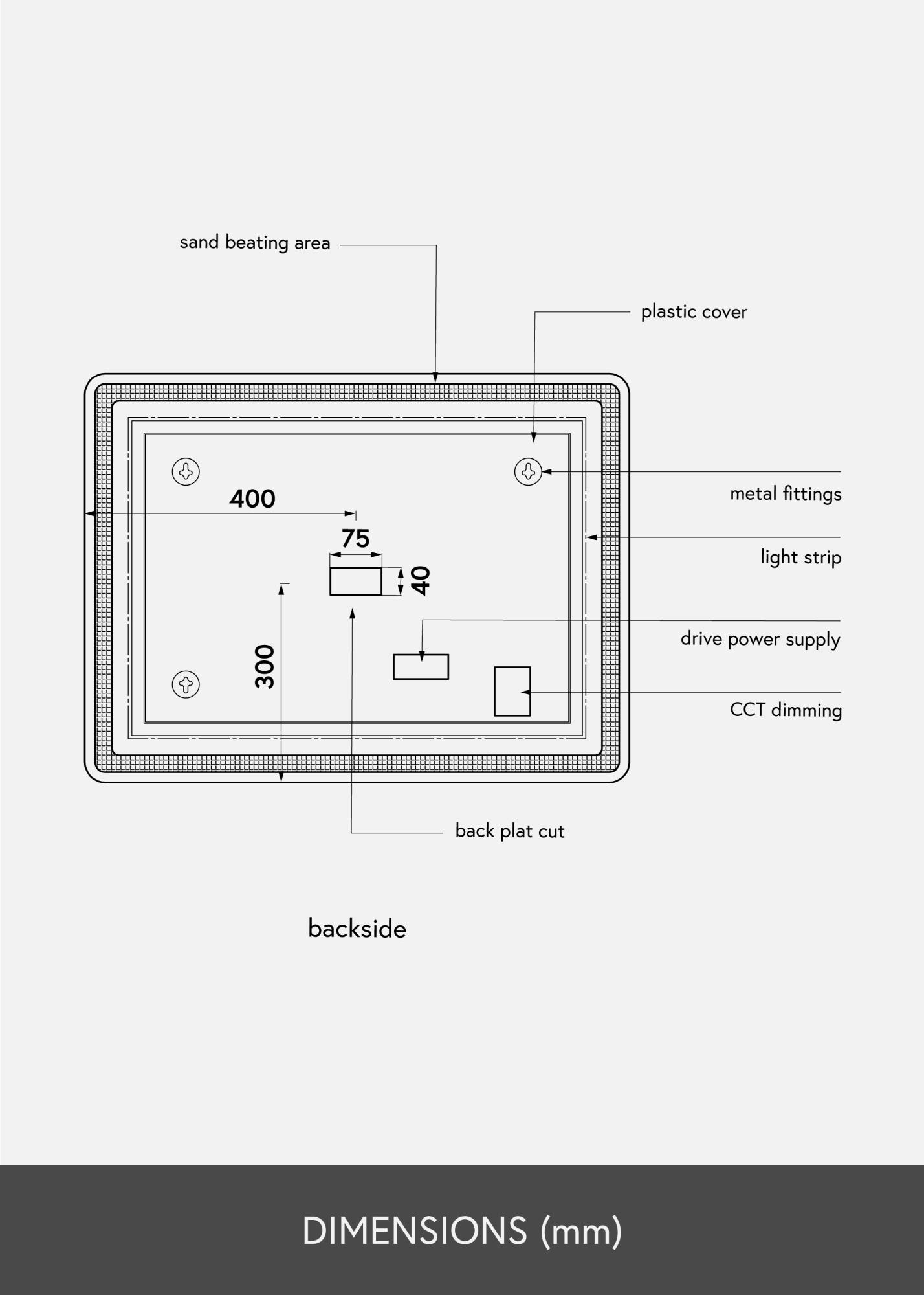 Lustro ma wymiary 60x80 cm, a dzięki dołączonym uchwytom ściennym można je umieścić zarówno w poziomie, jak i pionie. Lustro jest zatwierdzone do użytku w łazience. Lustro łazienkowe jest przeznaczone do stałej instalacji i podłącza się do włącznika światła. Aby lustro działało poprawnie, powinno być podłączone do zwykłego włącznika, a nie do włącznika ze ściemniaczem.