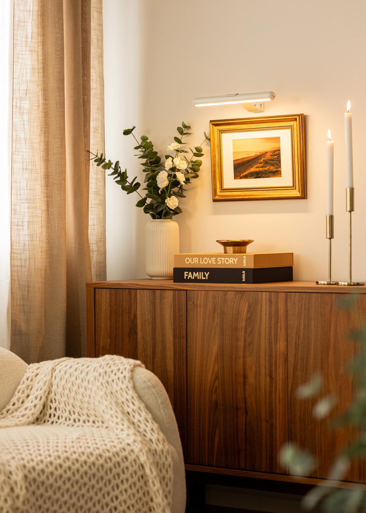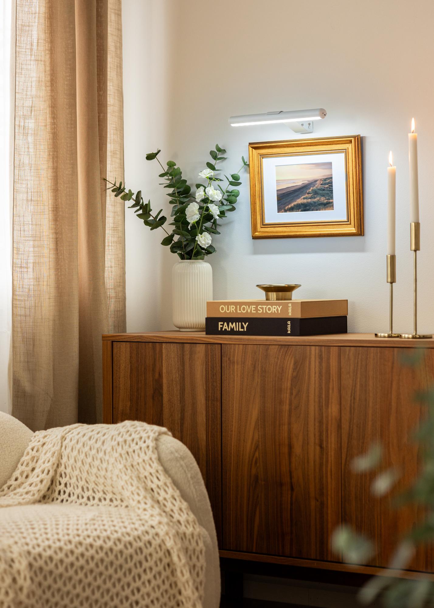 Ta bateryjna lampa do obrazów w białym wzornictwie oferuje wygodne rozwiązanie do oświetlania twoich dzieł sztuki bez potrzeby ciągnięcia kabli. Dzięki wykorzystaniu zasilania bateryjnego może być umieszczona w dowolnym miejscu bez myślenia o gniazdkach elektrycznych, co czyni ją bardzo elastyczną. Z głębokością 15 cm i długością 33 cm, oświetlenie jest kompaktowe i łatwe w instalacji, jednocześnie mogąc oświetlić dzieło sztuki o szerokości do 60 cm.