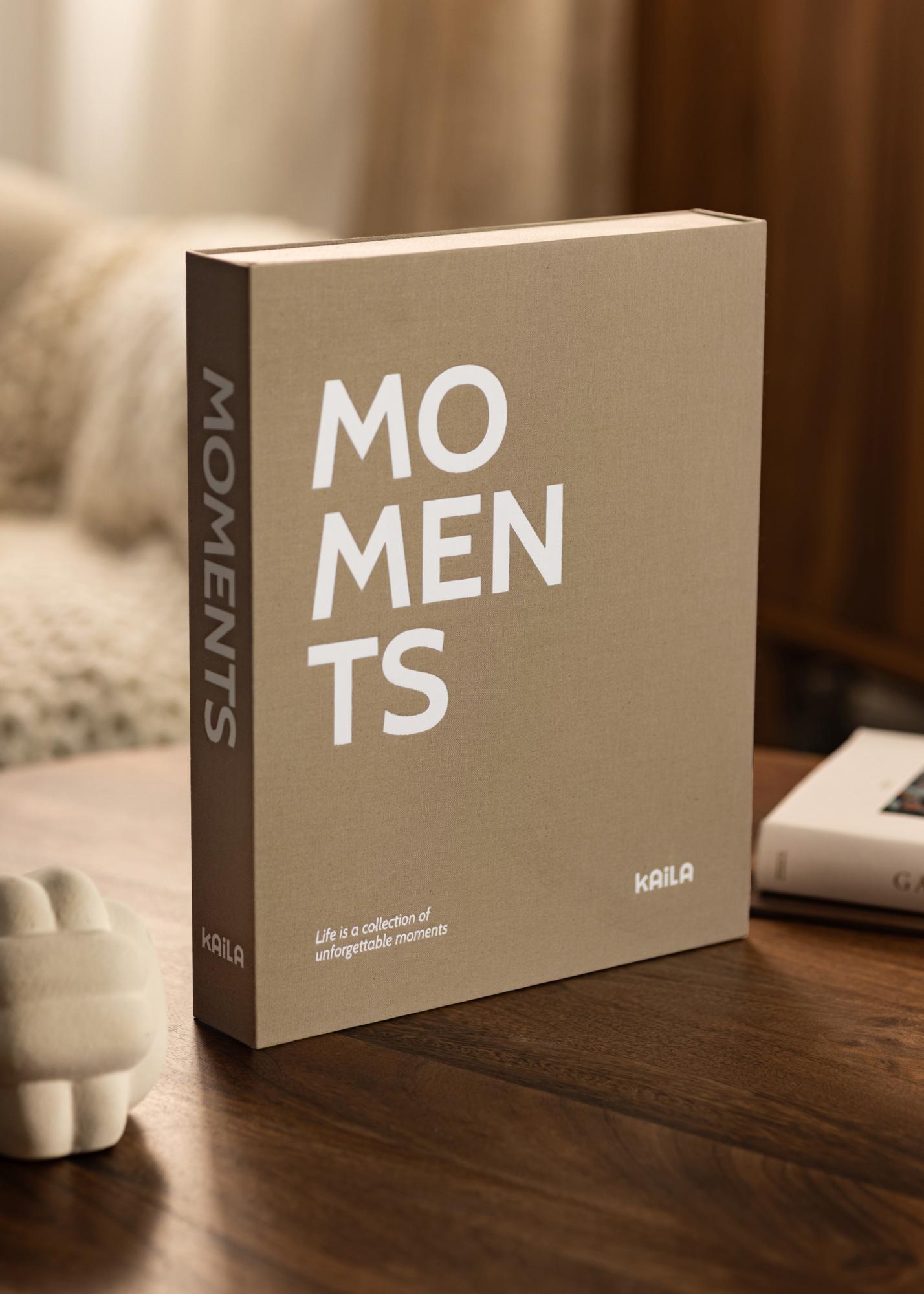 Album fotograficzny jest zaprojektowany jako pudełko, które można otworzyć, aby uzyskać dostęp do zdjęć. Okładka jest ozdobiona szarą tkaniną, co daje luksusowe uczucie. Na przedniej i bocznej stronie znajduje się tekst "MOMENTS". W lewym rogu na górze widnieje piękny podtytuł „Life is a collection of unforgettable moments”.