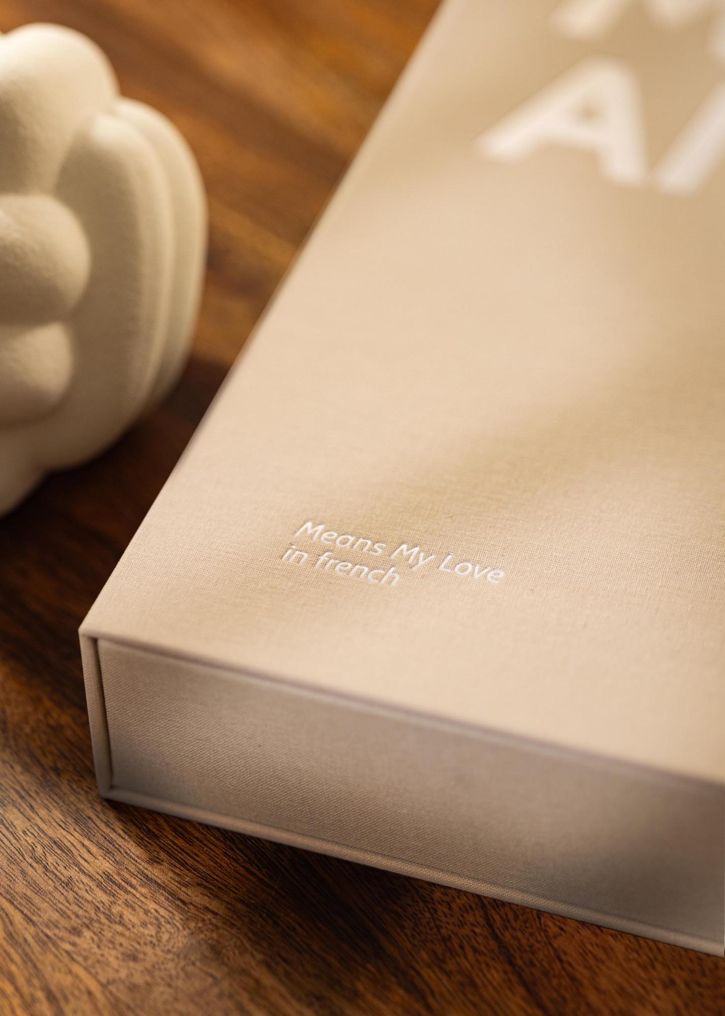 Czy chcesz nowoczesny album fotograficzny, który pełni rolę luksusowego elementu w Twoim wystroju wnętrz? W takim razie ten Album na Stolik Kawowy jest dla Ciebie! Album jest zaprojektowany jako małe pudełko, z ekskluzywną okładką z beżowej tkaniny. Tytuł albumu ”MON AMOUR” dodaje romantycznego akcentu do tego minimalistycznego wyrazu. Podtytuł w lewym rogu albumu brzmi ”Means My Love in French”.
