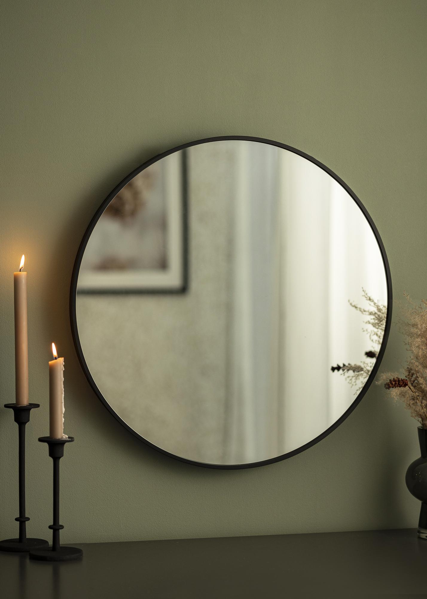 KAILA Round Mirror Edge Black to okrągłe lustro z elegancką cienką metalową ramą w kolorze matowej czerni, co nadaje mu industrialny i modny wygląd. Rama ma – w zależności od rozmiaru – głębokość od 30 do 40 mm, co powoduje, że powierzchnia lustra odstaje nieco od ściany, tworząc efektowny efekt 3D. Głębokość ramy sprawia również, że lustro wydaje się solidne, zachowując jednocześnie minimalistyczny wygląd. Idealne okrągłe lustro do umieszczenia w dowolnym pomieszczeniu, gdzie chcesz dodać funkcjonalność i stylowy szwedzki design!