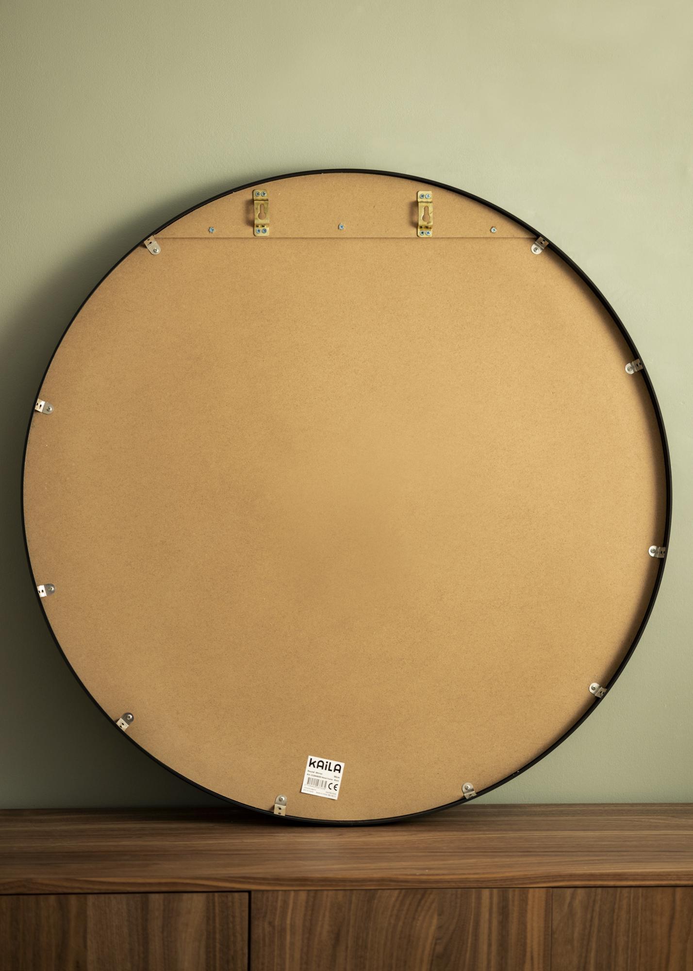 To lustro jest dostępne w różnych rozmiarach, z czego ta wersja ma średnicę 90 cm. Na tyle lustra znajdują się dwa wstępnie zamontowane uchwyty ścienne, co zapewnia prosty i stabilny montaż na ścianie. Odpowiednie śruby i kołki są dołączone.