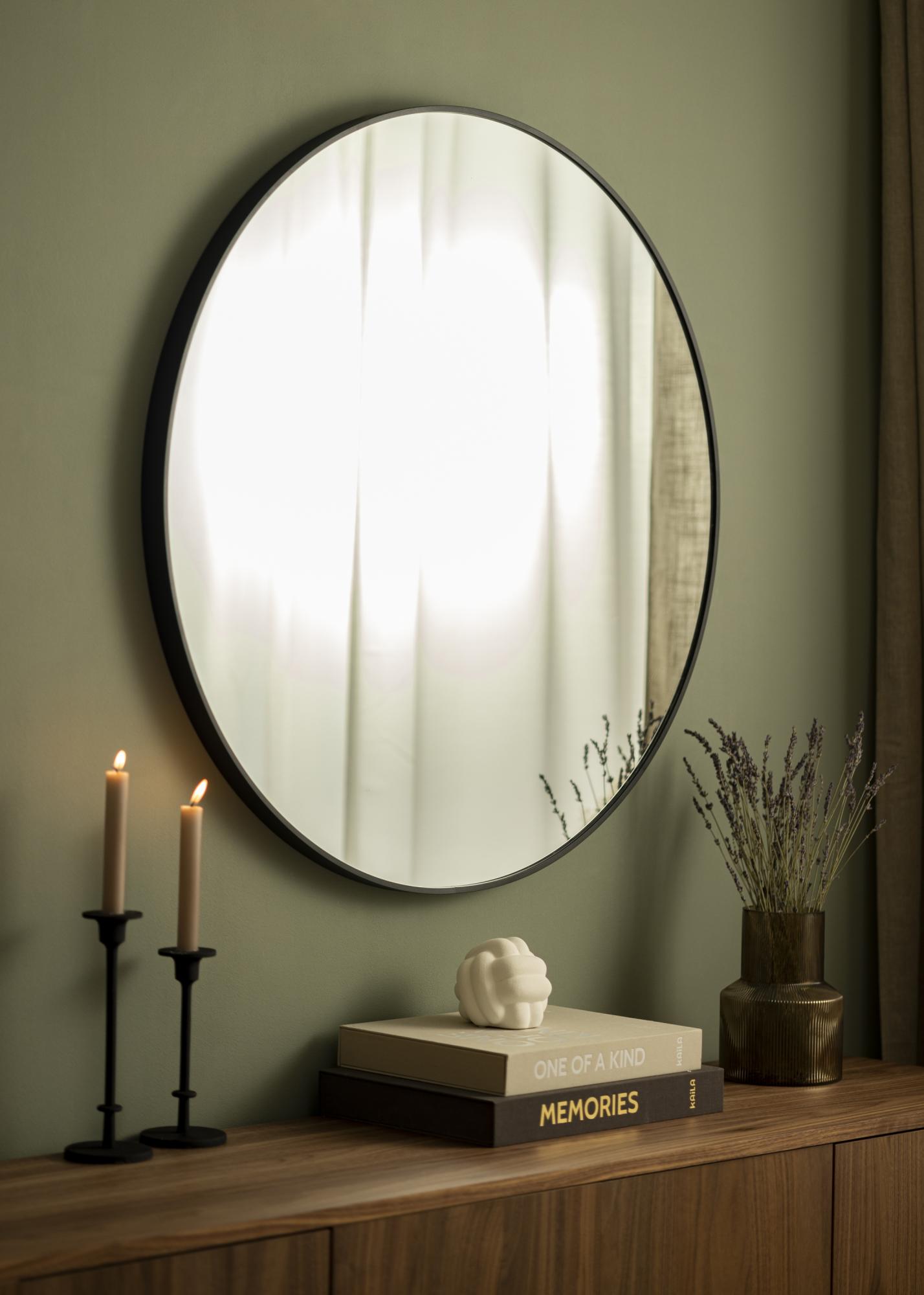 KAILA Round Mirror Edge Black to okrągłe lustro ze stylową cienką metalową ramą w kolorze matowa czerń, co nadaje mu industrialny i modny wygląd. Rama ma – w zależności od rozmiaru – głębokość od 30 do 40 mm, co powoduje, że szkło lustra odstaje nieco od ściany, tworząc efektowny efekt 3D. Głębokość ramy sprawia także, że lustro wydaje się solidne, a jednocześnie zachowuje minimalistyczny charakter. Doskonałe okrągłe lustro do umieszczenia w dowolnym pomieszczeniu, w którym chcesz dodać funkcję i elegancką szwedzką projekt.