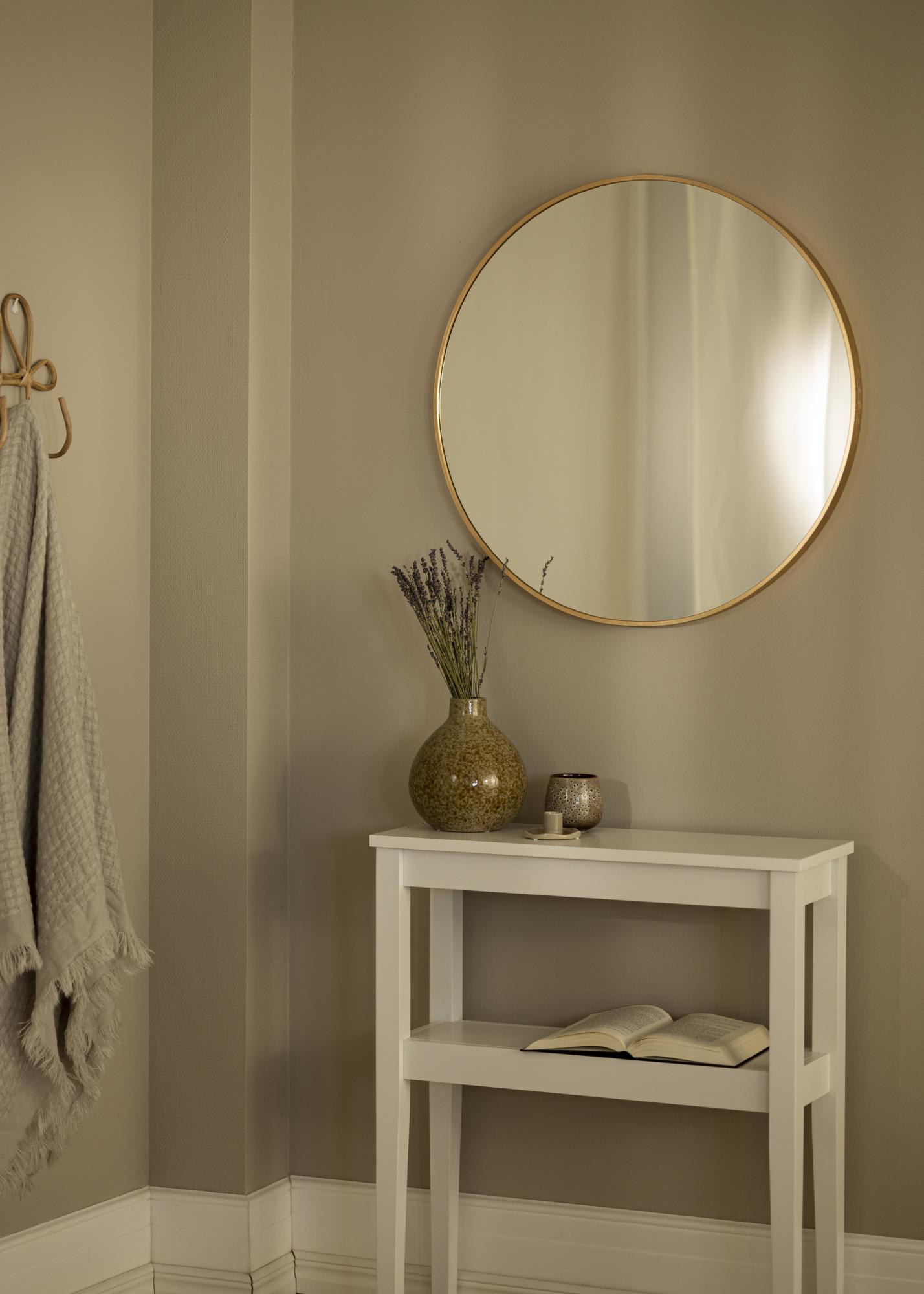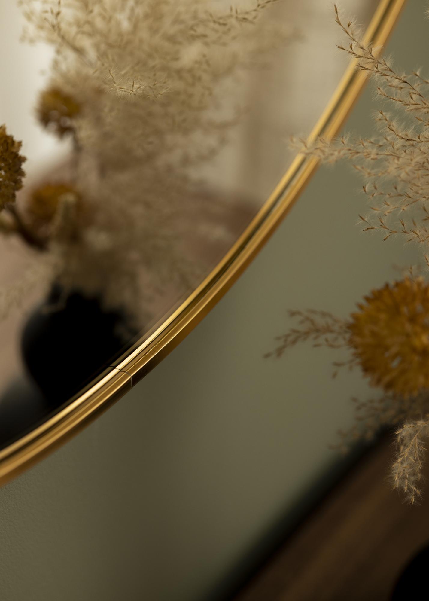 Okrągłe lustro w eleganckim szwedzkim stylu z metalową ramą w pięknym złocistym wykończeniu. Rama ma szczotkowaną powierzchnię, co nadaje jej pięknemu złotemu kolorowi nieco matowy wygląd. Rama jest także modnie cienka, ale jednocześnie – w zależności od rozmiaru – ma głębokość od 30 do 40 mm, co sprawia, że odstaje nieco od ściany, tworząc efektowny efekt 3D. Głębokość ramy sprawia, że lustro wydaje się solidne i wytrzymałe, nie odbierając przy tym minimalistycznego charakteru lustra.