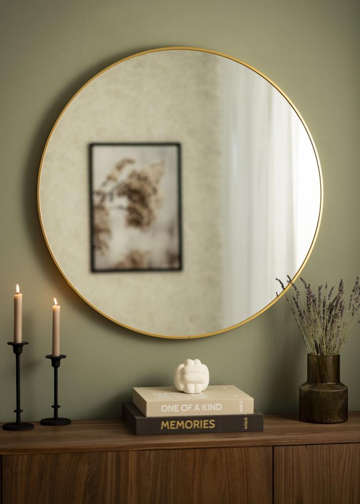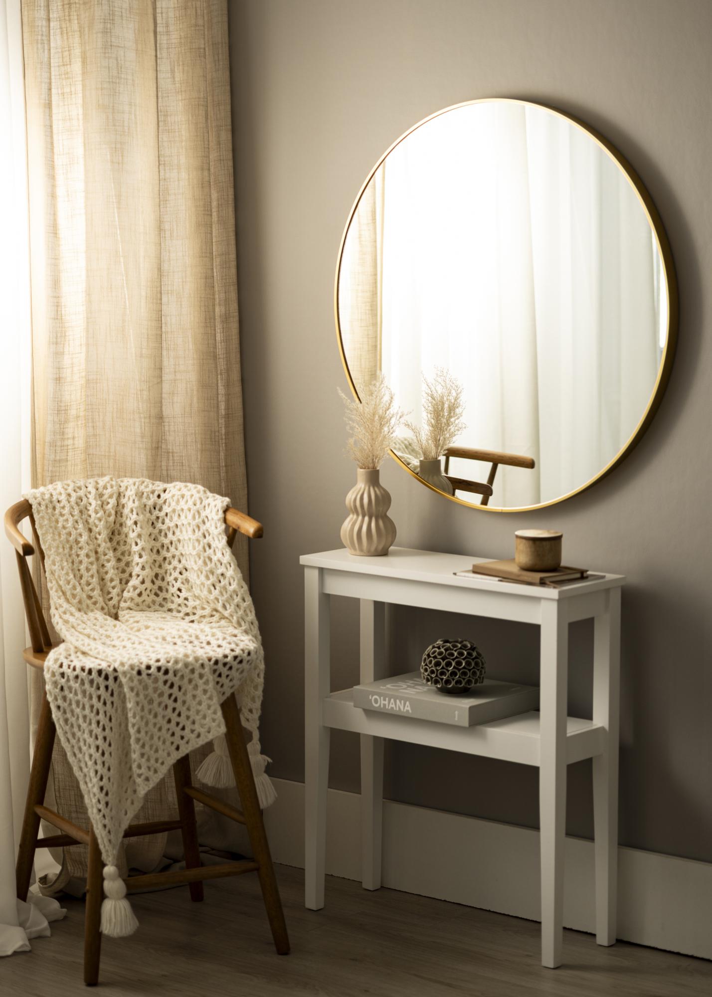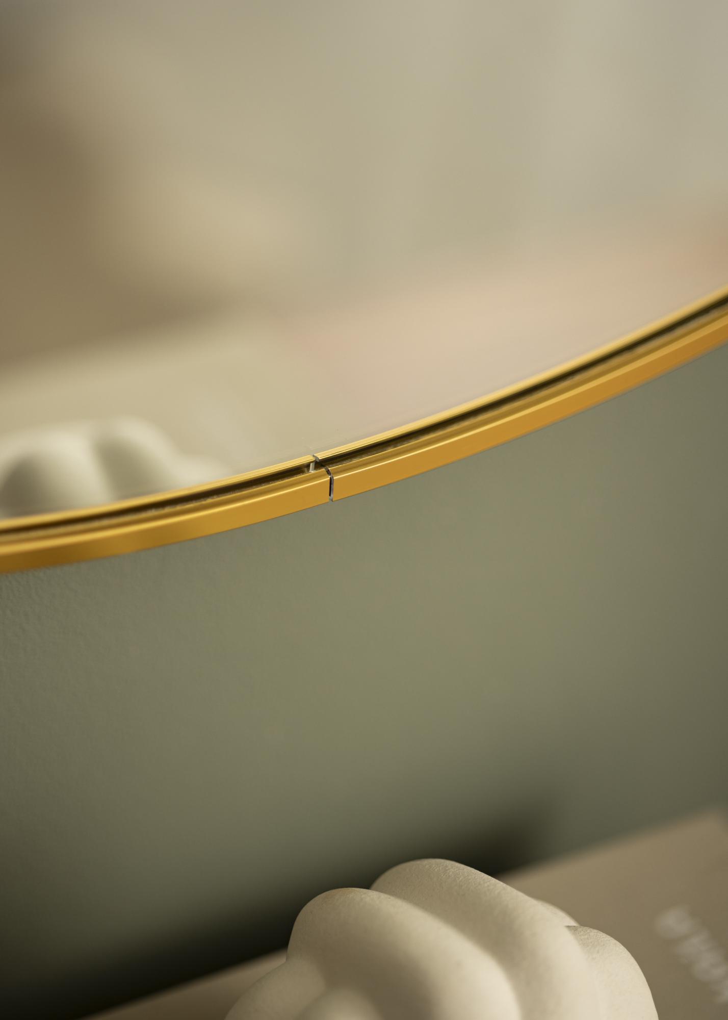 Okrągłe lustro w stylowym szwedzkim designie z metalową ramą w pięknym złotym wykończeniu. Rama ma szczotkowaną powierzchnię, co nadaje pięknej złotej barwie nieco bardziej matowy wygląd. Rama jest również modnie cienka, ale jednocześnie – w zależności od rozmiaru – ma głębokość od 30-40 mm, co sprawia, że odstaje od ściany, tworząc oszałamiający efekt 3D. Głębokość ramy sprawia także, że lustro wydaje się solidne i trwałe, nie tracąc przy tym minimalistycznego charakteru.