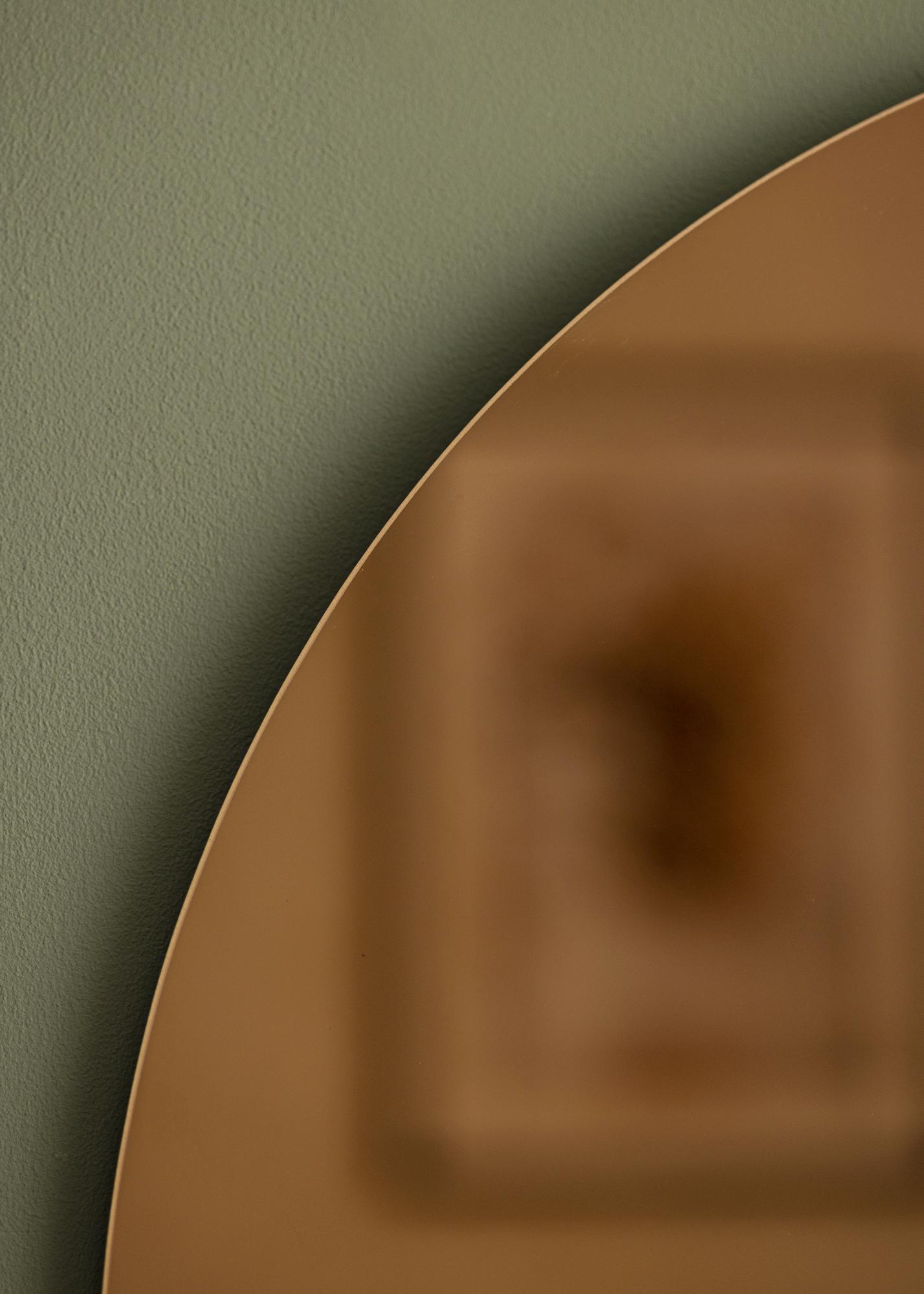 KAILA Okrągłe Lustro Różowe Złoto to bardzo dekoracyjne okrągłe lustro z różowozłotym szkłem lustrzanym. Lustro jest także bardzo cienkie i ma minimalistyczny design bez ramy, co czyni je naprawdę modnym i stylowym elementem wyposażenia wnętrz.