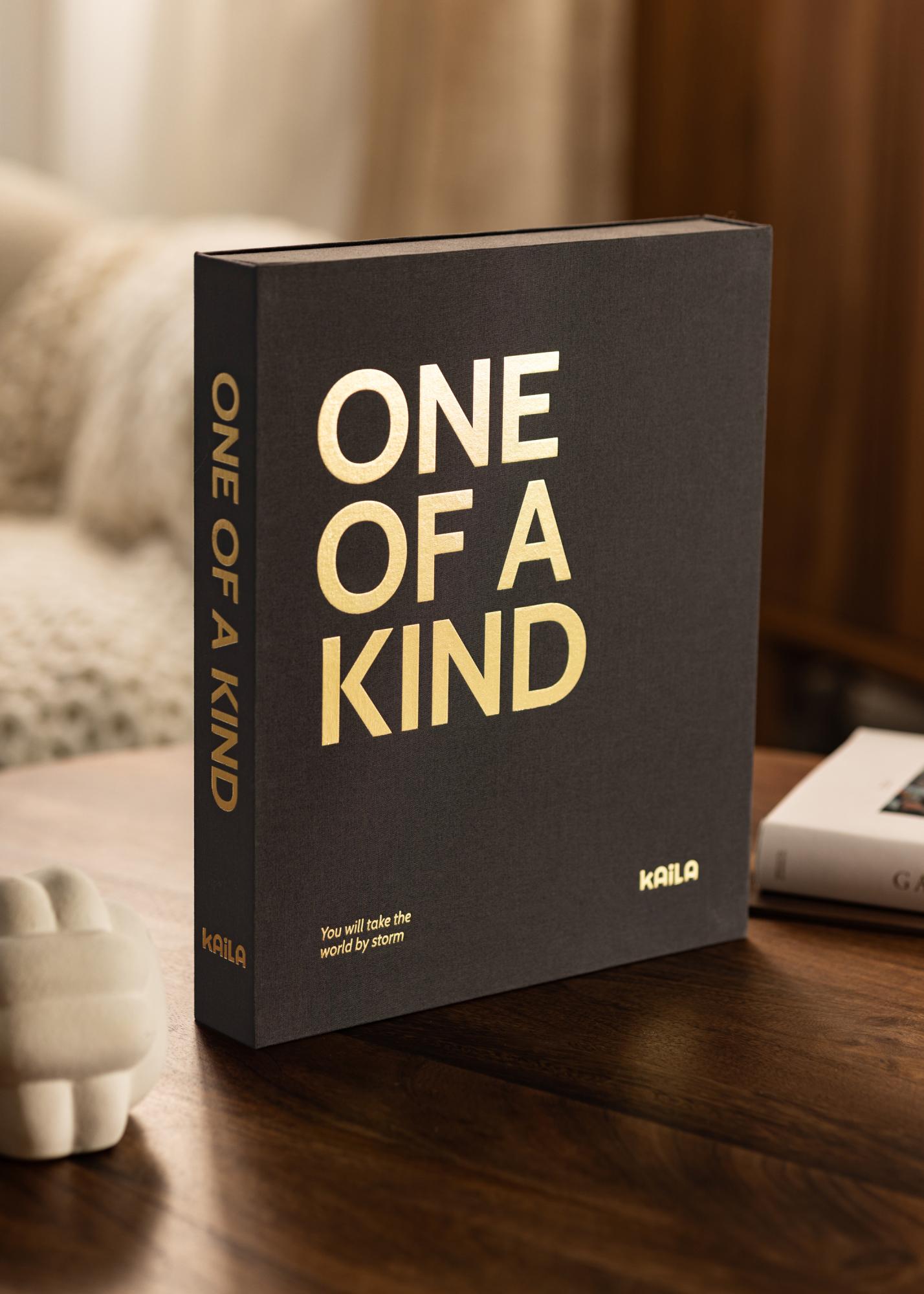 Wywołaj swoje zdjęcia i przechowuj je w pięknym Albumie na Zdjęcia do Stolika Kawowego! Ten fotoalbum od KAILA jest pokryty czarnym materiałem i zaprojektowany jak luksusowe pudełko, co naprawdę nadaje mu ekskluzywny charakter. Najlepsze jest to, że ten fotoalbum jest równie elegancki jako element dekoracyjny! Na przedniej stronie albumu foto znajduje się tytuł ”ONE OF A KIND” wydrukowany dużymi białymi literami oraz podtytuł ”You will take the world by storm”, co czyni ten album idealnym na piękne zdjęcia z dzieciństwa lub jako prezent dla kogoś wyjątkowego, lub oczywiście dla twoich własnych wspaniałych wspomnień fotograficznych.