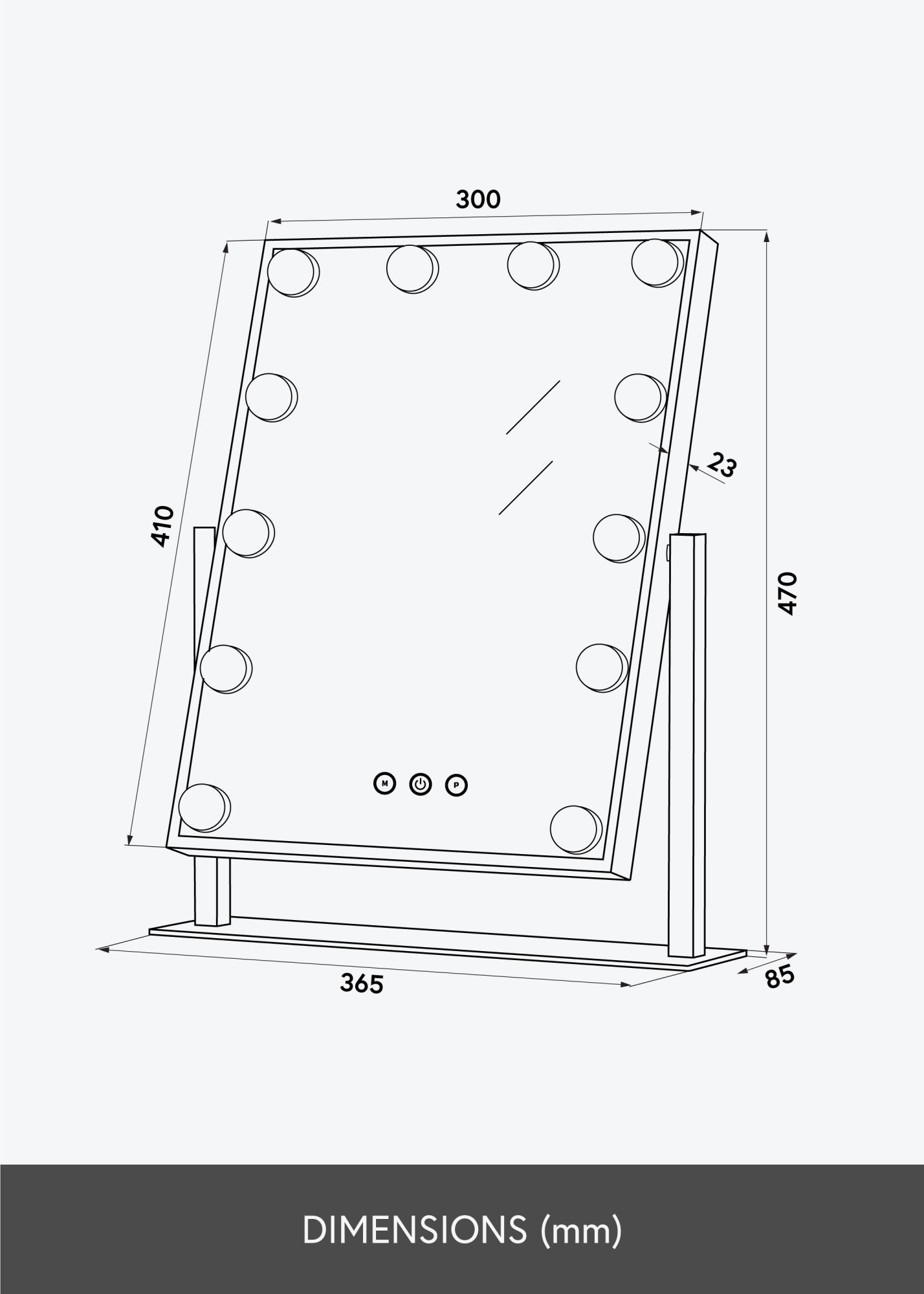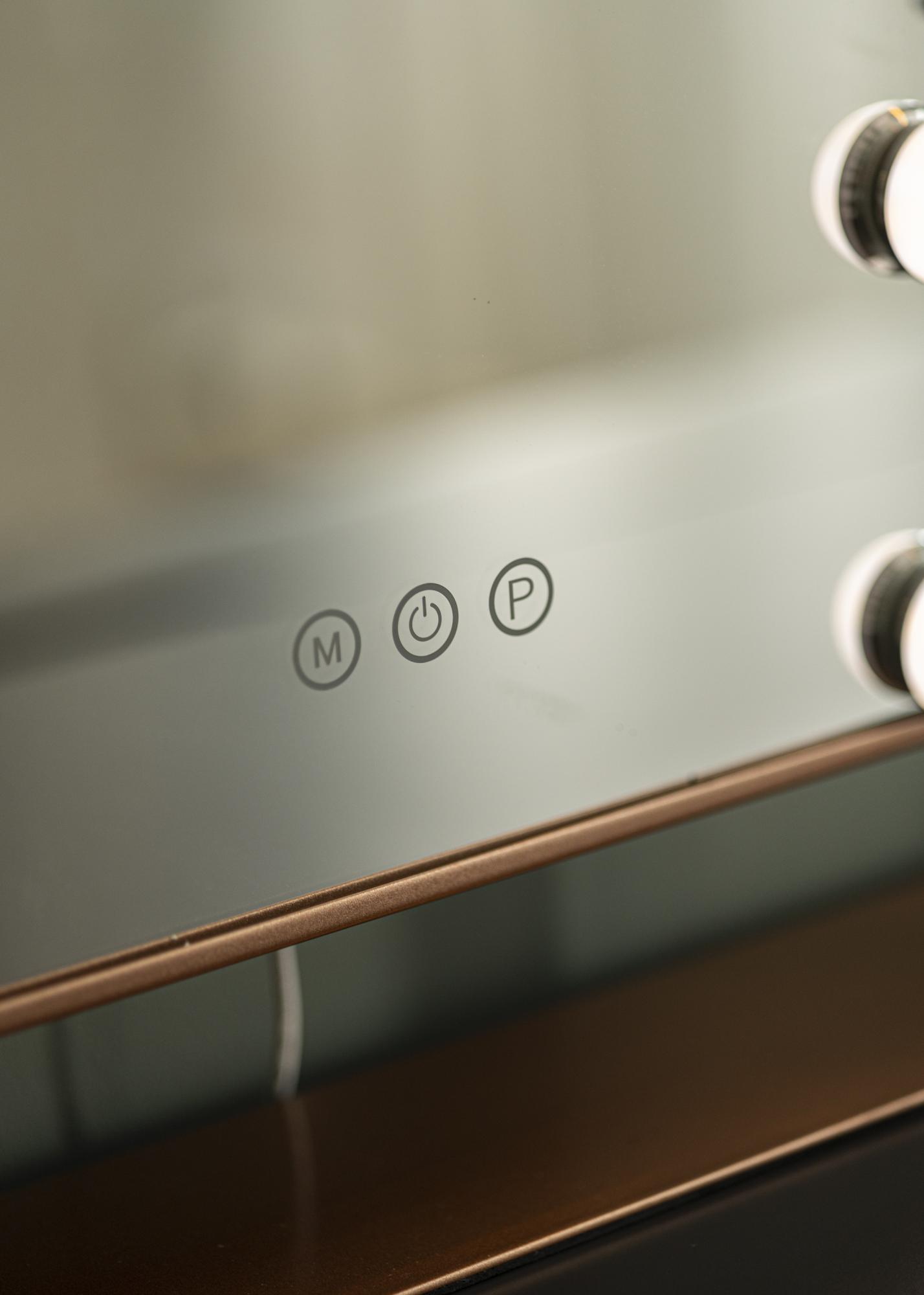 To lustro ma oświetlenie LED, w postaci 12 większych lamp, które pięknie otaczają powierzchnię lustrzaną. Lustro zapalasz jednym z przycisków dotykowych z przodu lustra. Istnieją również przyciski dotykowe do regulacji jasności i temperatury barwowej. Przycisk oznaczony ”M” reguluje temperaturę barwową, a przycisk oznaczony ”P” ustawia jasność. Podłączenie lustra do prądu odbywa się za pomocą wtyczki.