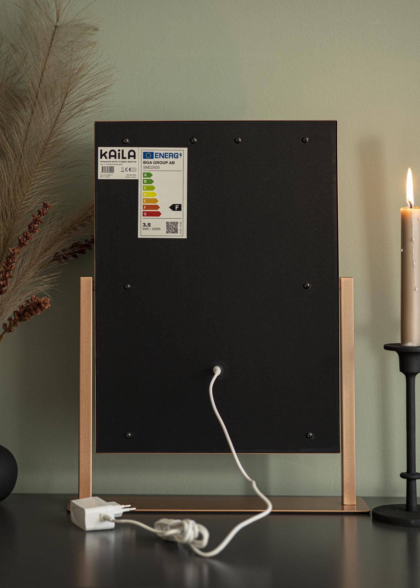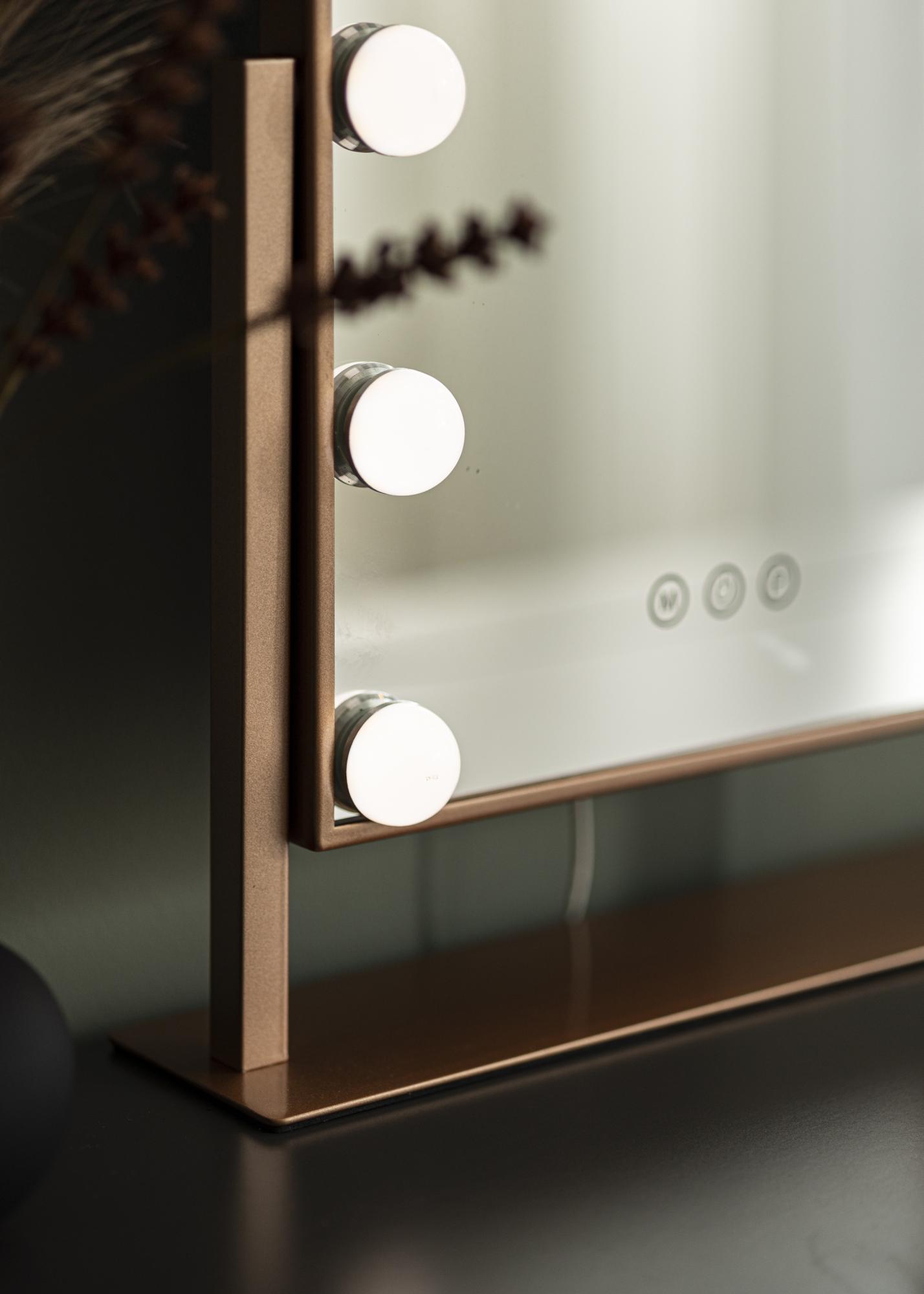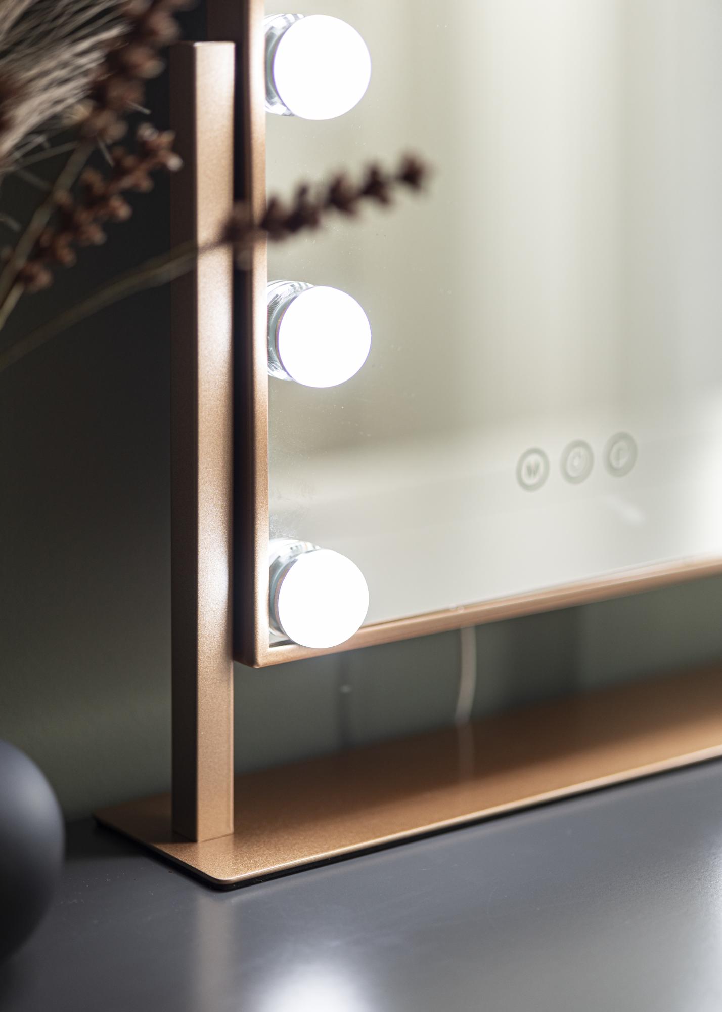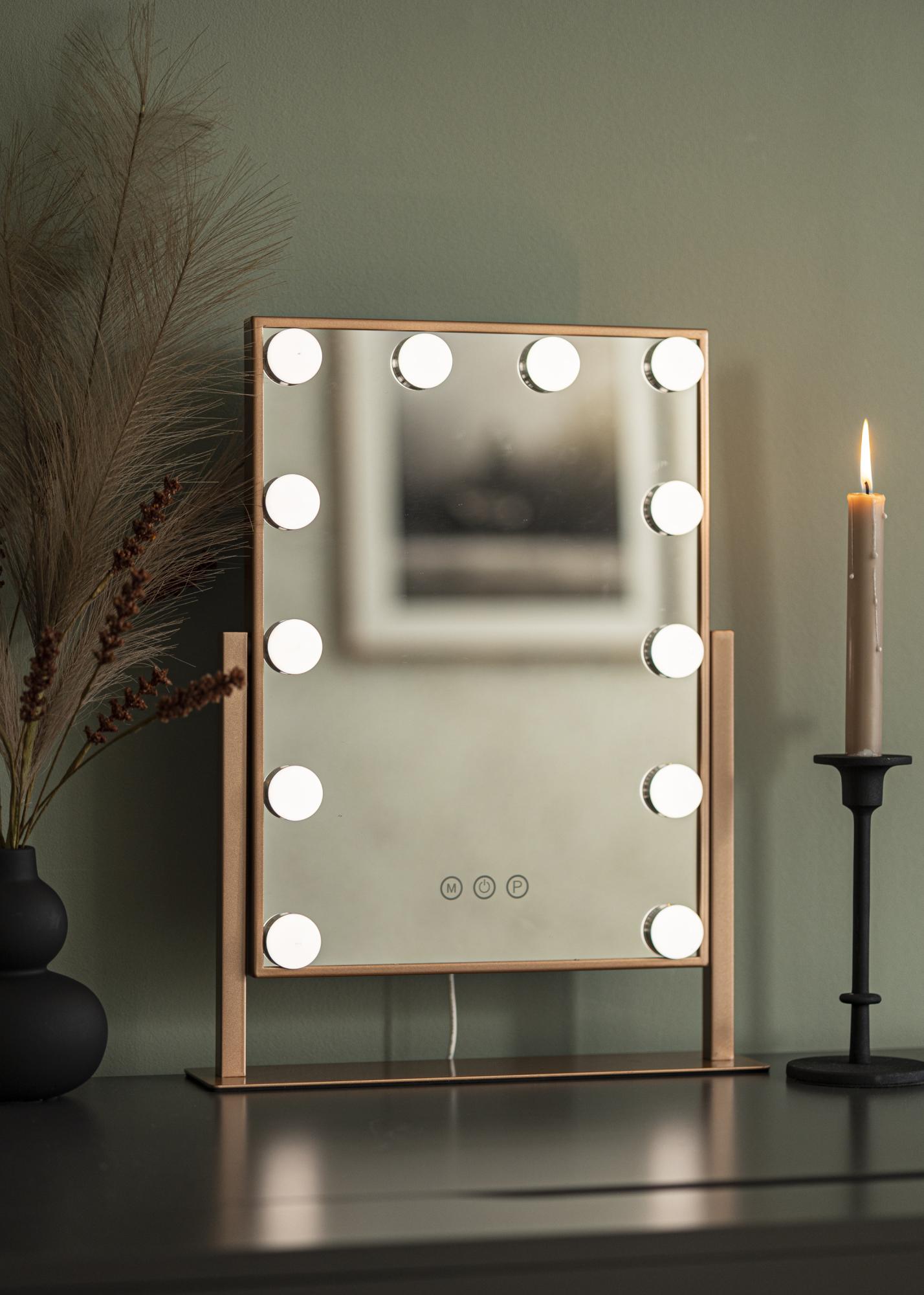 To jest bardziej kompaktowe lustro do makijażu z 30x41 cm powierzchnią lustrzaną, zintegrowanym oświetleniem i eleganckim odcieniem różowego złota. Lustro ma stylowy stojak, co sprawia, że można je łatwo umieścić na toaletce, komodzie lub stoliku bocznym. Aby ułatwić sobie przeglądanie i nakładanie makijażu, lustro można nachylić.