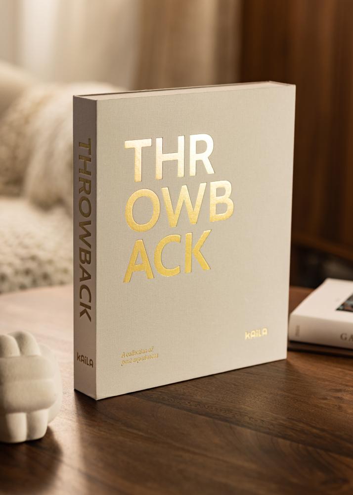 To bardzo modne album fotograficzne, luksusowo zapakowane jako stylowy Coffee Table Book – tak zwany Coffee Table Photo Album. Album fotograficzny jest zaprojektowany jako ekskluzywne pudełko, które otwierasz, aby uzyskać dostęp do zawartości. Okładka jest elegancko obleczona w kremową tkaninę, a złoty nadruk z napisem „THROWBACK” zdobi zarówno przód, jak i grzbiet albumu. To dobrze znane pojęcie wspomnień nadaje albumowi nowoczesny i nieco zadziorny charakter, ponieważ naprawdę odróżnia się od klasycznych stylów albumów. Album ma również podtytuł „A collection of past experiences” umieszczony w lewym dolnym rogu.