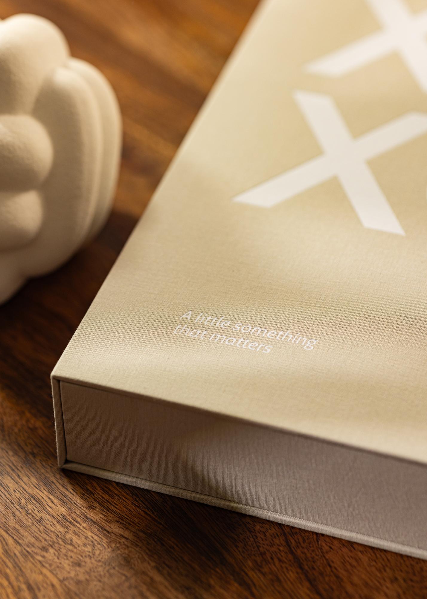 Ten stylowy album fotograficzny jest zaprojektowany jako modna książka na stolik kawowy i dlatego nazywany jest także Foto Album na stolik kawowy. Okładka jest elegancko ubrana w szarą tkaninę, a na przedniej stronie i grzbiecie albumu znajduje się biały nadruk z dobrze znaną pożegnalną formułą „XOXO”, co oznacza całusy i uściski. Ten modny tytuł uzupełnia także podtytuł brzmiący „A little something that matters”, wydrukowany w lewym dolnym rogu albumu. To bardzo elegancki album fotograficzny z oryginalnym i zabawnym designem, który z pewnością wyróżnia się z tłumu.
