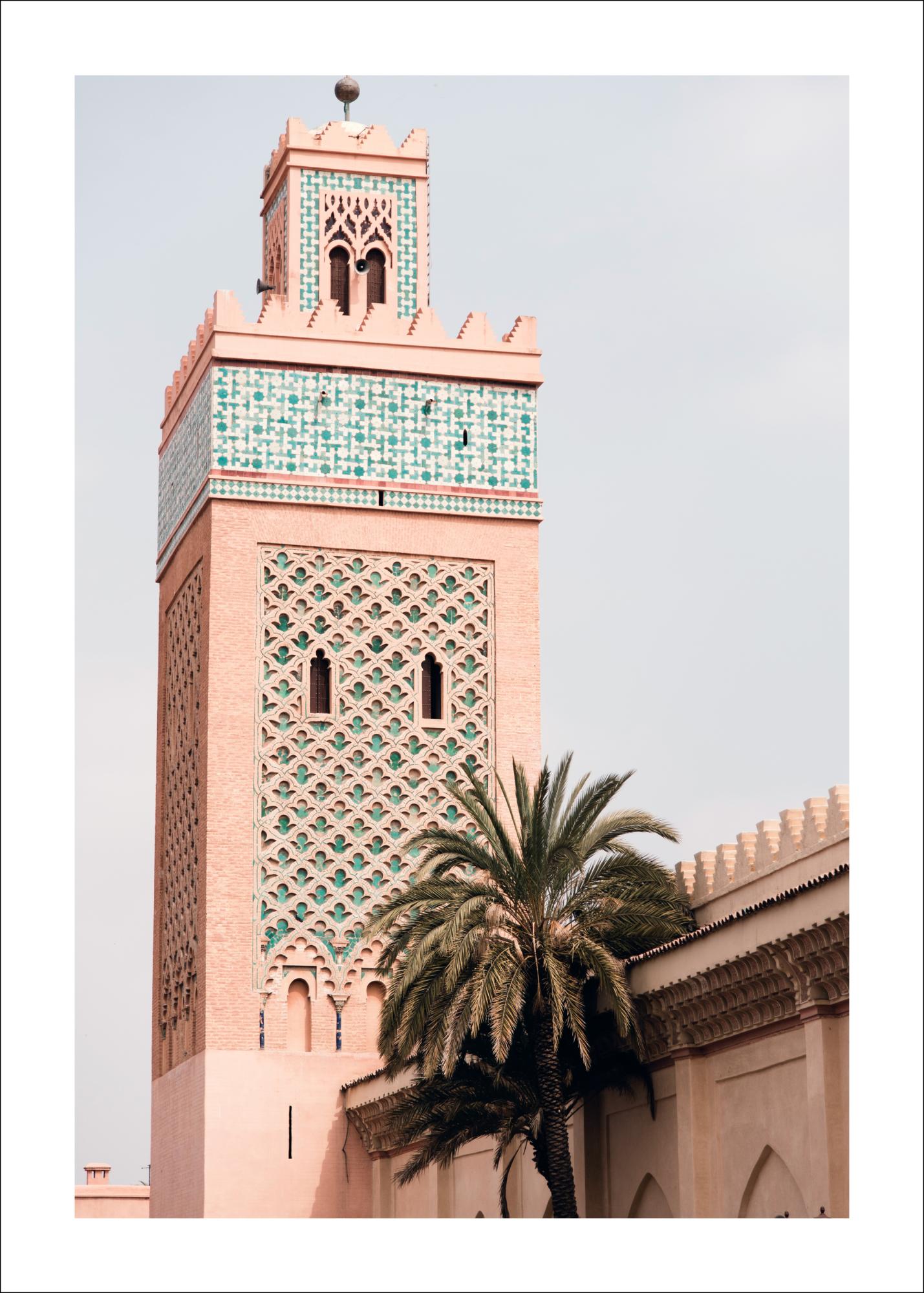 Plakat z widokiem na meczet Kutubiyya w Marrakeszu w świetle dziennym. Piękne kolory brzoskwini i turkusu idealnie komponują się z jasnoniebieskim niebem. Na dole obrazu stoi samotna palma ze swoimi gałęziami, które zakrywają dolną część dachu meczetu. Ta brzoskwiniowa kamienna struktura tworzy poczucie spokoju.